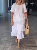 2024 Europa e Estados Unidos transfronteiriça nova primavera e verão feminino algodão e linho casual cor sólida gola redonda manga curta plissada saia longa vestido