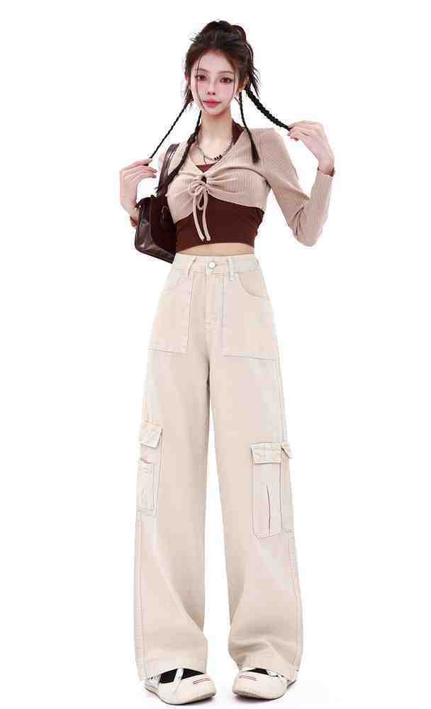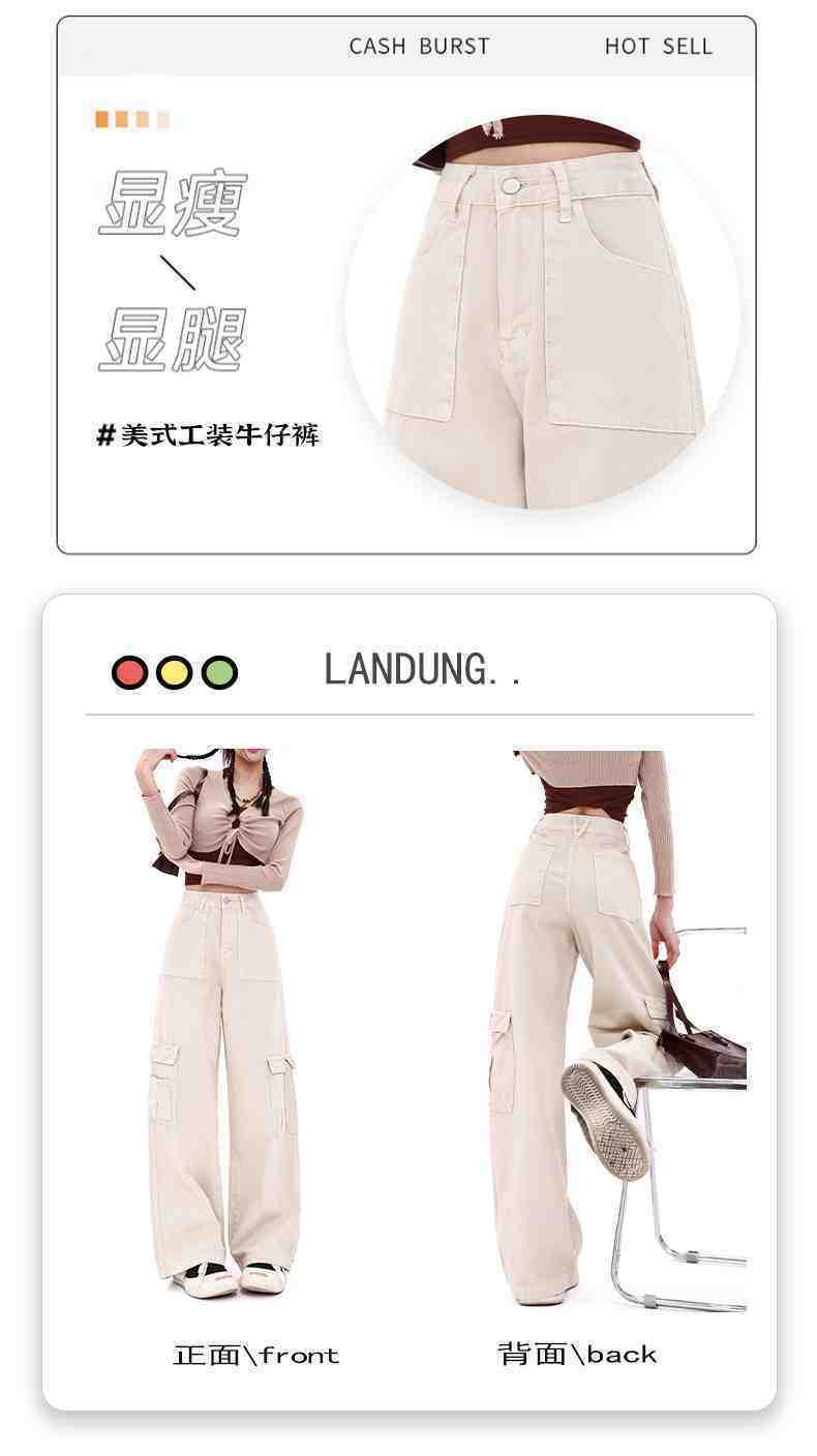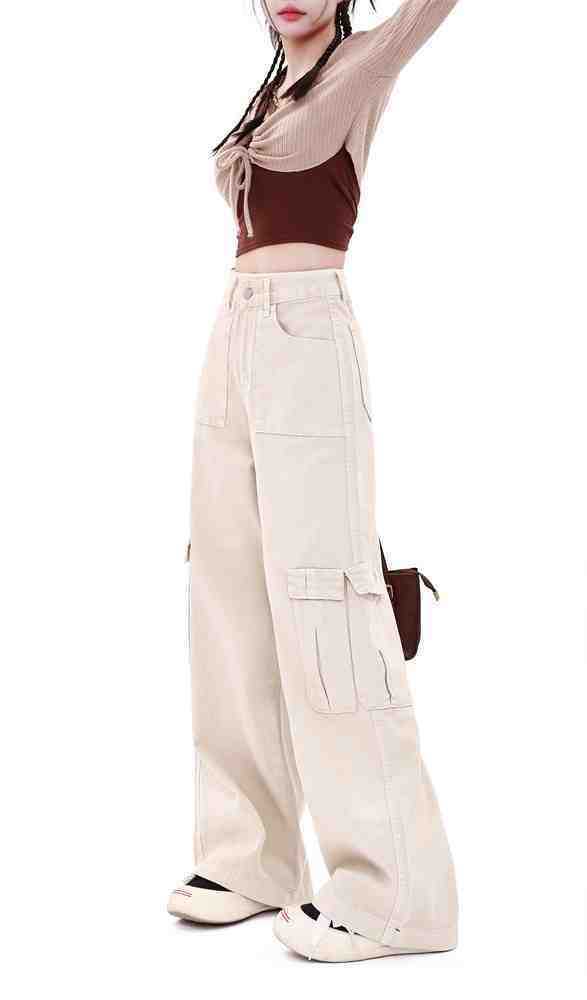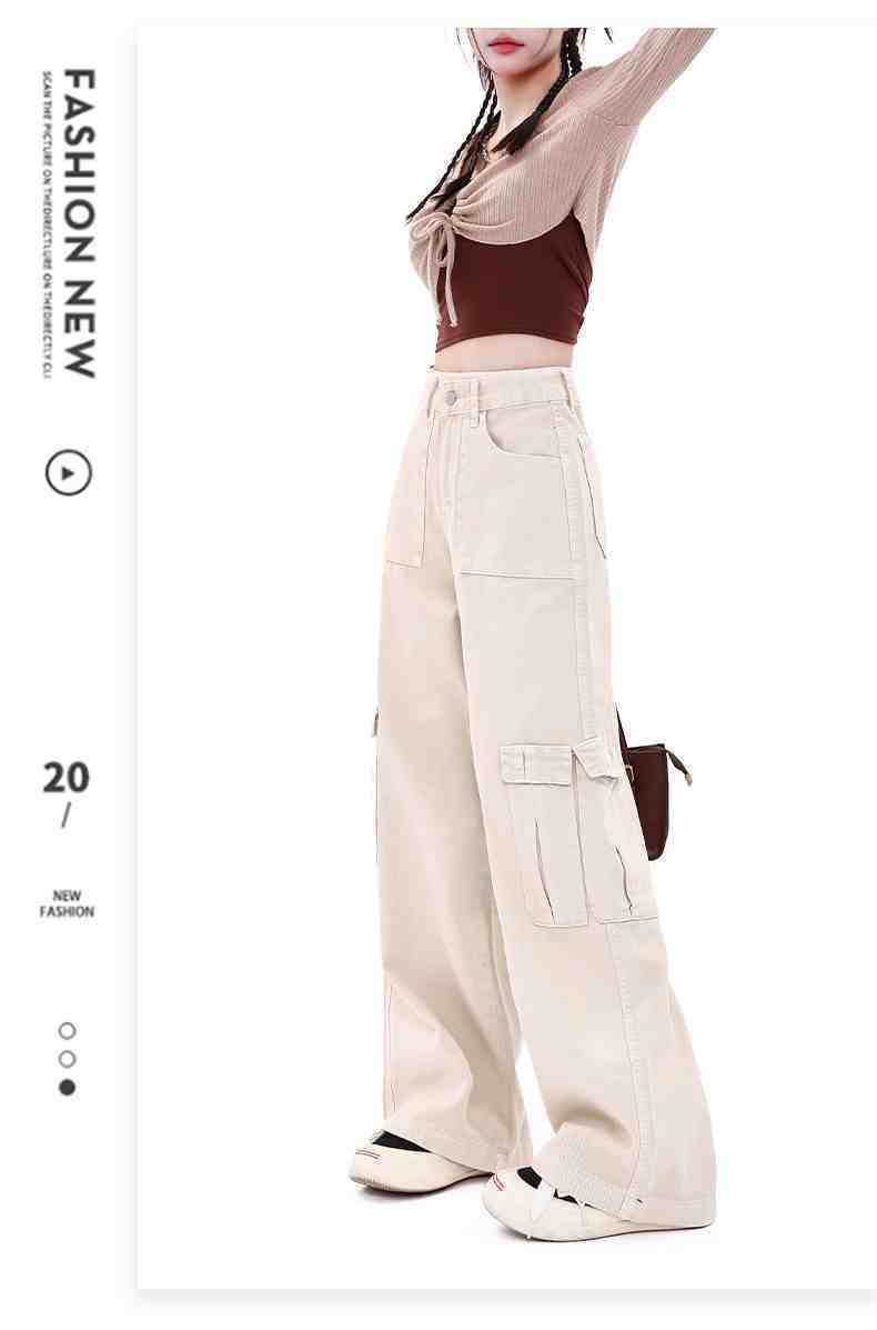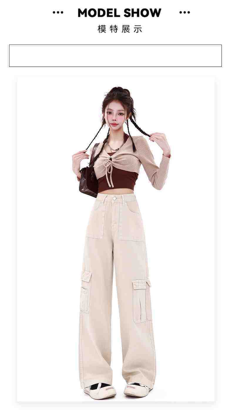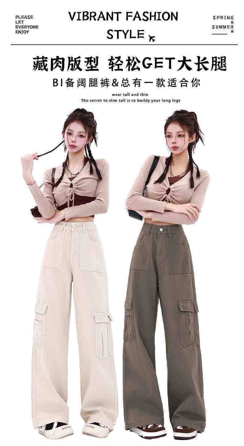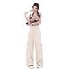 Macacão damasco feminino primavera e verão 2024 novo estilo americano cintura alta solta com vários bolsos emagrecimento perna larga calças casuais