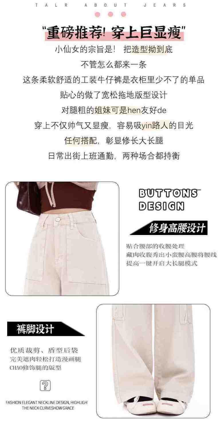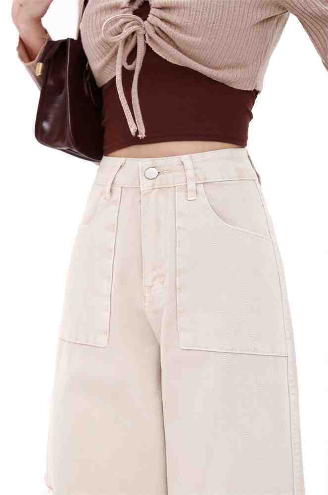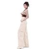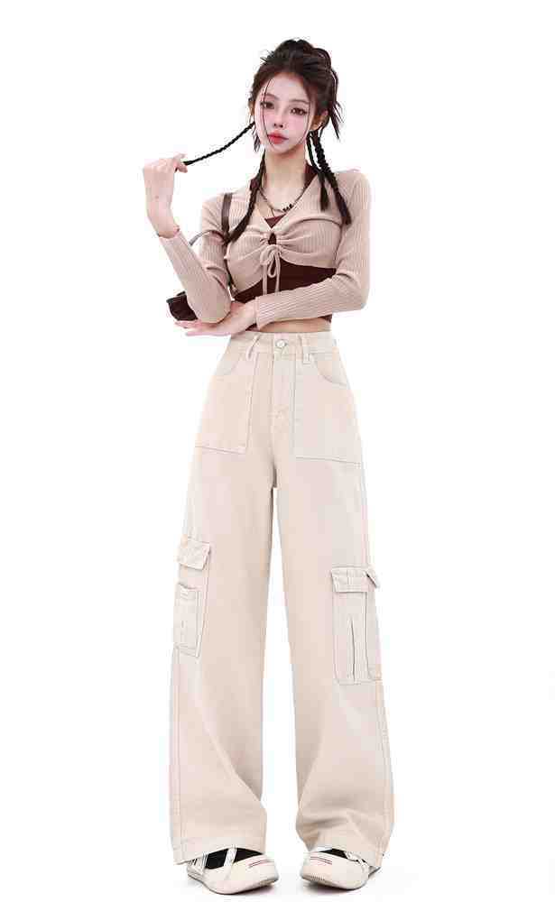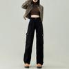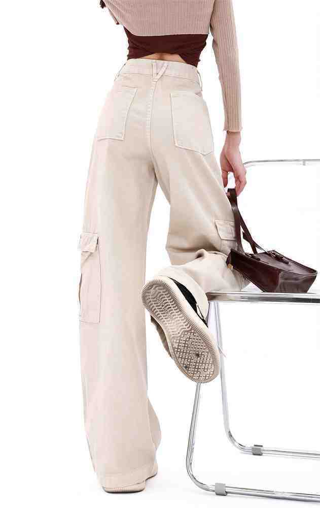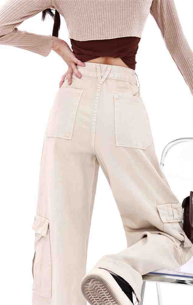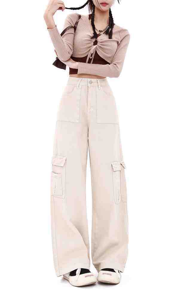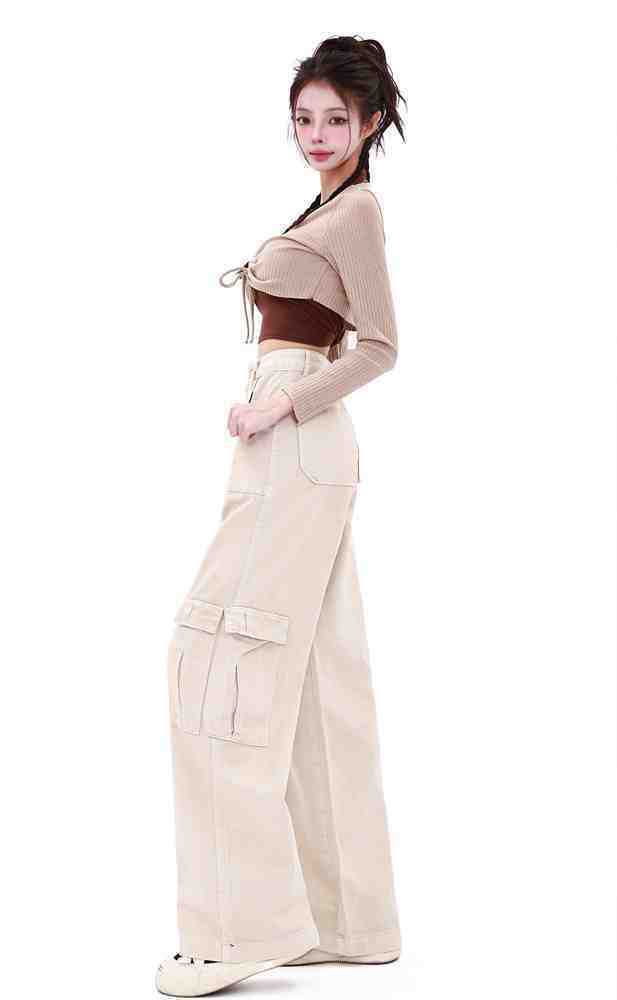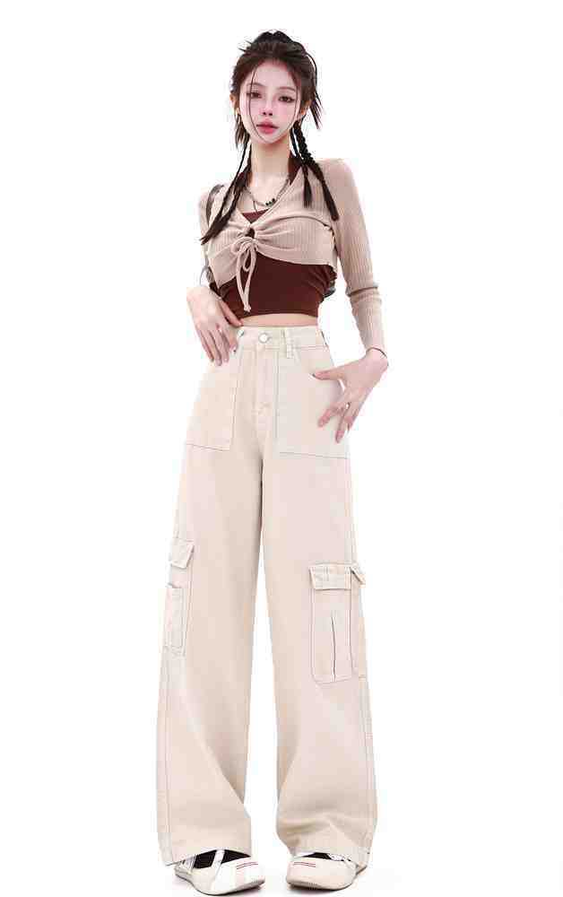 Macacão damasco feminino primavera e verão 2024 novo estilo americano cintura alta solta com vários bolsos emagrecimento perna larga calças casuais
