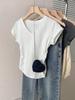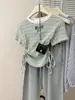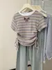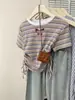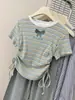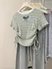 Puro Algodão Ombro Listrado T-Shirt Feminino de manga curta com cordão Design Sense Hollow-out Slim-fit Emagrecimento Curto Niche Top para o Verão