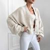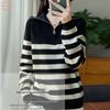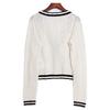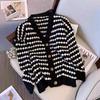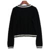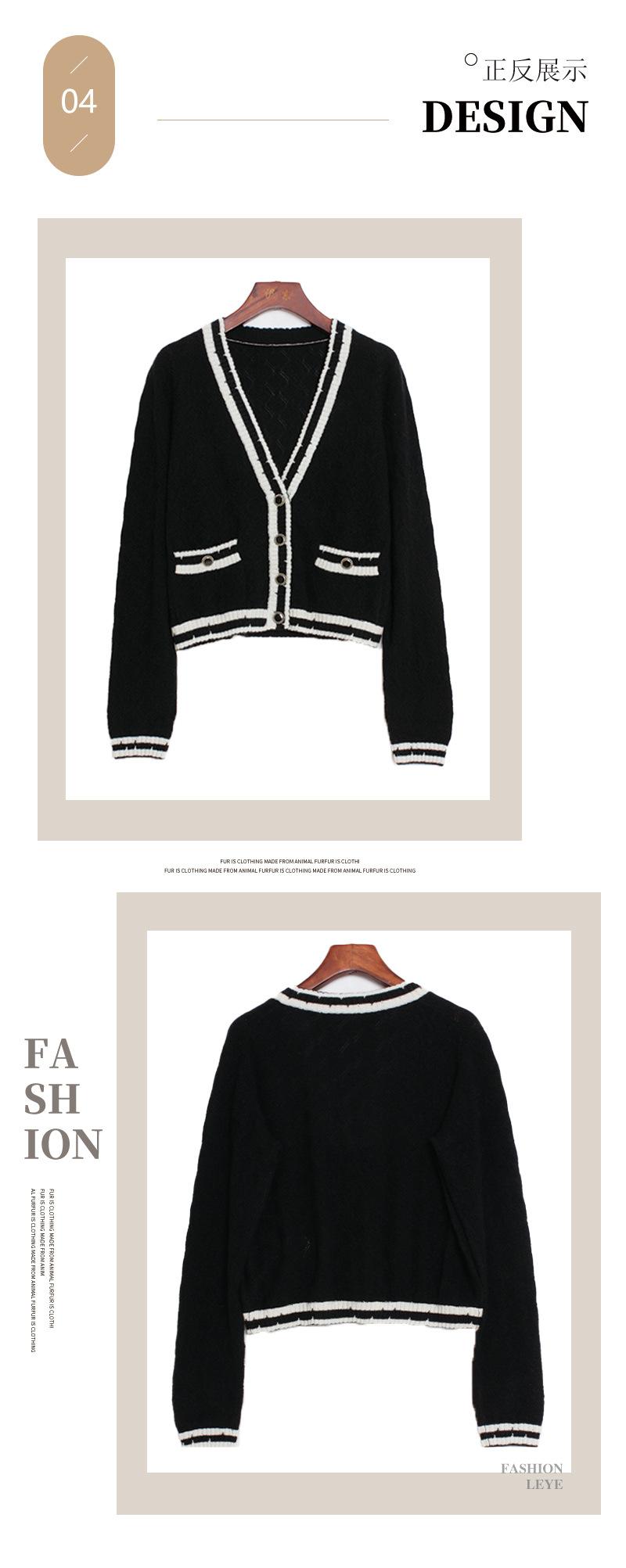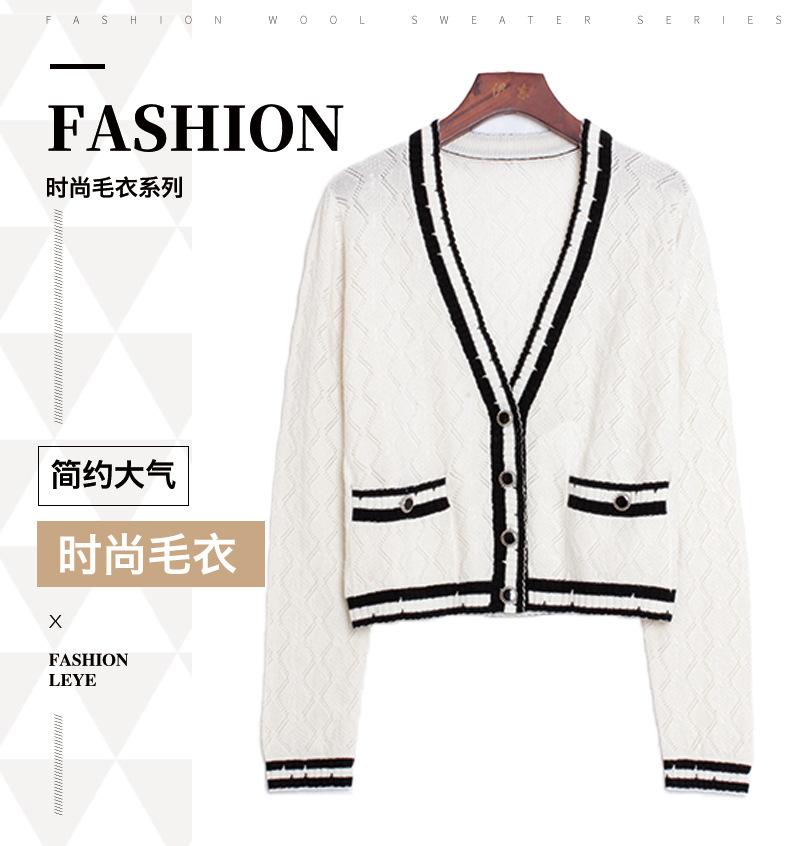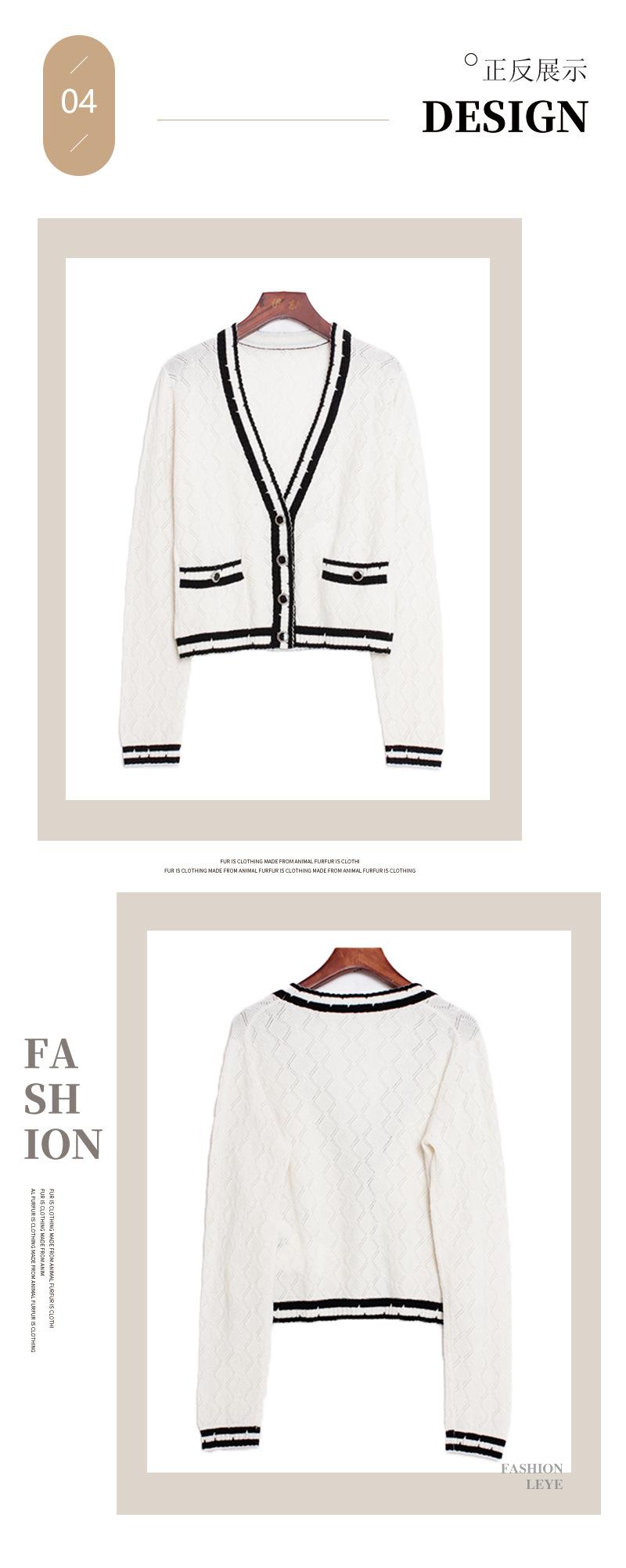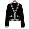 Camisa curta de malha com contraste de cor feminina estilo Xiaoxiang primavera e outono, ar condicionado, suéter de malha com decote em V e bolso de cashmere puro