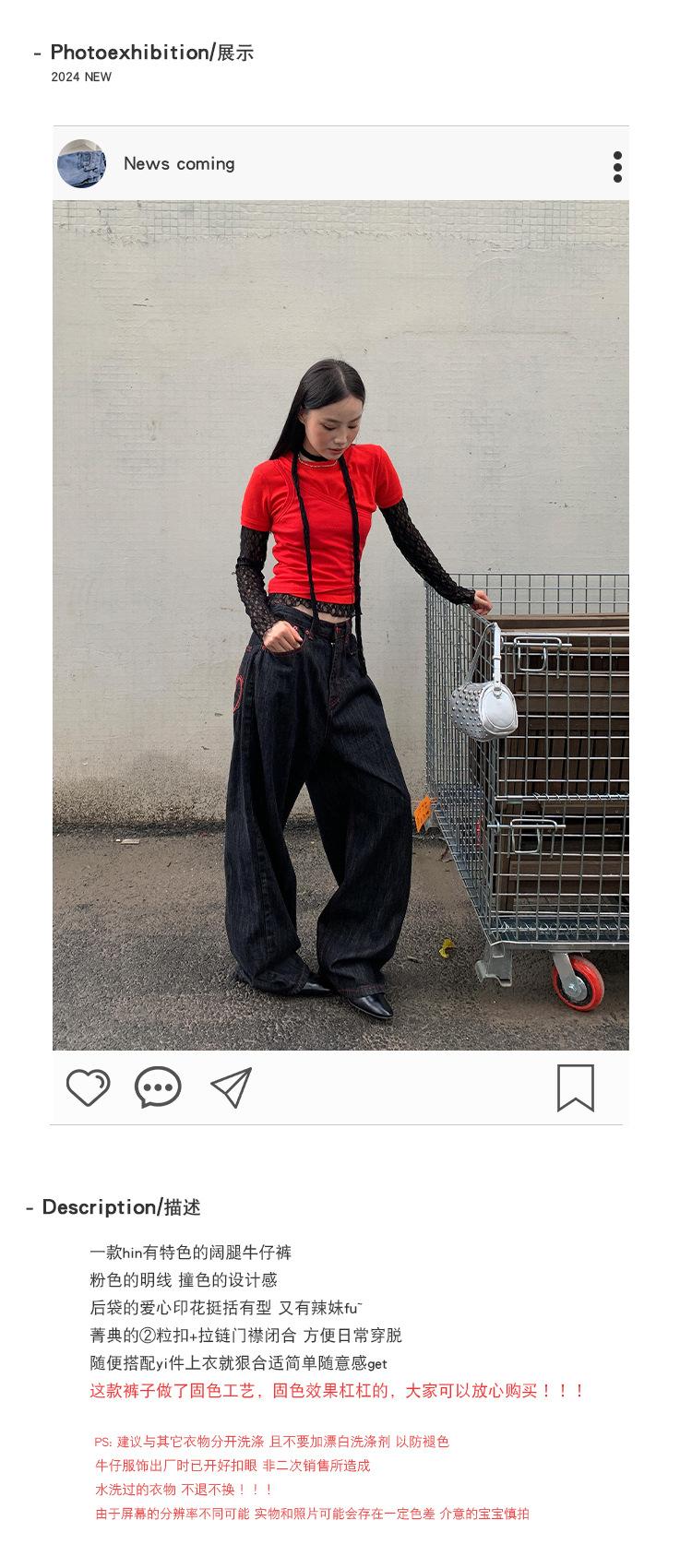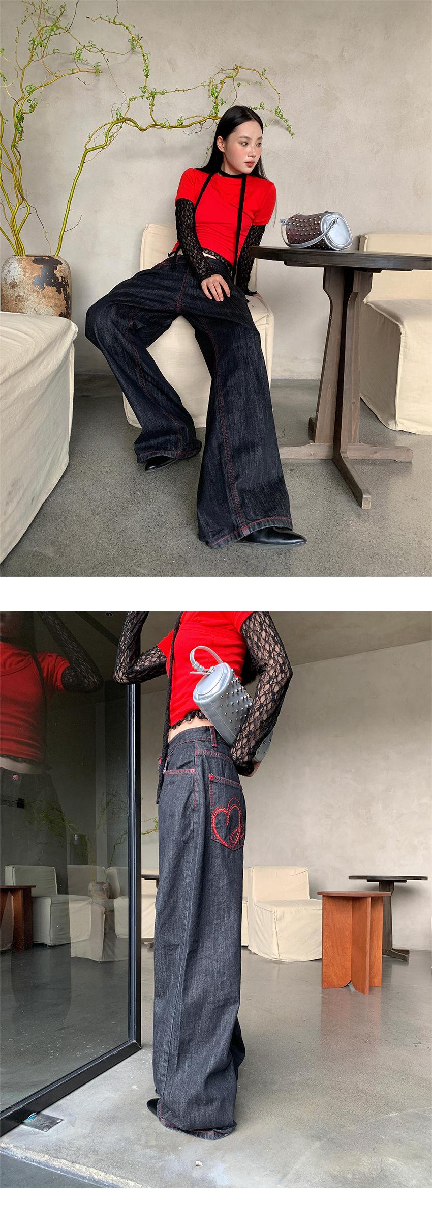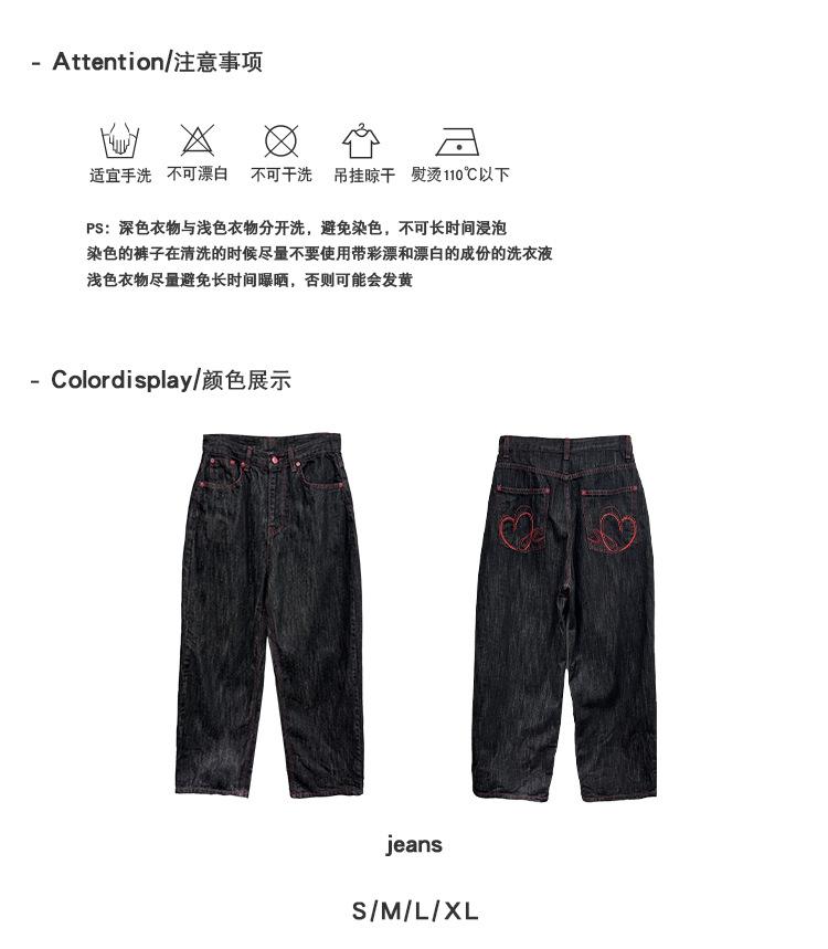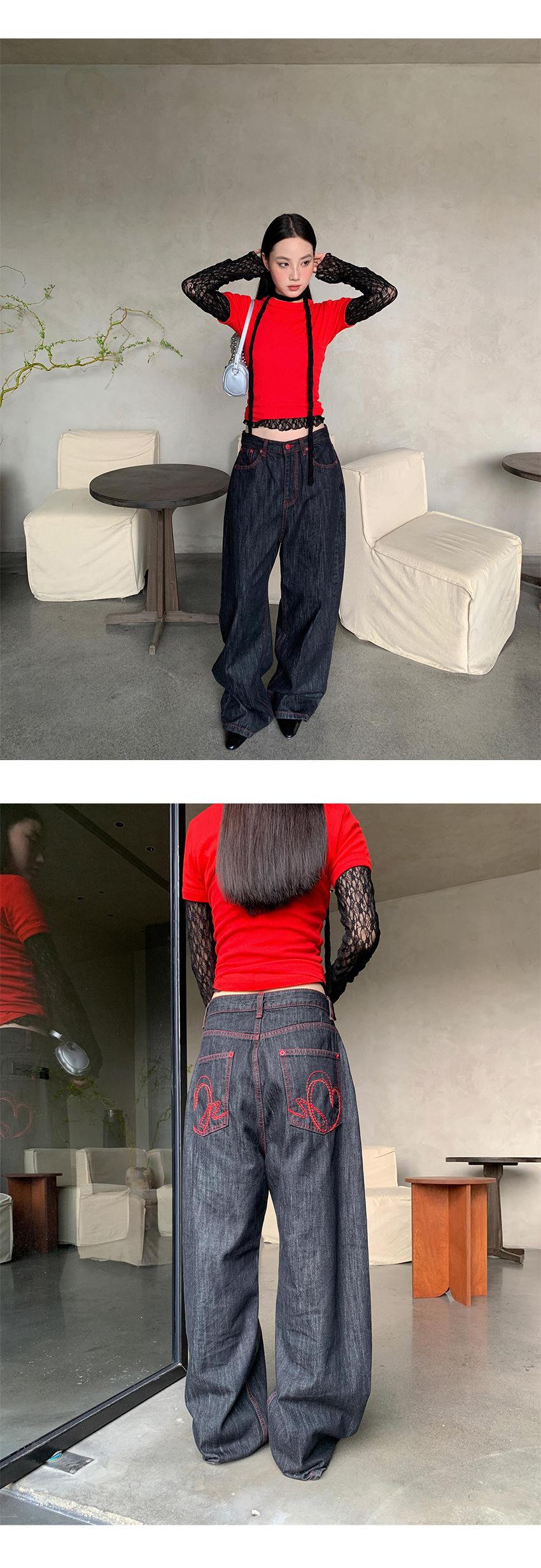 [9Hour] Calça Jeans Bordada Coração Retro Street para Mulheres 2024 Outono Denim Calça Casual para Mulheres Cy1093