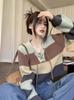 Suéter Lã Listrado Outono Inverno Cor Contraste para Mulheres 2025 Novo Look Solto Emagrecedor Decote V Manga Longa Suéter Curto Base Caxemira