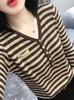 Suéter listrado com decote em V europeu camiseta feminina de manga comprida 2022 outono e inverno novo design sentindo-se magro all-match bottoming top