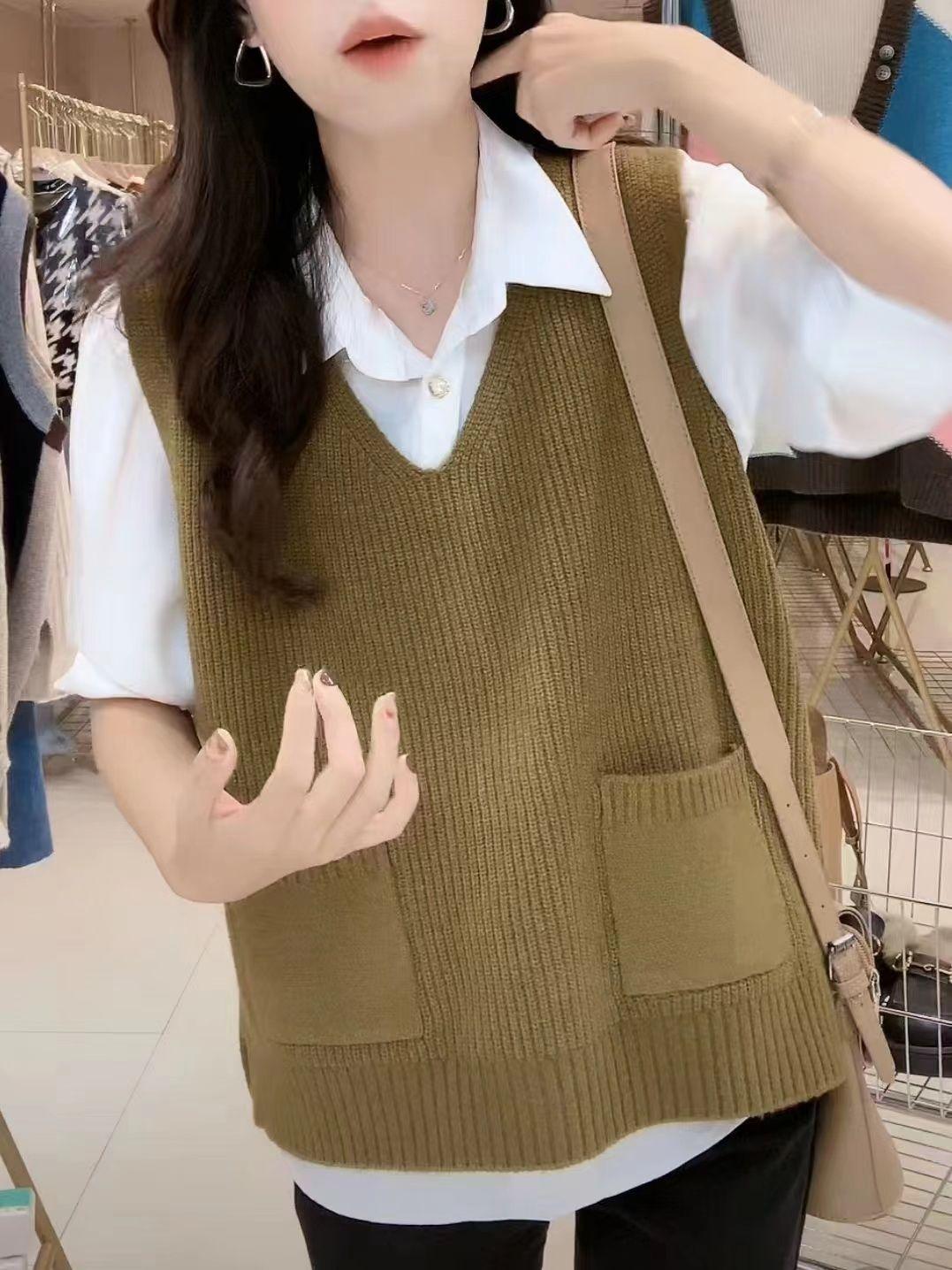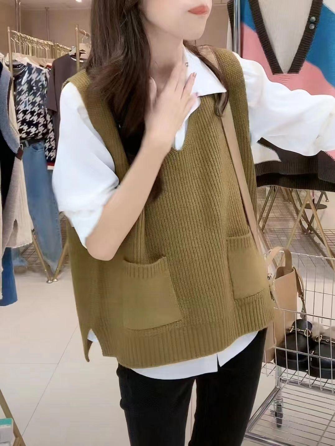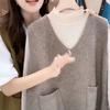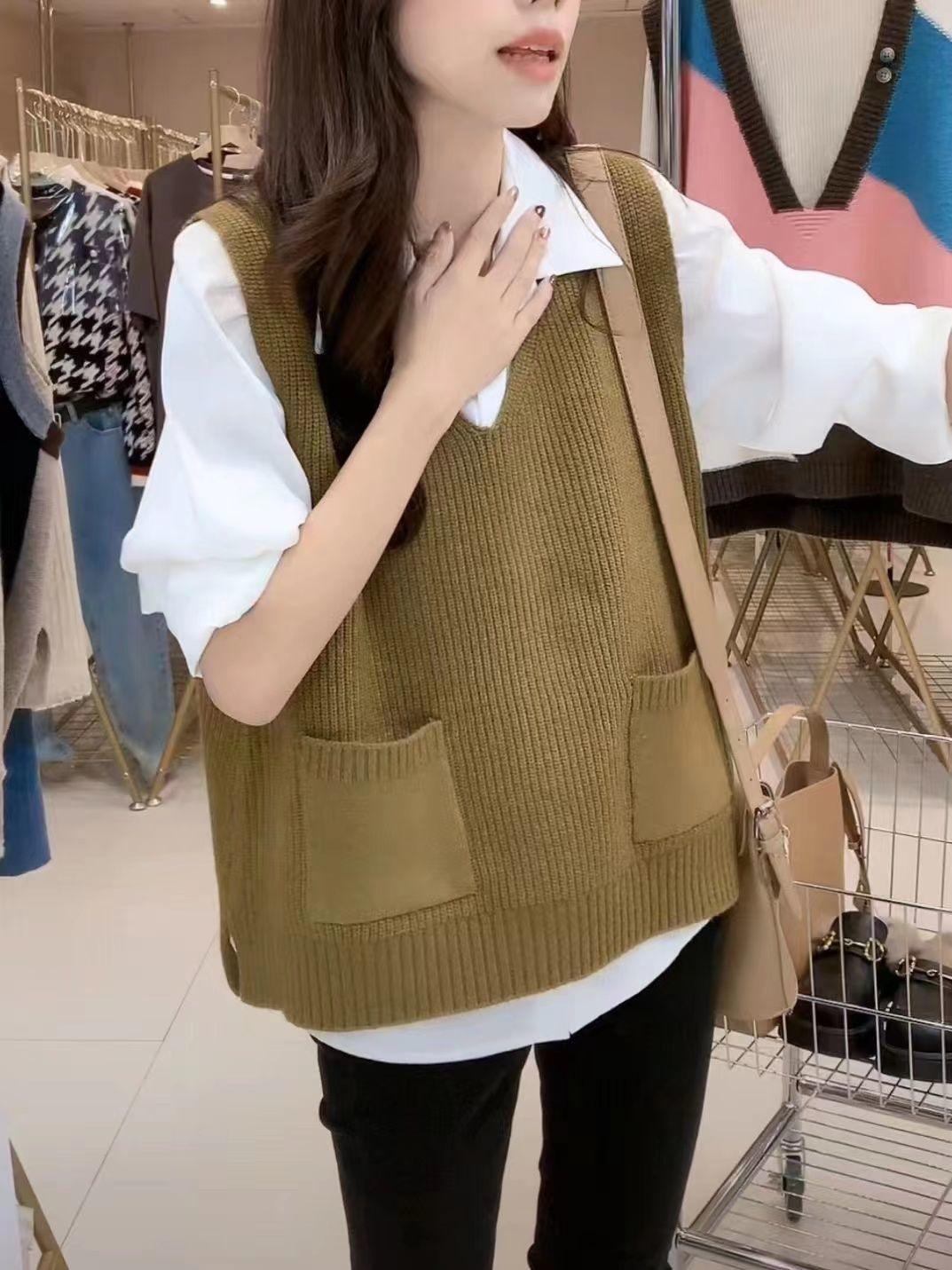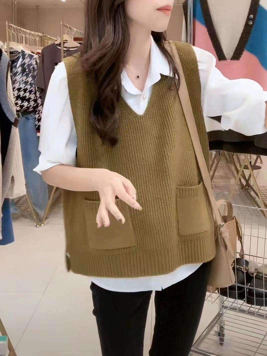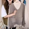 Plus size colete de malha com decote em V feminino 2023 novo estilo vintage bolso sem mangas colete pulôver top solto
