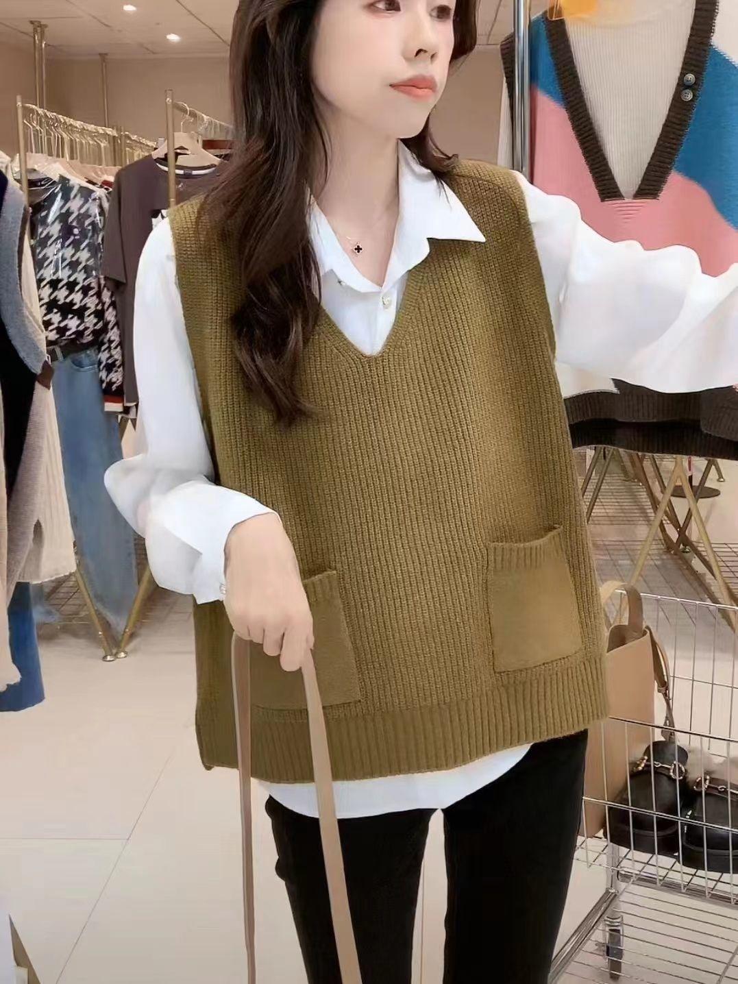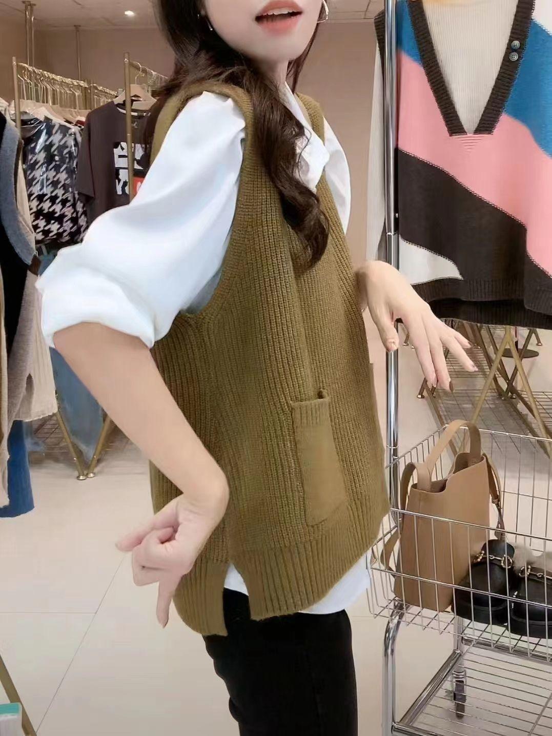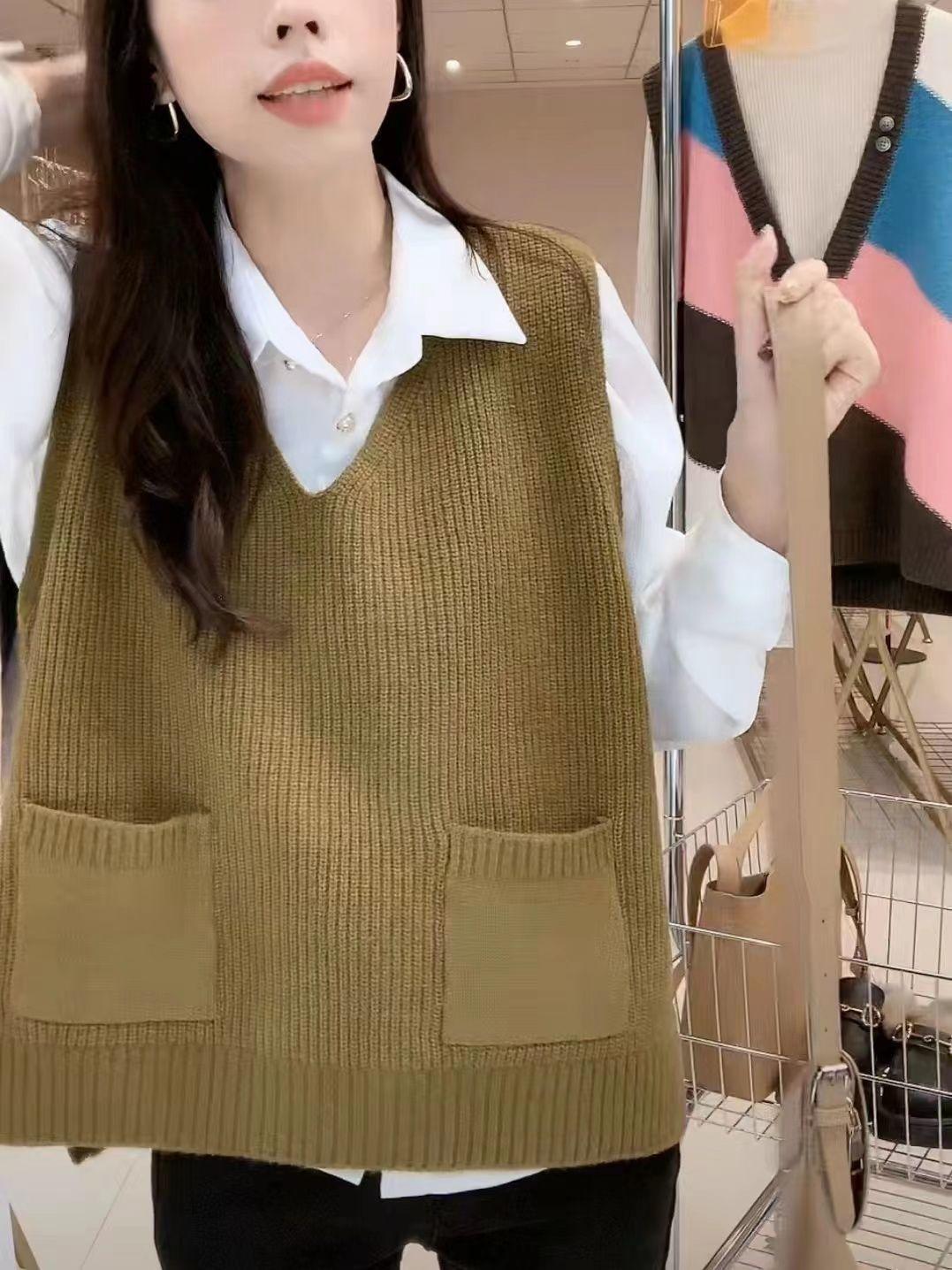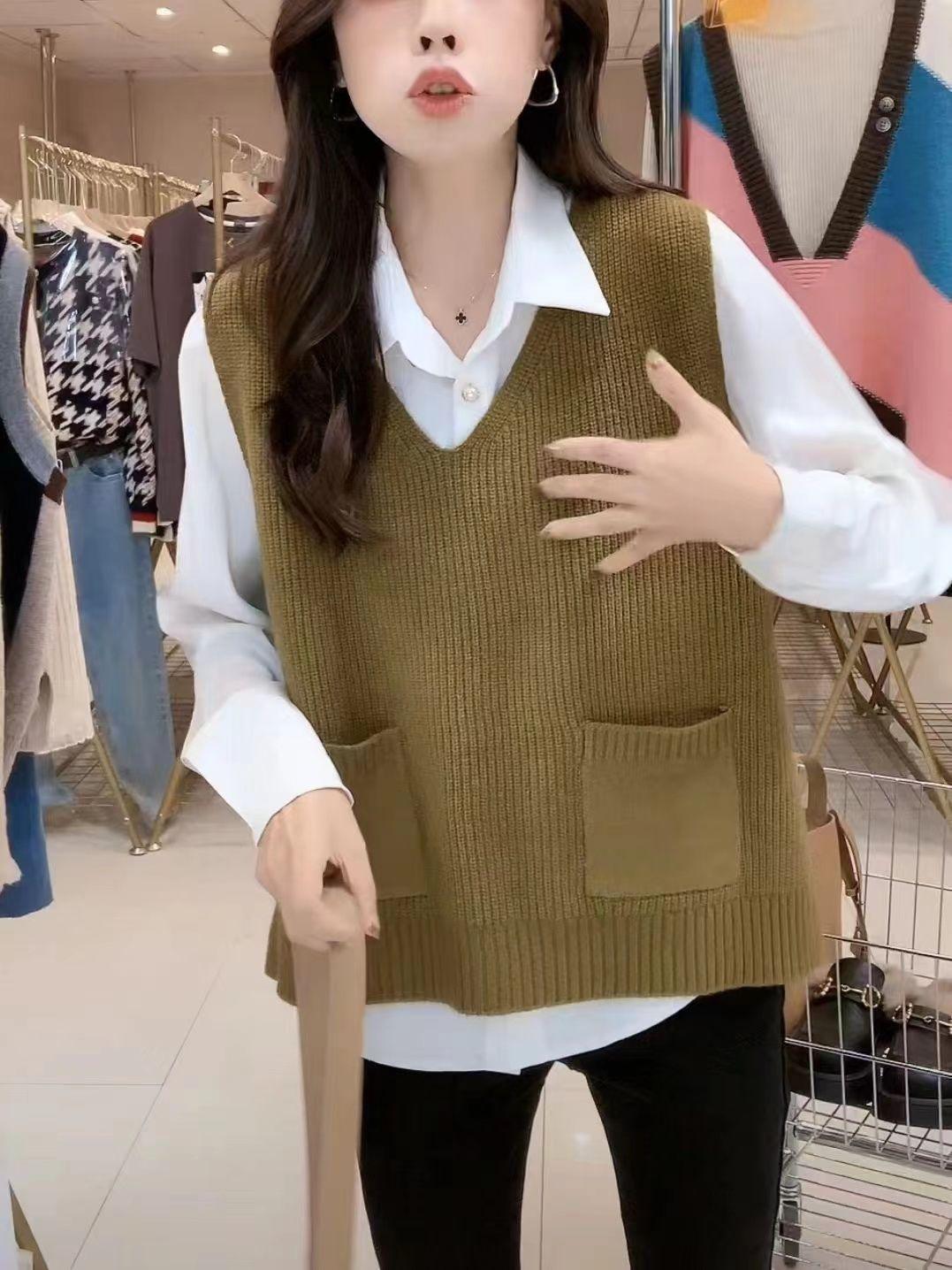 Plus size colete de malha com decote em V feminino 2023 novo estilo vintage bolso sem mangas colete pulôver top solto
