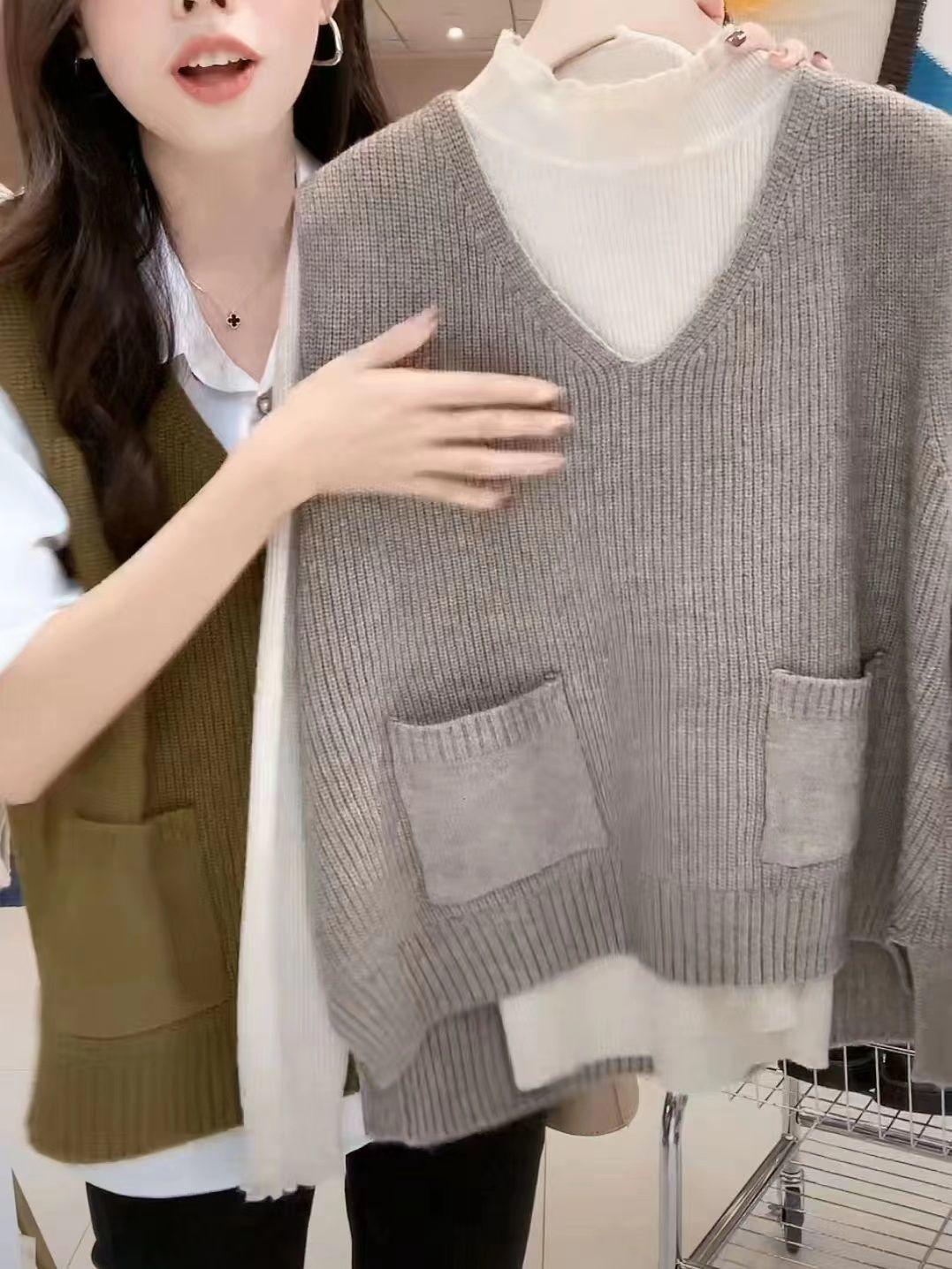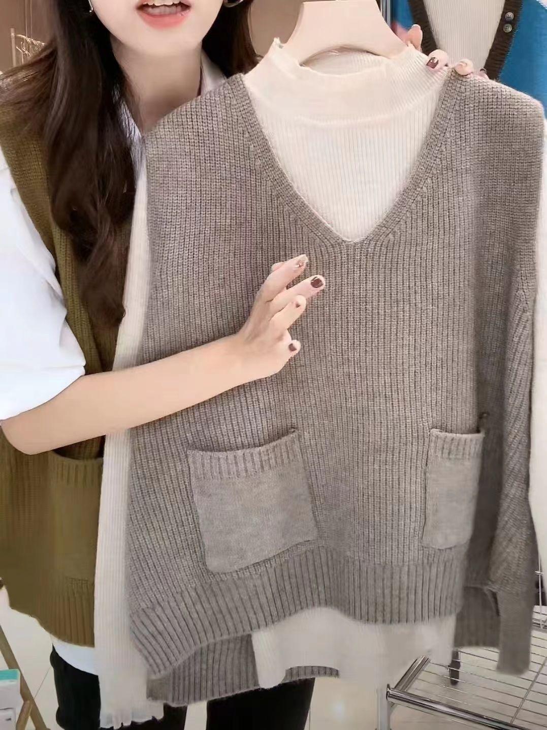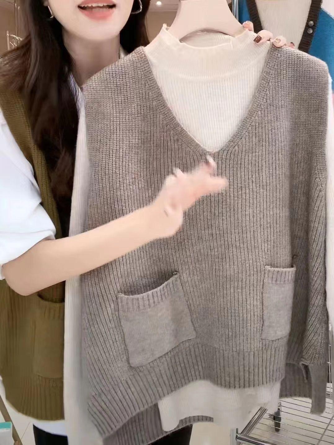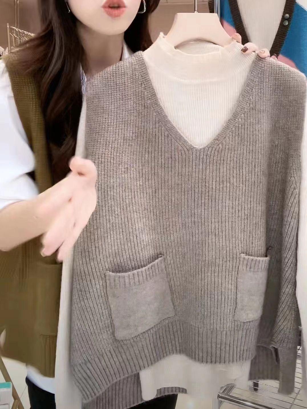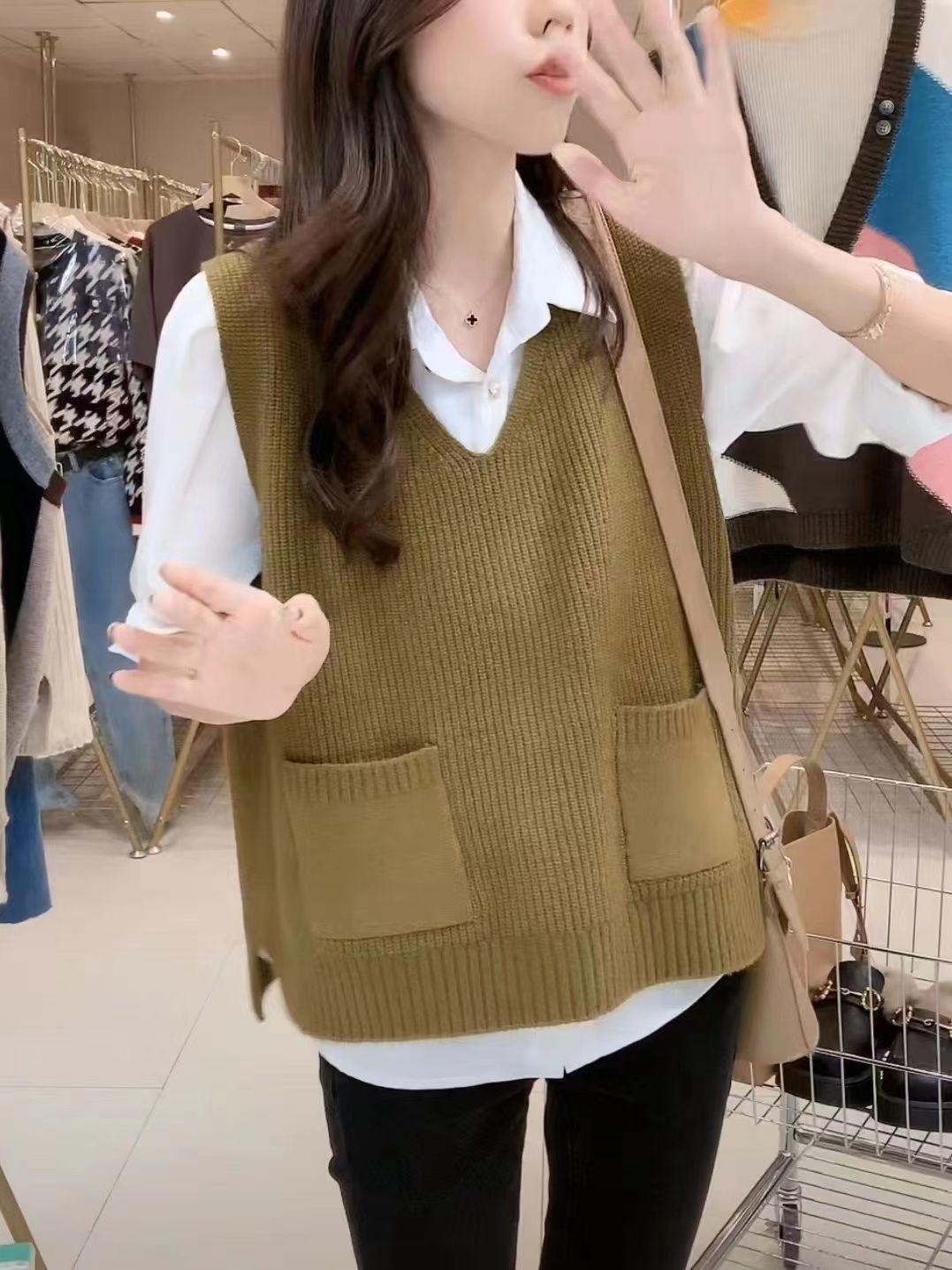Plus size colete de malha com decote em V feminino 2023 novo estilo vintage bolso sem mangas colete pulôver top solto