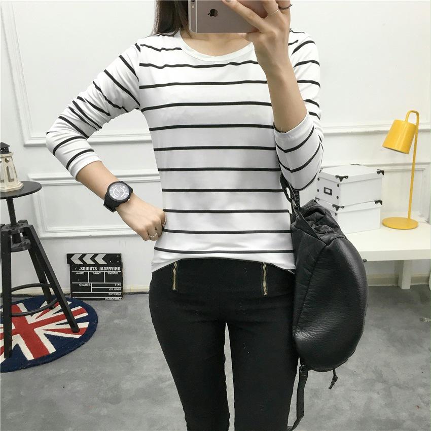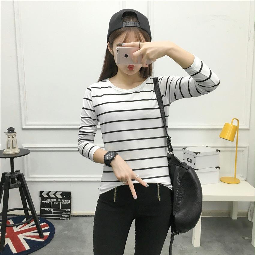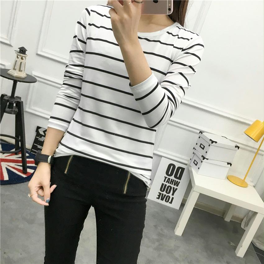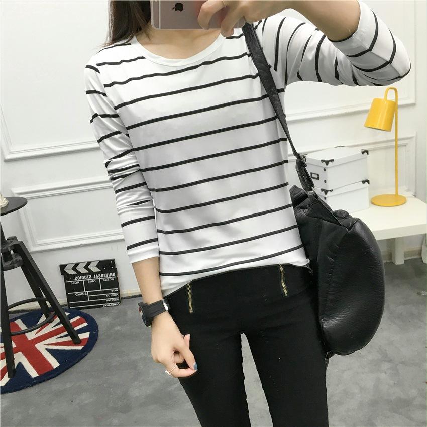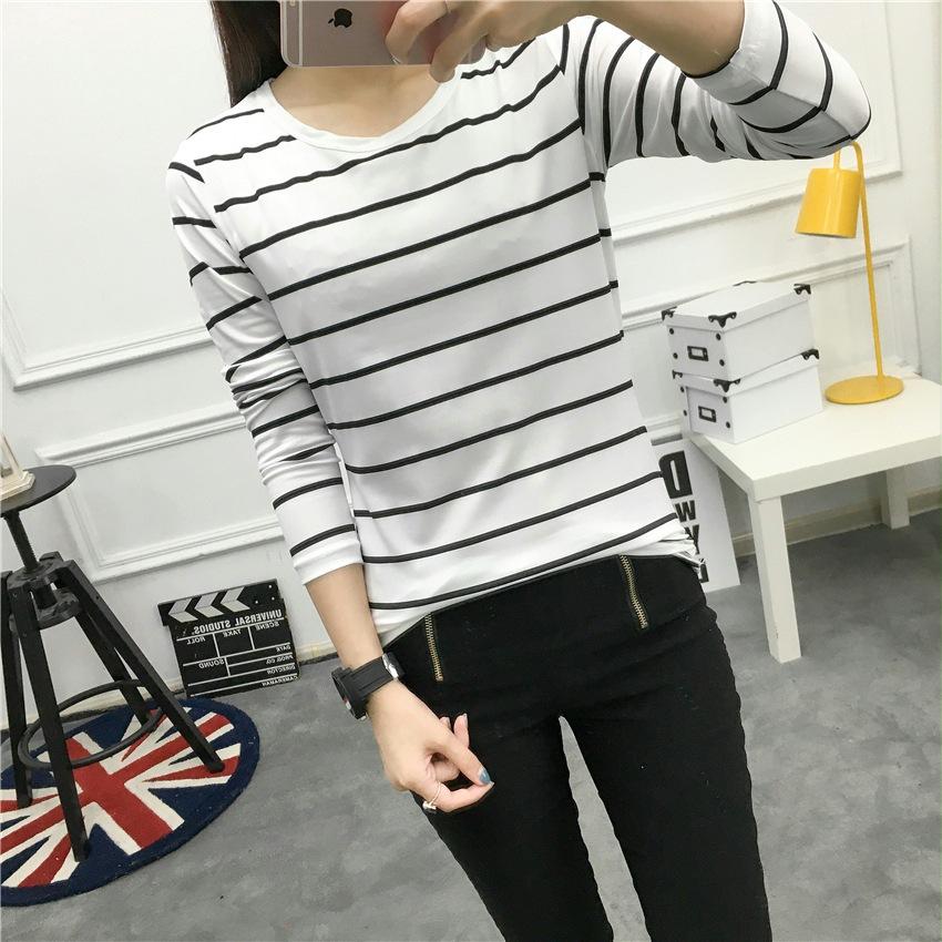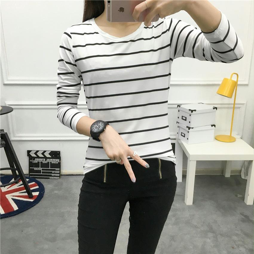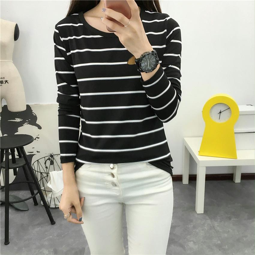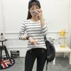 Preto e Branco Listrado Feminino 2024 Primavera Novo Estilo Coreano Listrado Solto Emagrecimento Camiseta Feminina de Manga Comprida Estudante Top Feminino