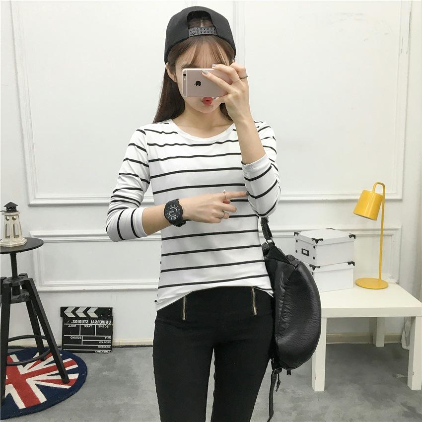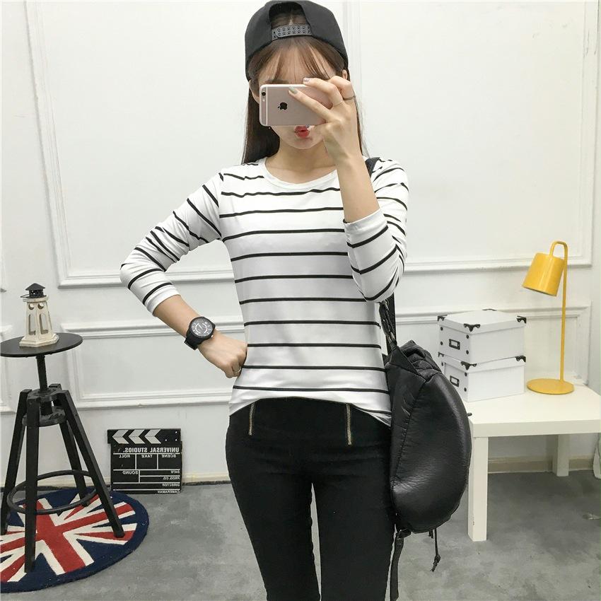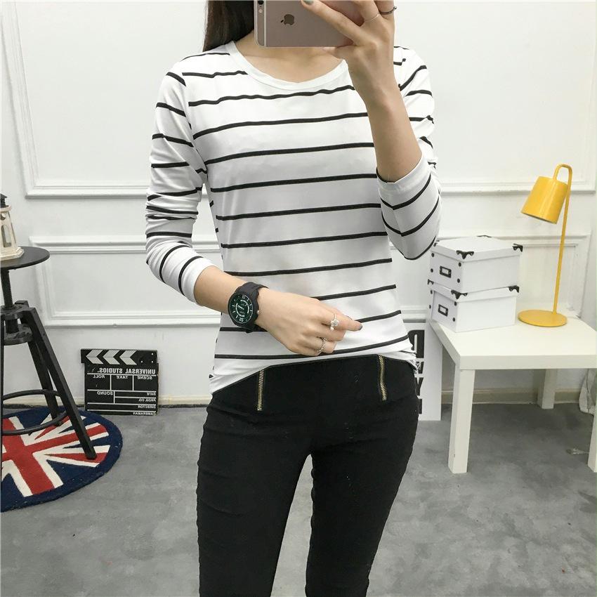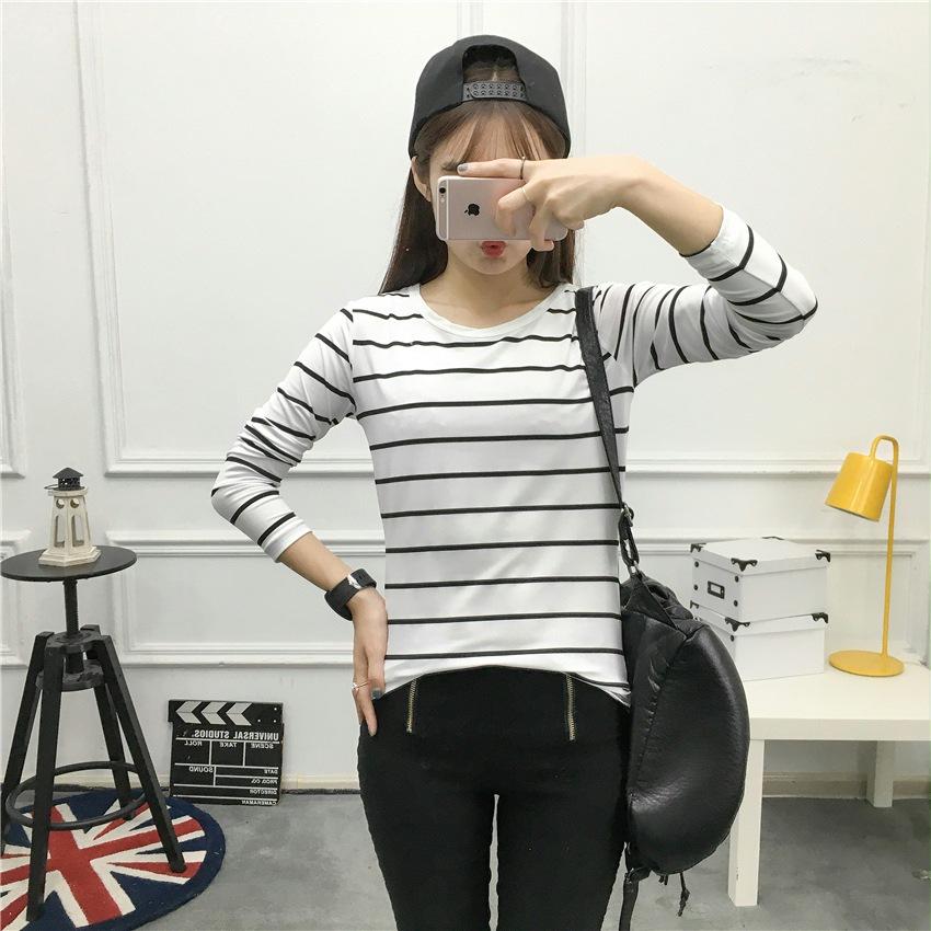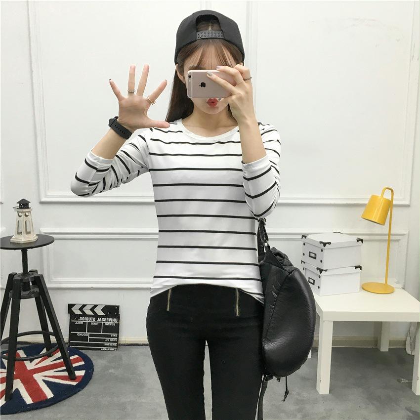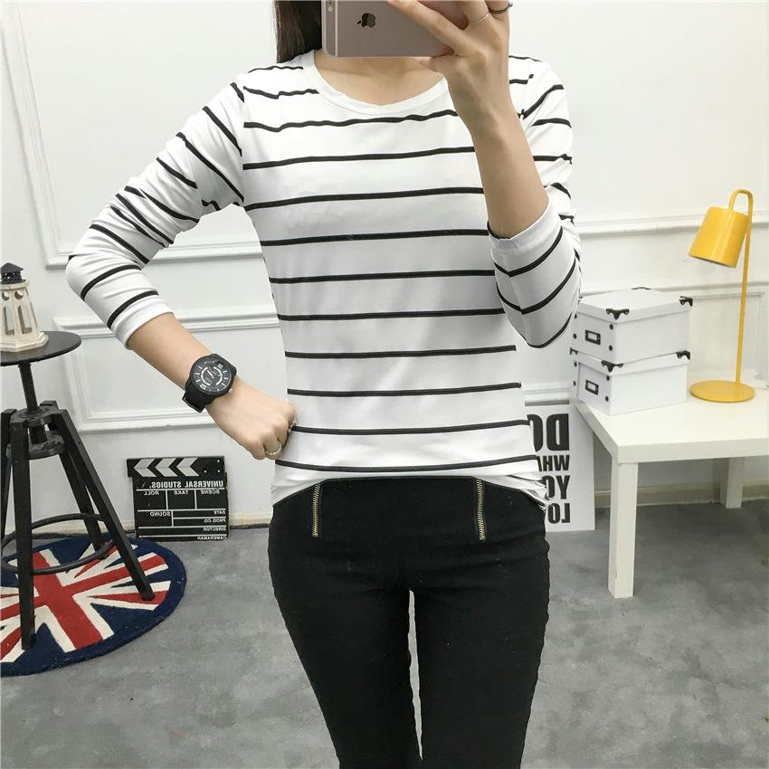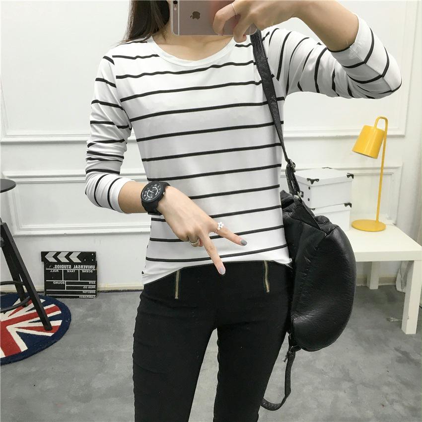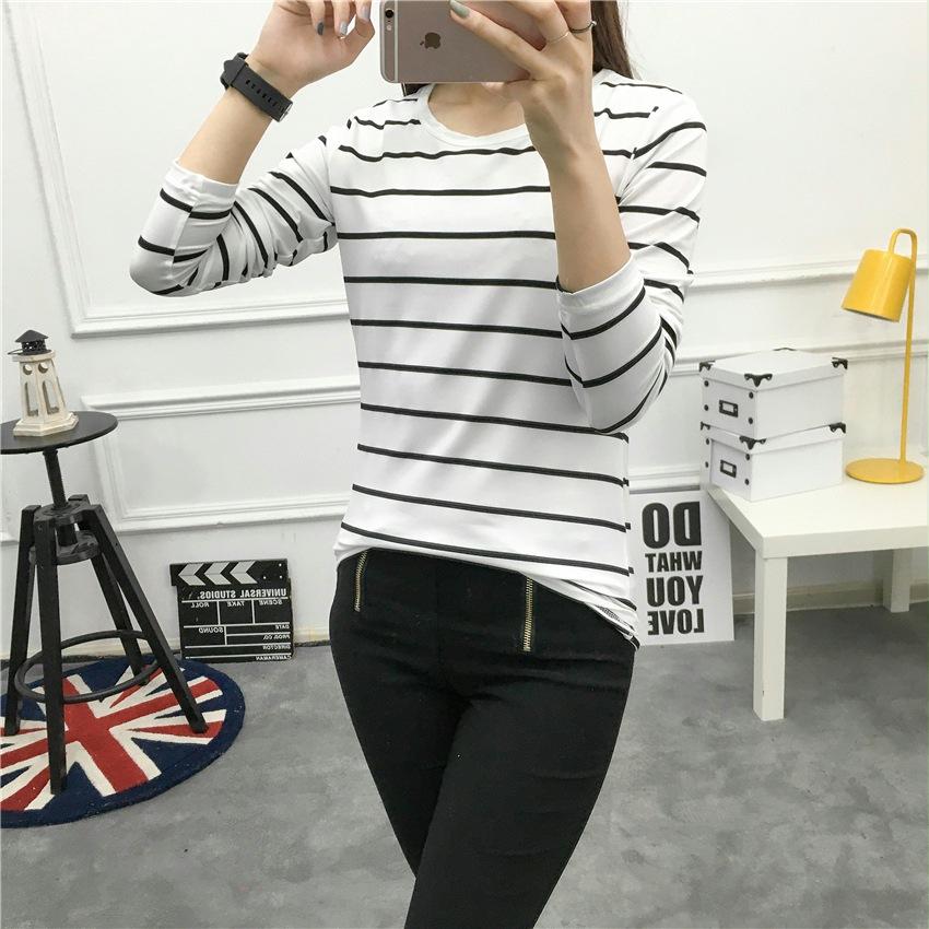 Preto e Branco Listrado Feminino 2024 Primavera Novo Estilo Coreano Listrado Solto Emagrecimento Camiseta Feminina de Manga Comprida Estudante Top Feminino