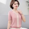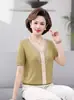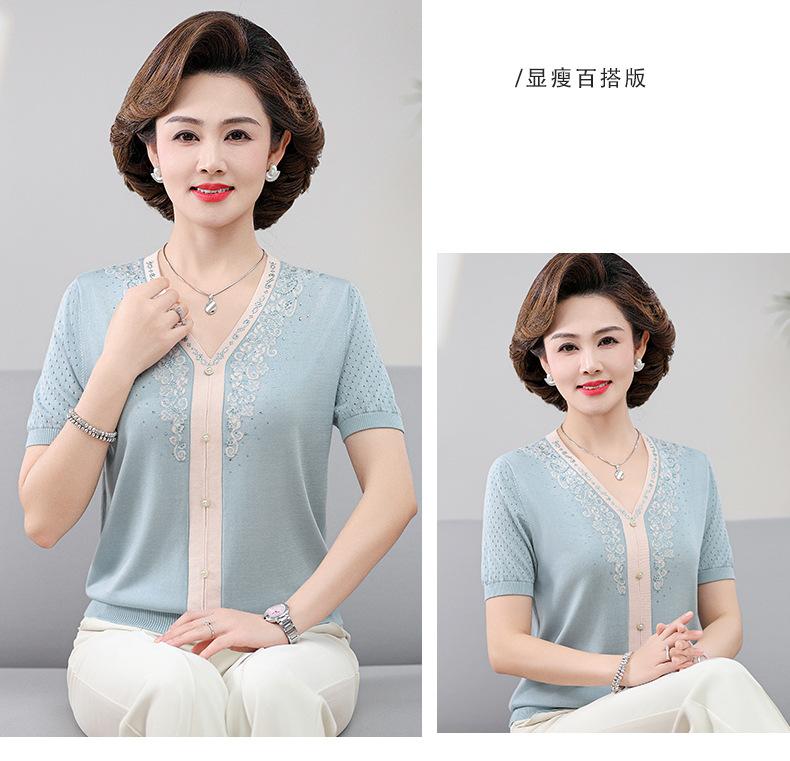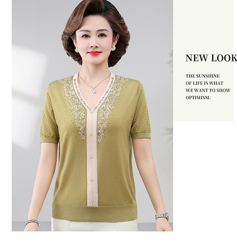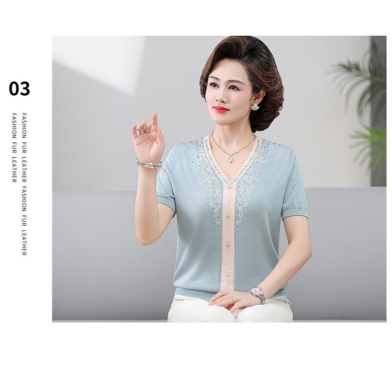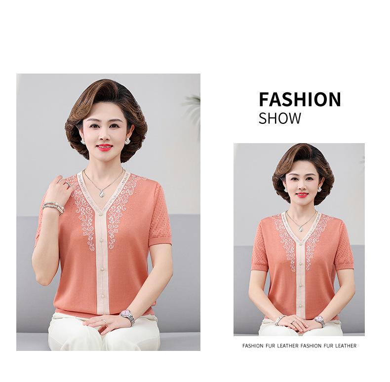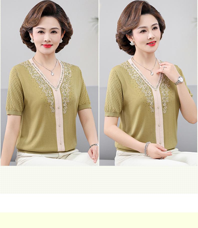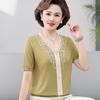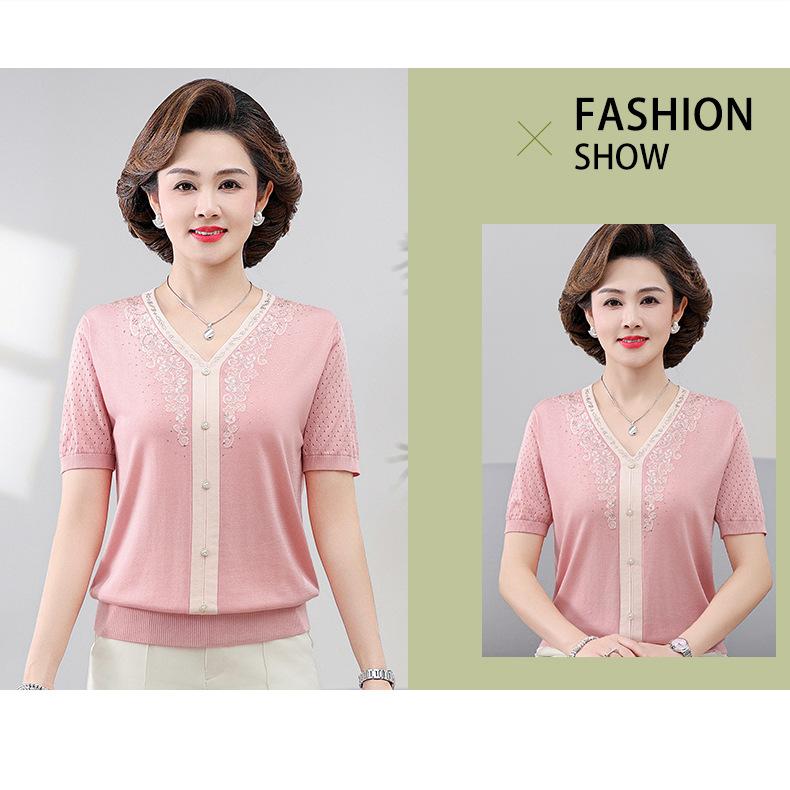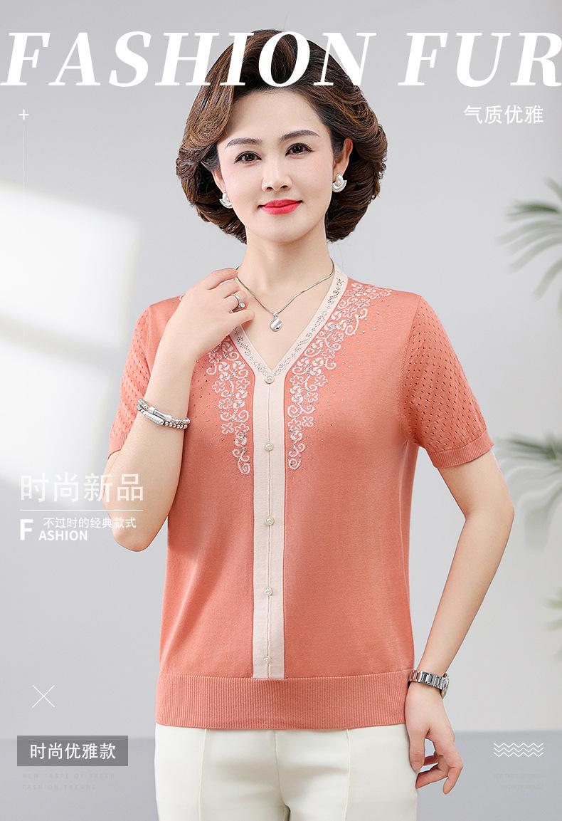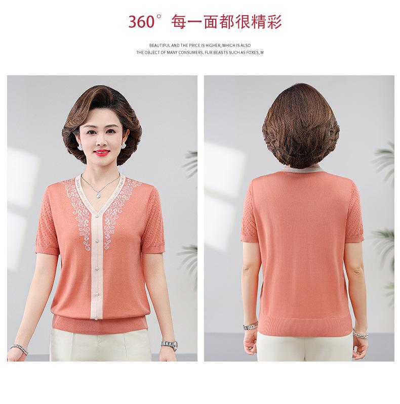 Suéter feminino de meia-idade e idosos, nova chegada de verão, elegante, decote em V, jacquard, manga curta, tamanho grande, blusa de lyocell para mãe