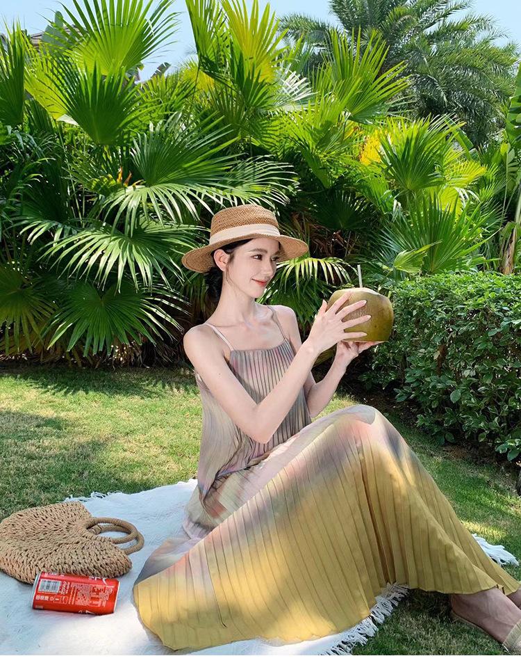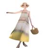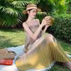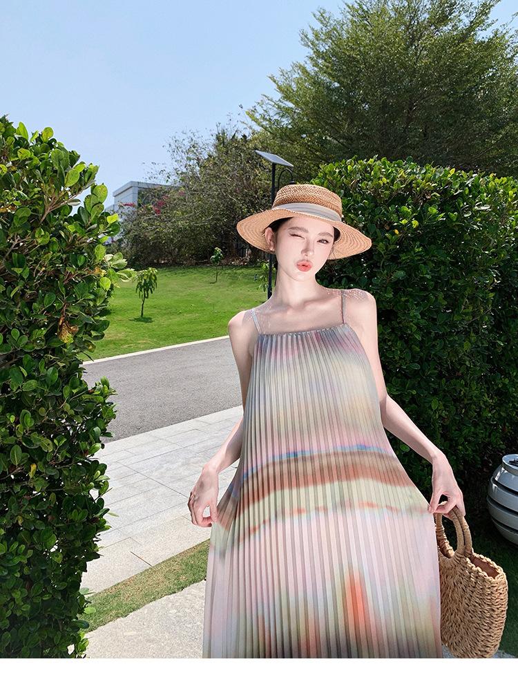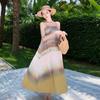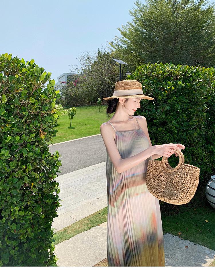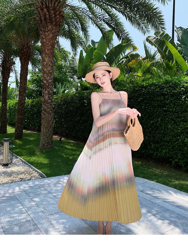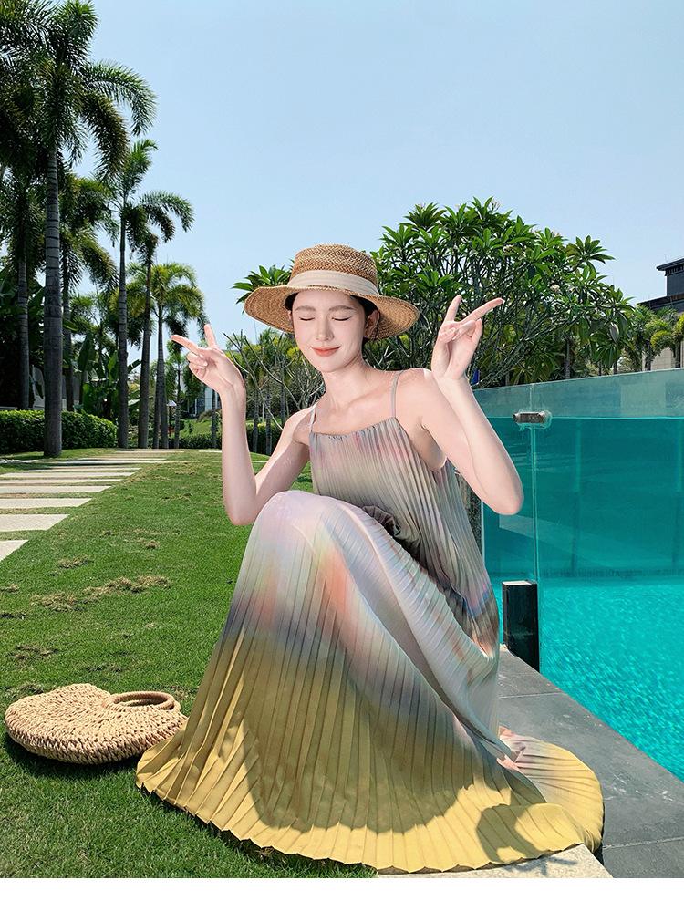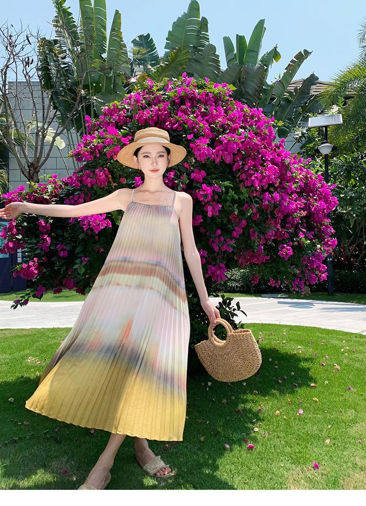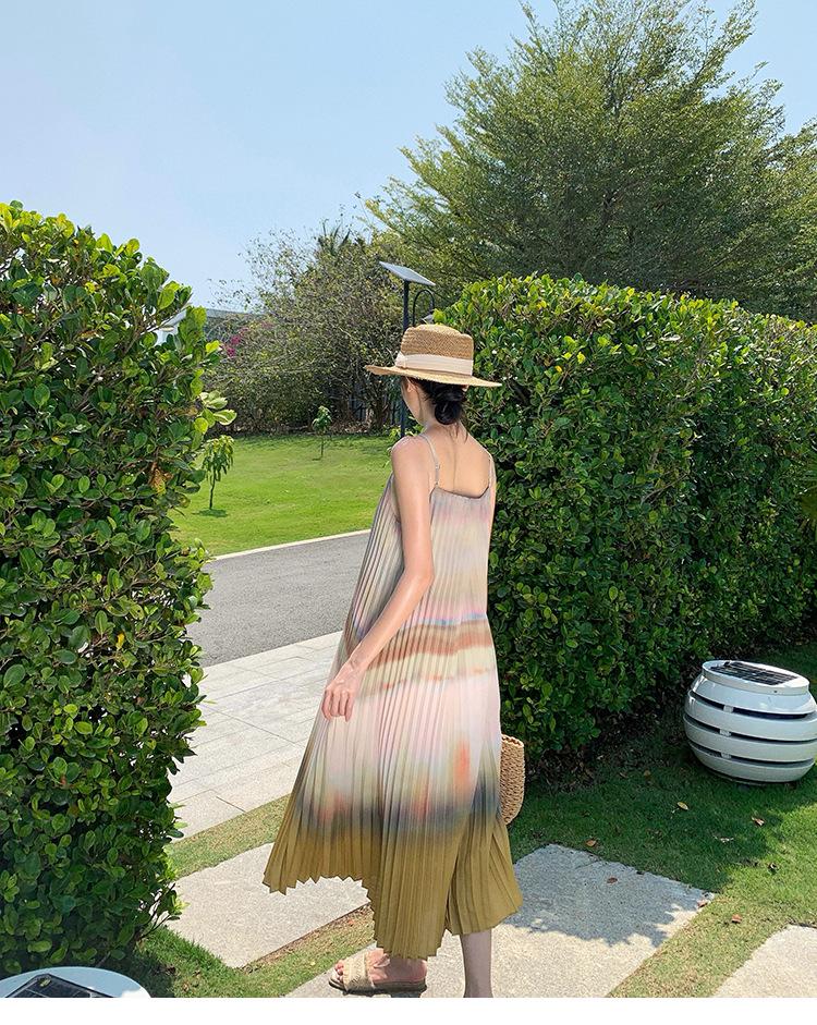 Vestido de Suspender Plissado Degradê Retrô Francês para Pausa para o Chá para Mulheres Verão Férias à Beira-Mar Super Fada e Super Bonito Vestido de Praia
