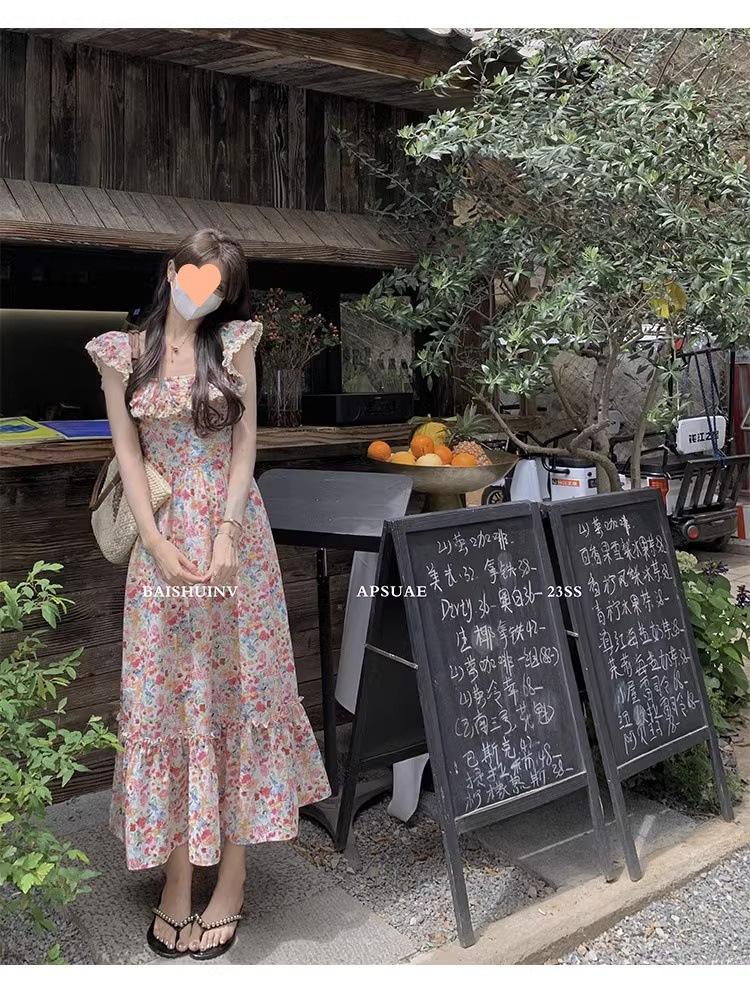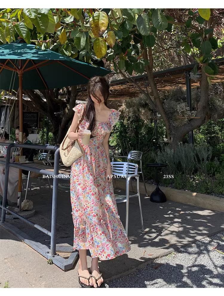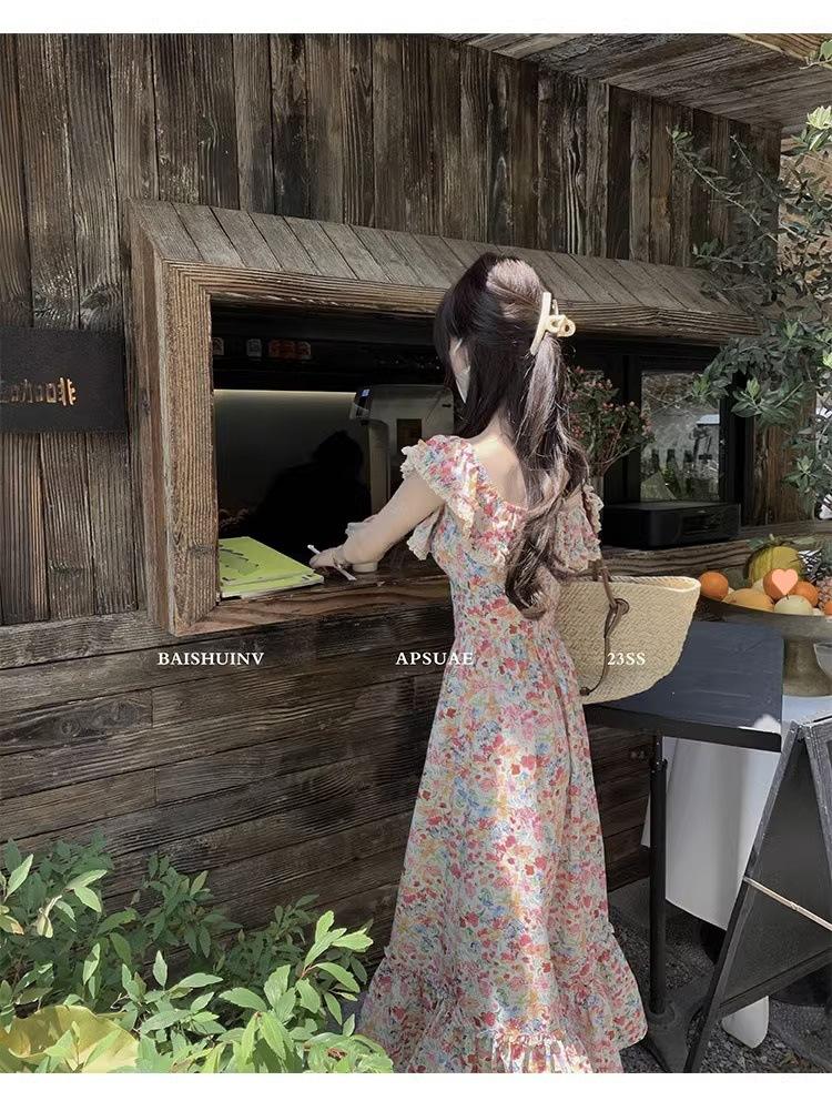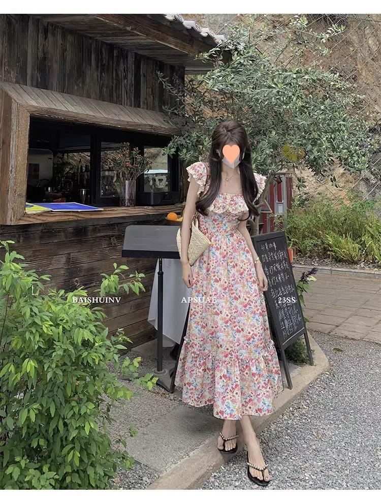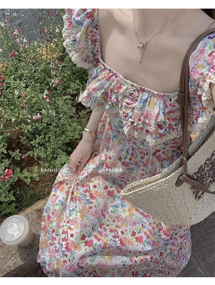 Compre Vestido Floral de Gola Quadrada para Mulheres Slim-fit Emagrecimento Longo Vestido Casual de Férias à Beira-Mar no atacado no Joom.pro