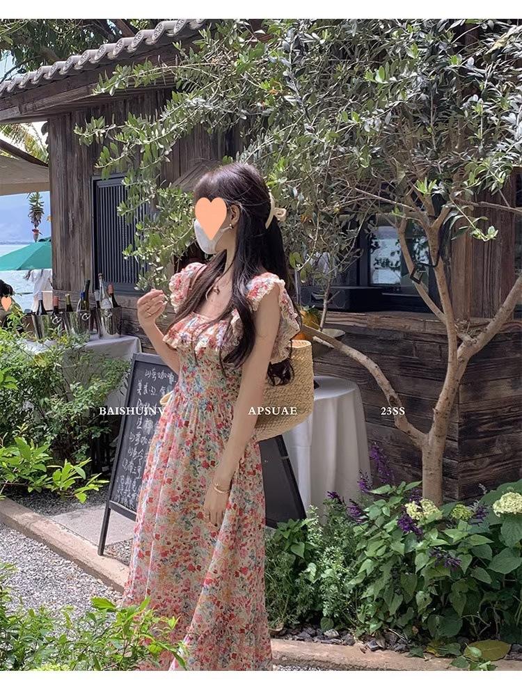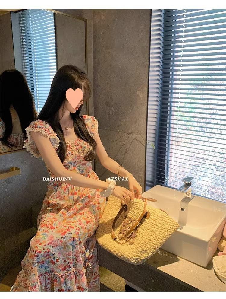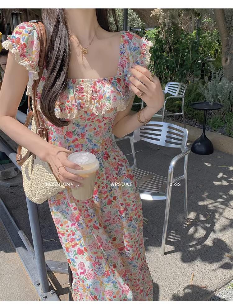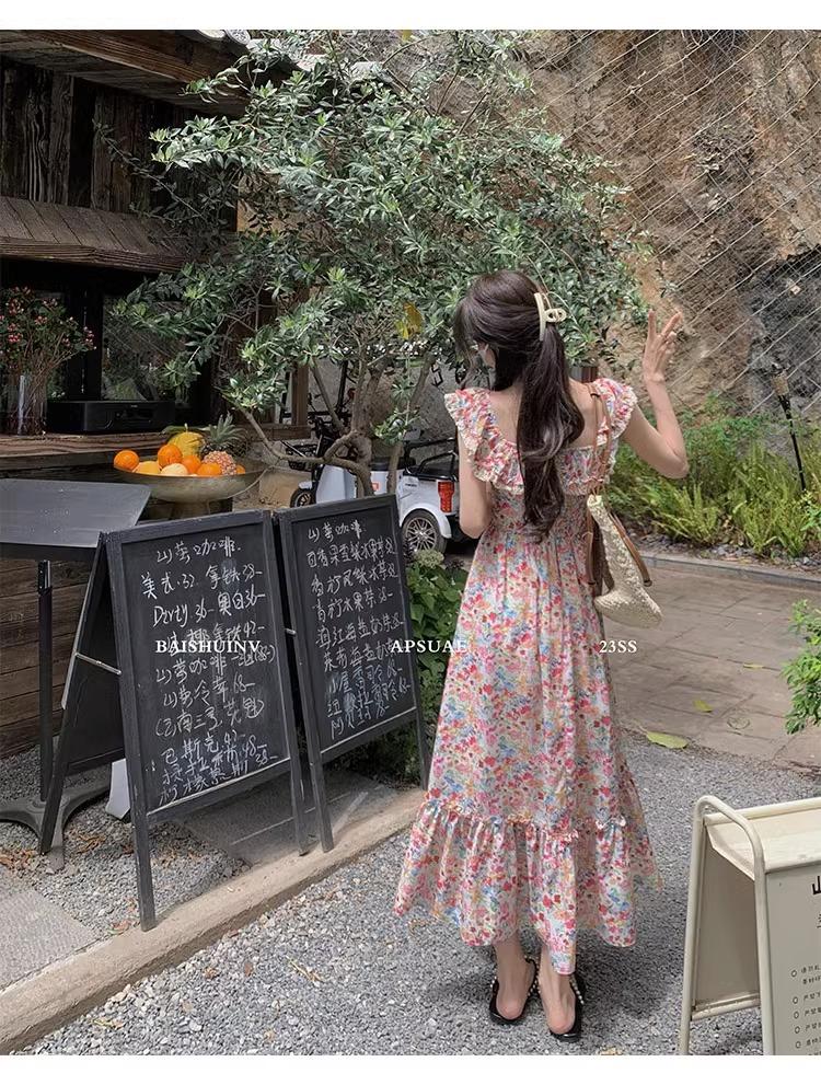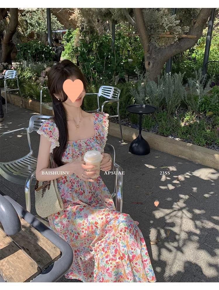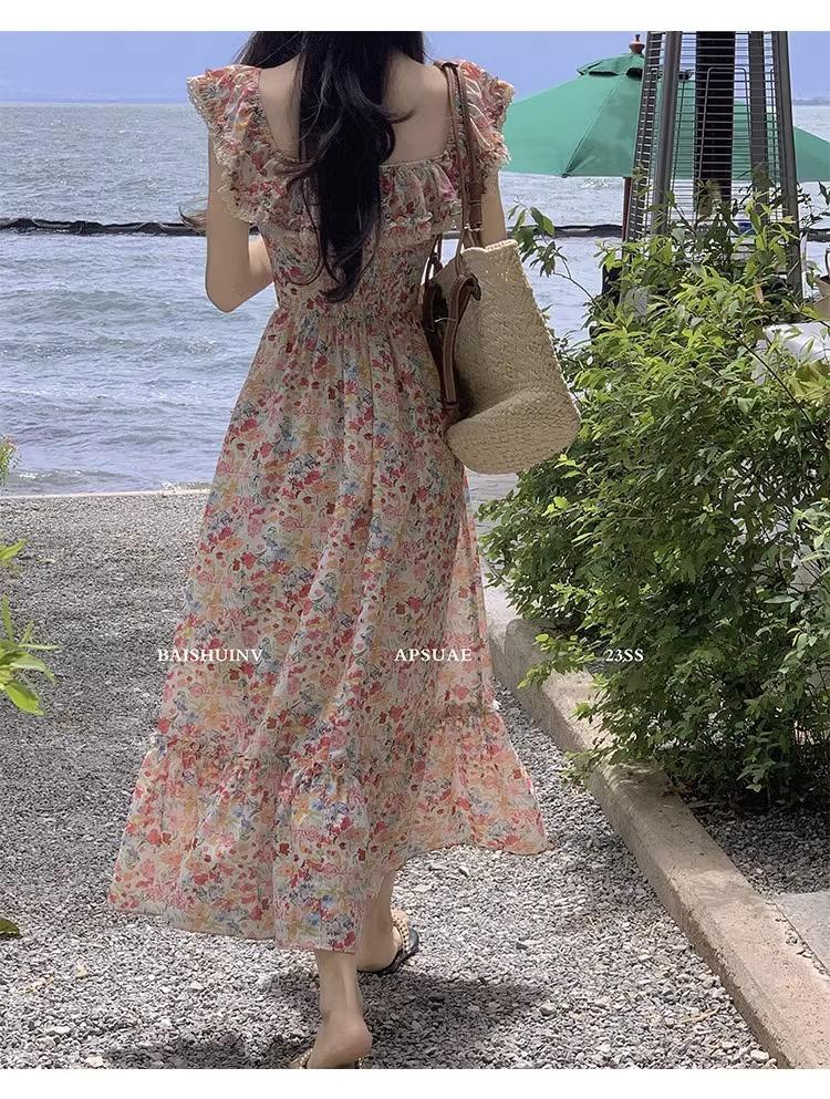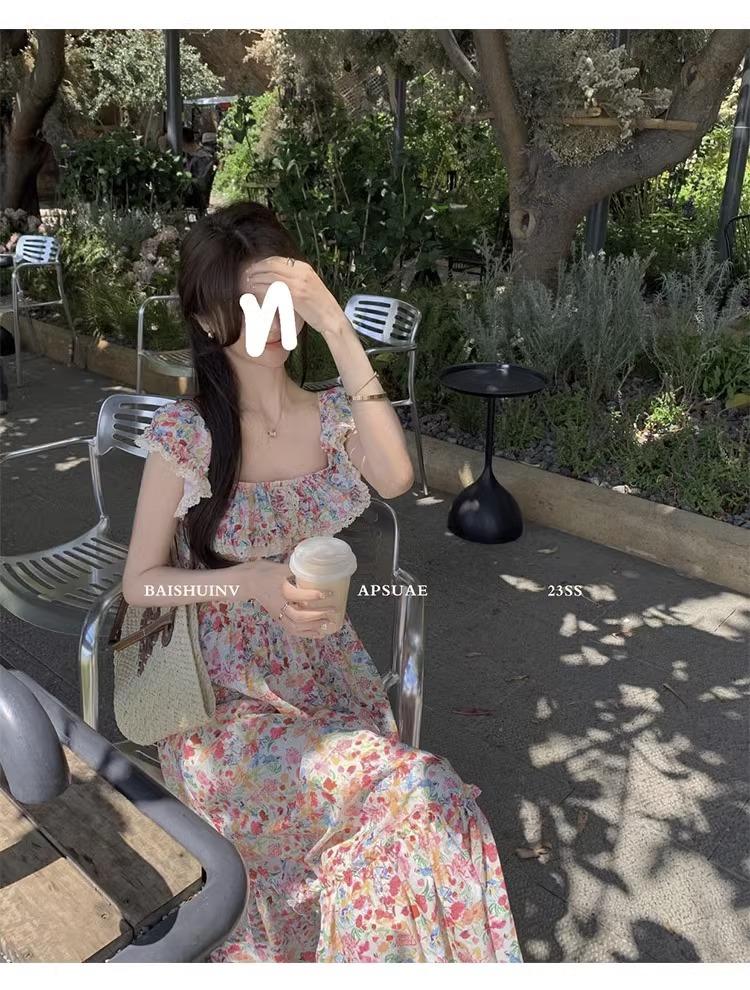 Vestido Floral de Gola Quadrada para Mulheres Slim-fit Emagrecimento Longo Vestido Casual de Férias à Beira-Mar