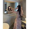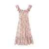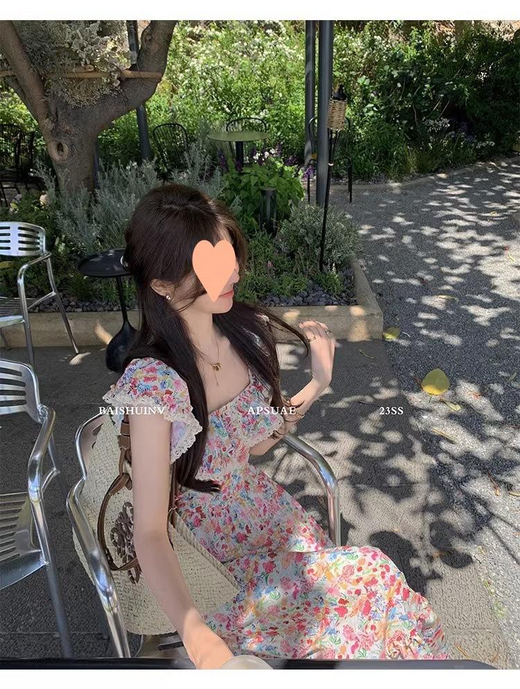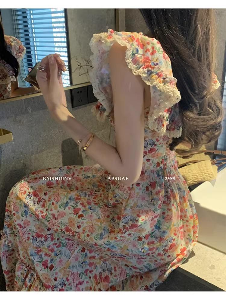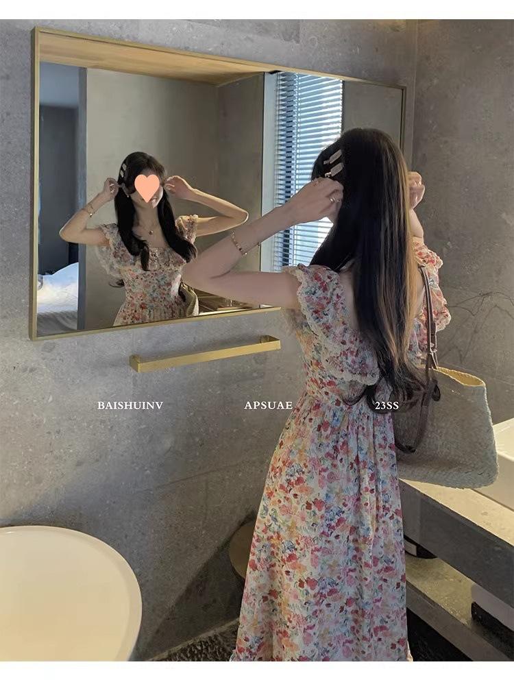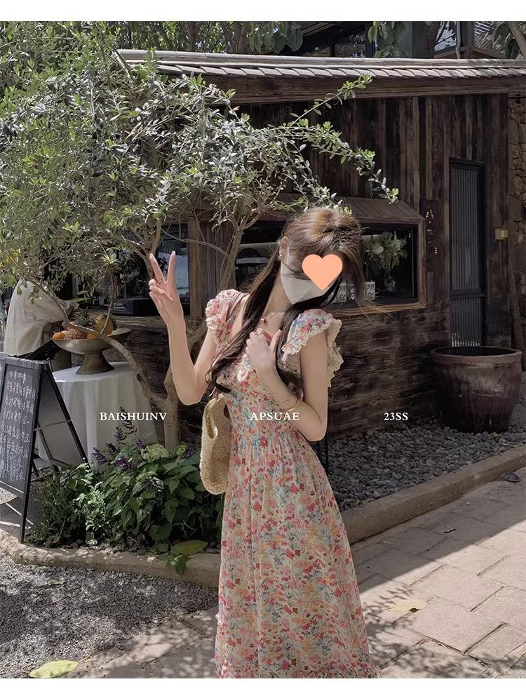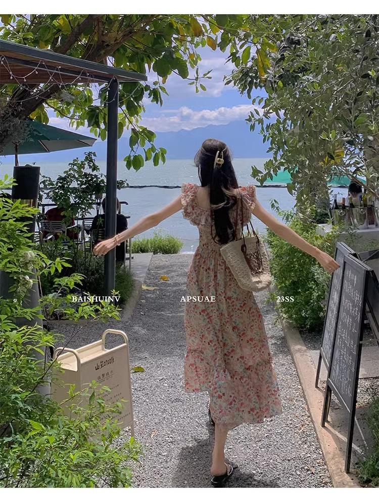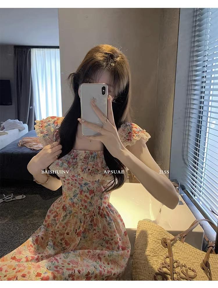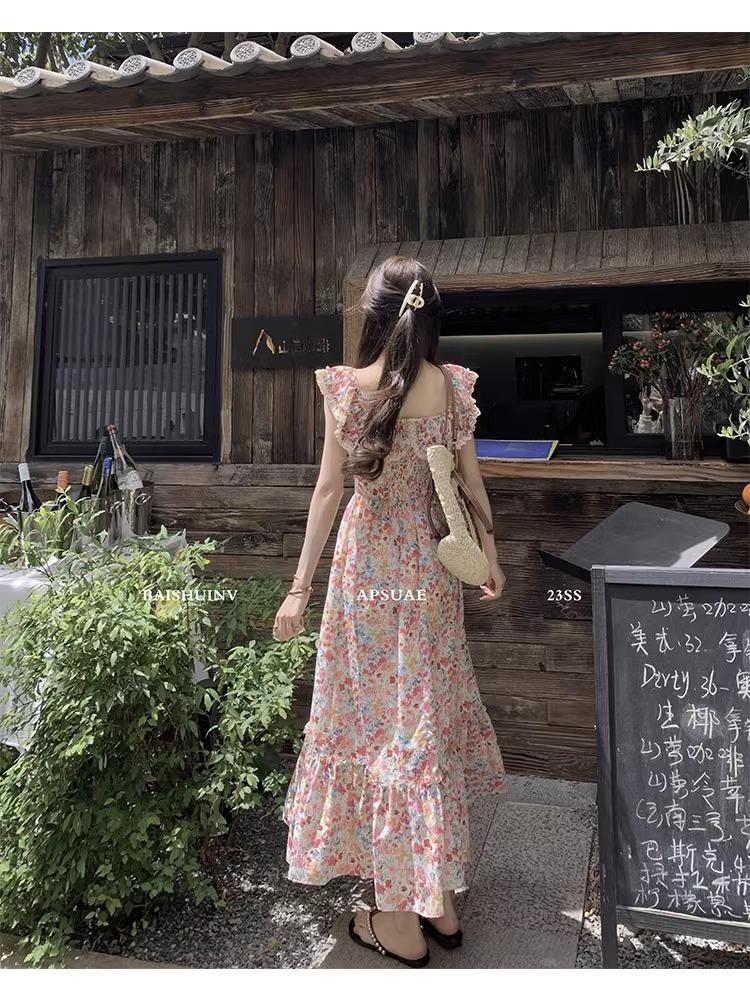 Vestido Floral de Gola Quadrada para Mulheres Slim-fit Emagrecimento Longo Vestido Casual de Férias à Beira-Mar