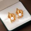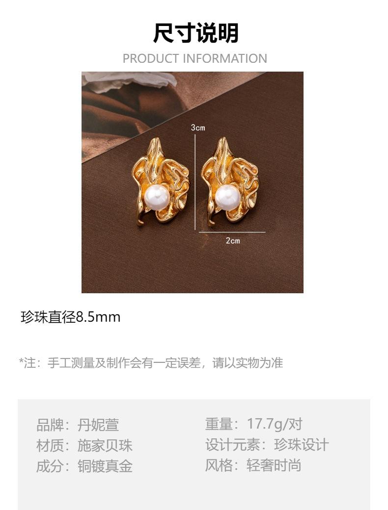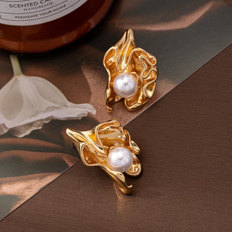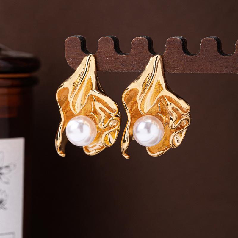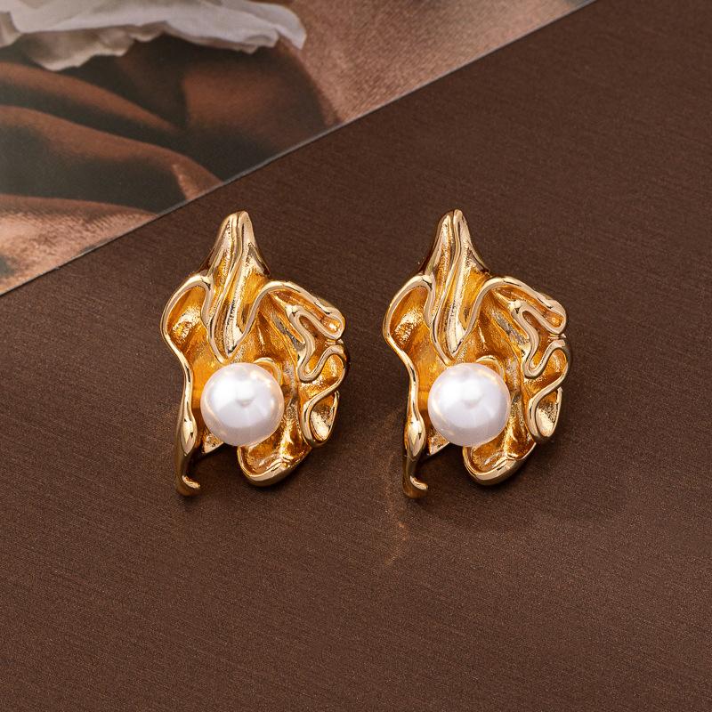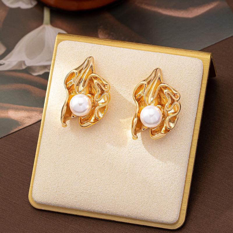 Europeu e Americano S925 Agulha de Prata Brincos de Pérola Brincos Retrô Femininos Folhas Plissadas Nicho Vento Frio Orelha Irregular Jóias