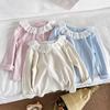 Camiseta para meninas primavera e outono, estilo ocidental, infantil, personalidade, tendência, coreana, renda, gola de renda oca, camisa de base doce