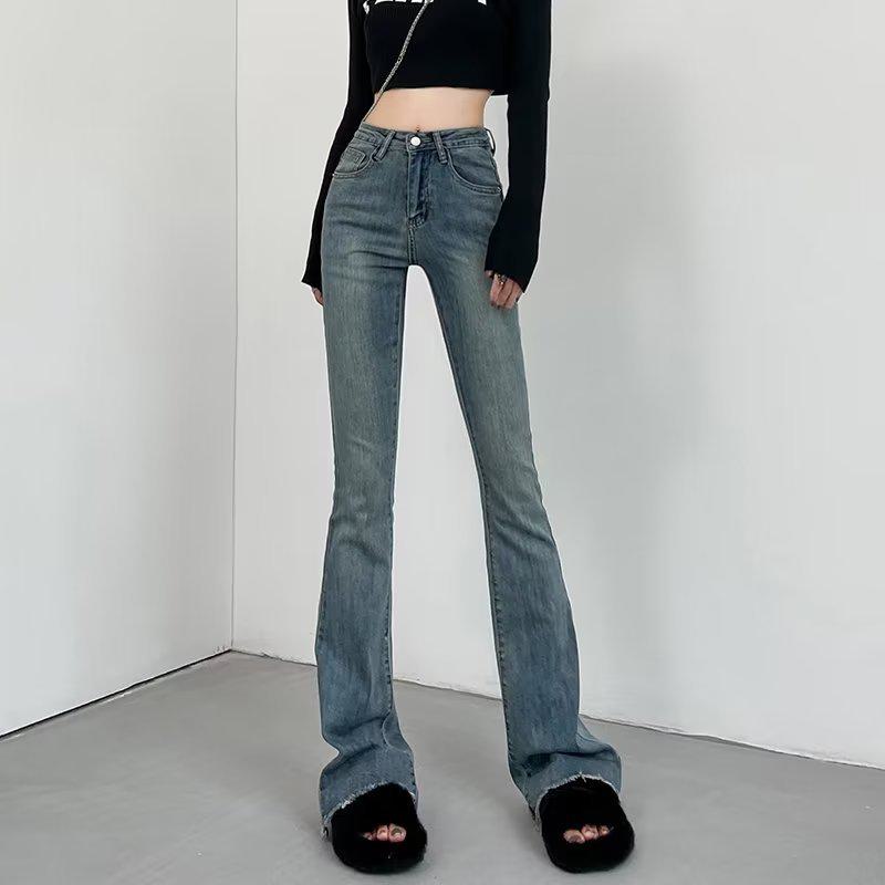 Rough Edge Jeans Feminino Primavera e Outono 2024 Nova Cintura Alta Tamanho Grande Slim Pequeno Ferradura Micro Calças Flared para Crianças