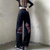 Jeans preto estampado estilo europeu e americano feminino novo cintura alta solto emagrecimento perna larga reta calças compridas vibe High Street