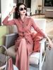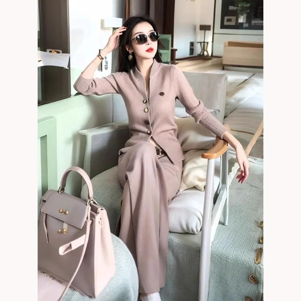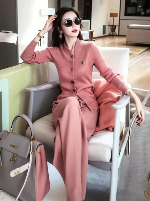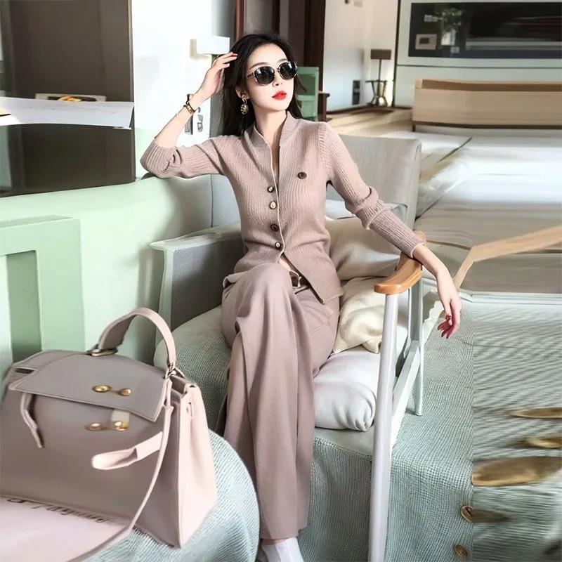 Terno esportivo casual feminino primavera e outono 2024 novo estilo ocidental da moda, cardigan de malha redutor de idade, calças largas, conjunto de duas peças para mulheres