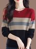 Compre Camisa de base de malha estilo ocidental primavera e outono 2024, gola redonda, cor contrastante, listrada, manga comprida, blusa solta, cobertura da barriga, suéter feminino fino no atacado no Joom.pro