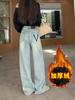Calça Jeans Reta Azul Claro Feminina 2024 Forro de lã Espessado em Forma de Pêra Gordinha Cintura Alta Emagrecimento Perna Larga Calças de Chão