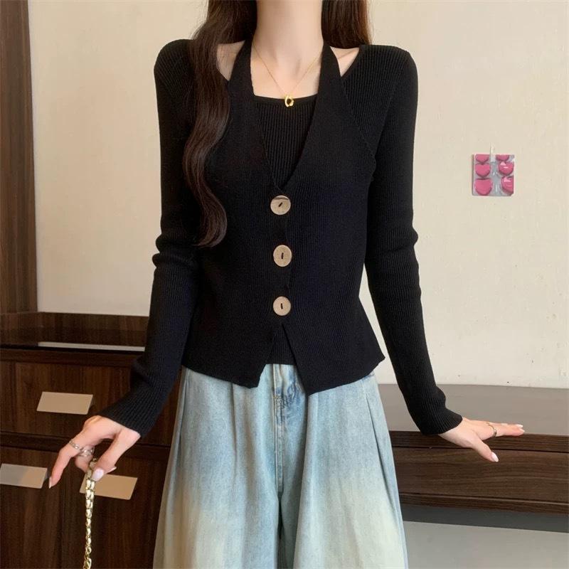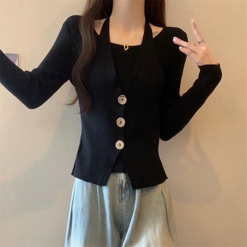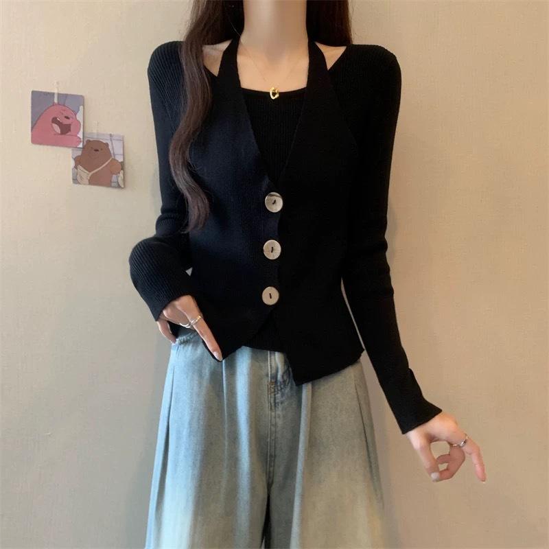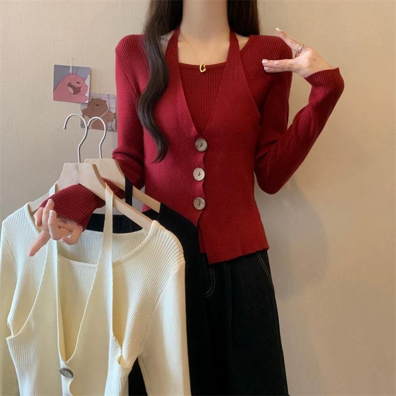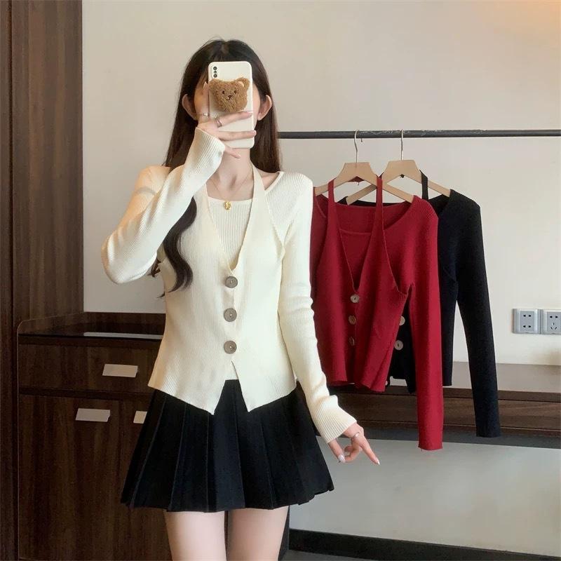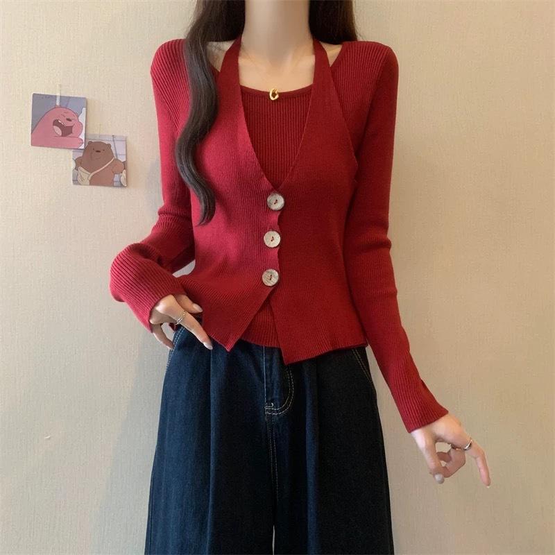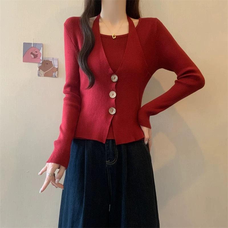 Outono e inverno novo estilo coreano gola redonda suéter de malha design sentido falso duas peças puro slim-fit emagrecimento top roupas femininas