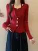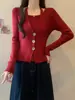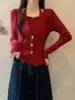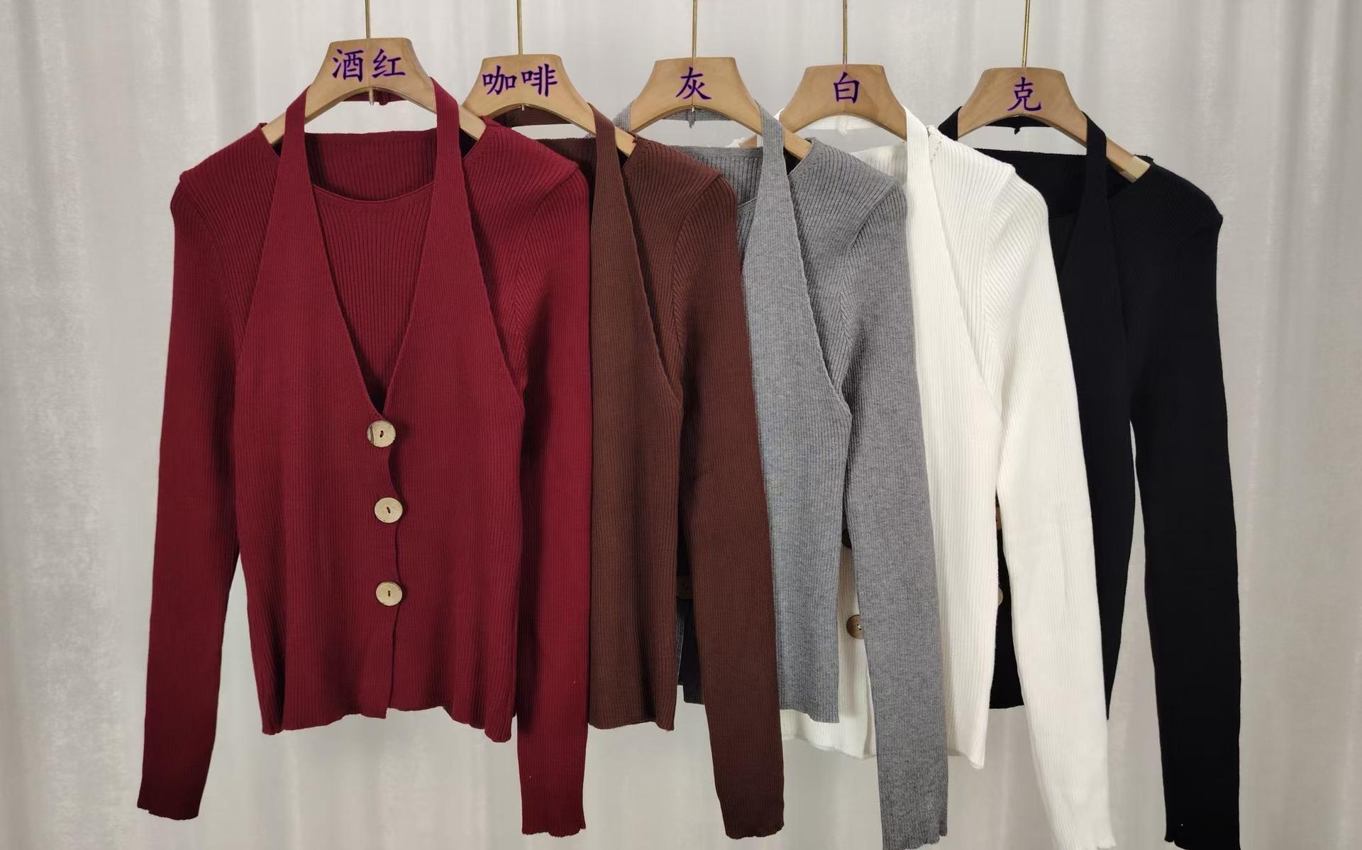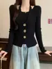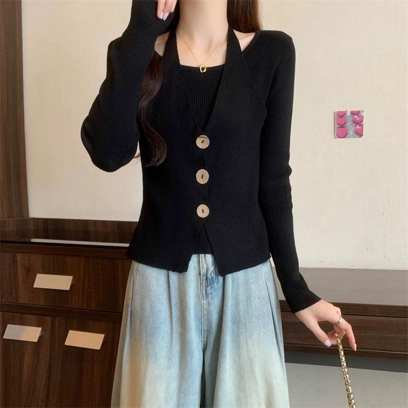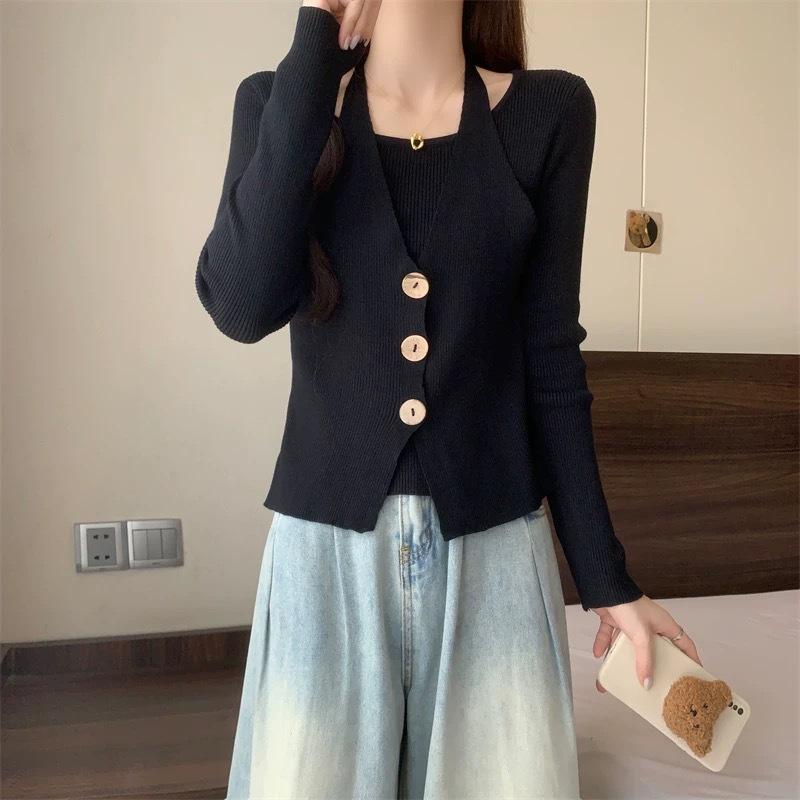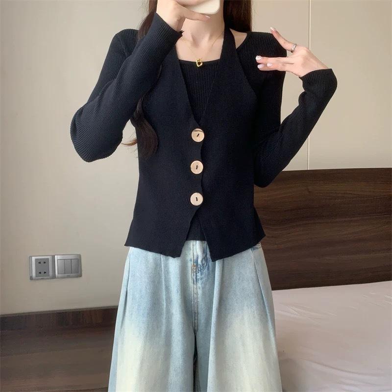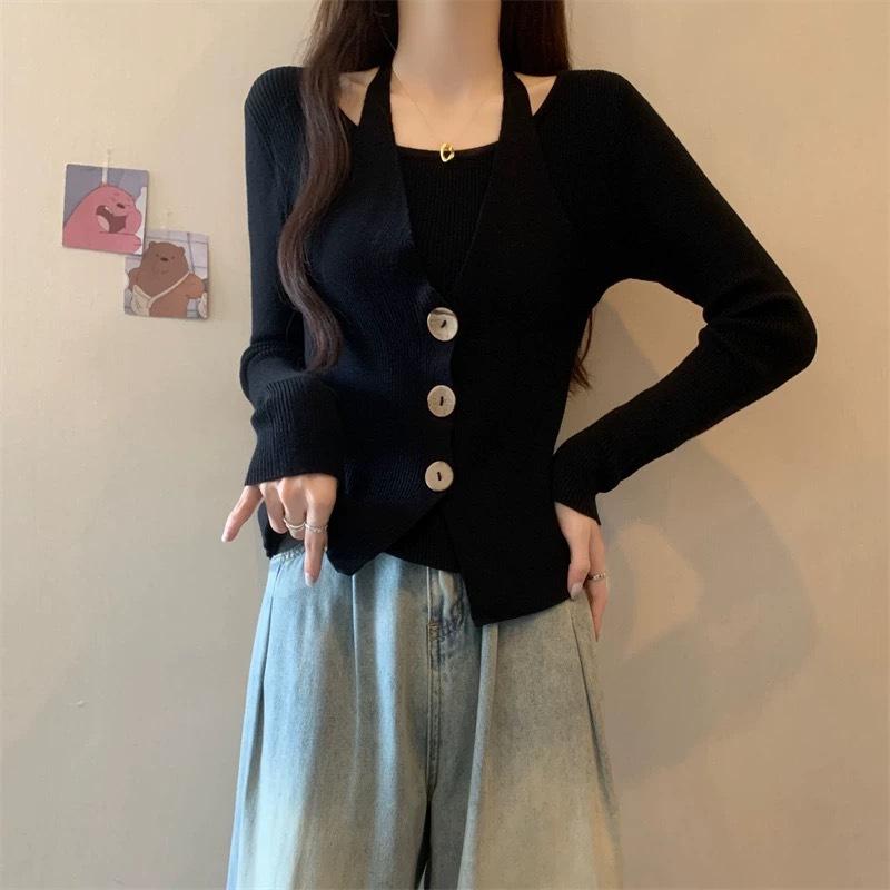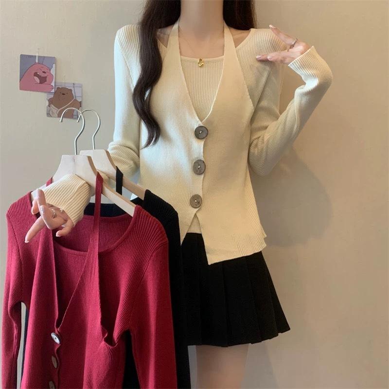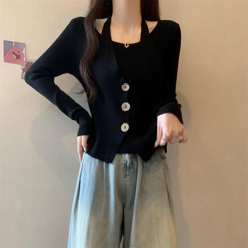 Outono e inverno novo estilo coreano gola redonda suéter de malha design sentido falso duas peças puro slim-fit emagrecimento top roupas femininas