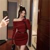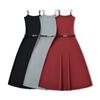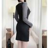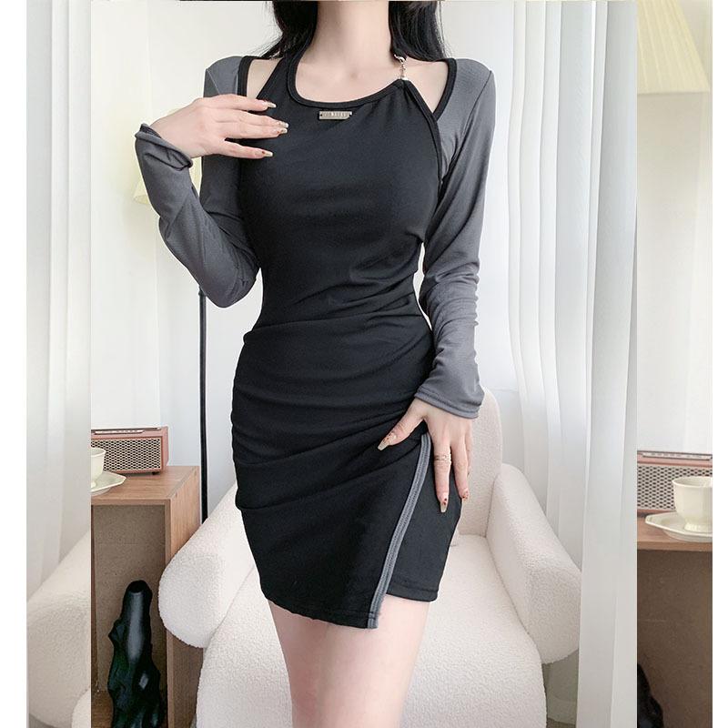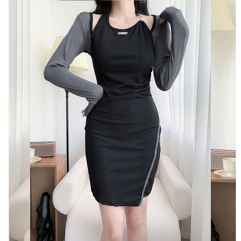 American Spice Girl Vestido falso de duas peças com decote pendurado, primavera e outono de 2024, novo vestido slim fit, elegante, envolvente, quadril, saia de manga comprida