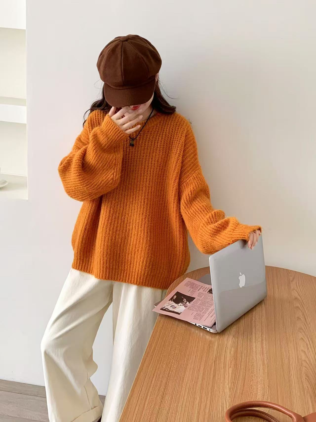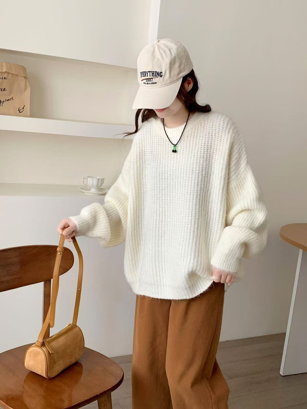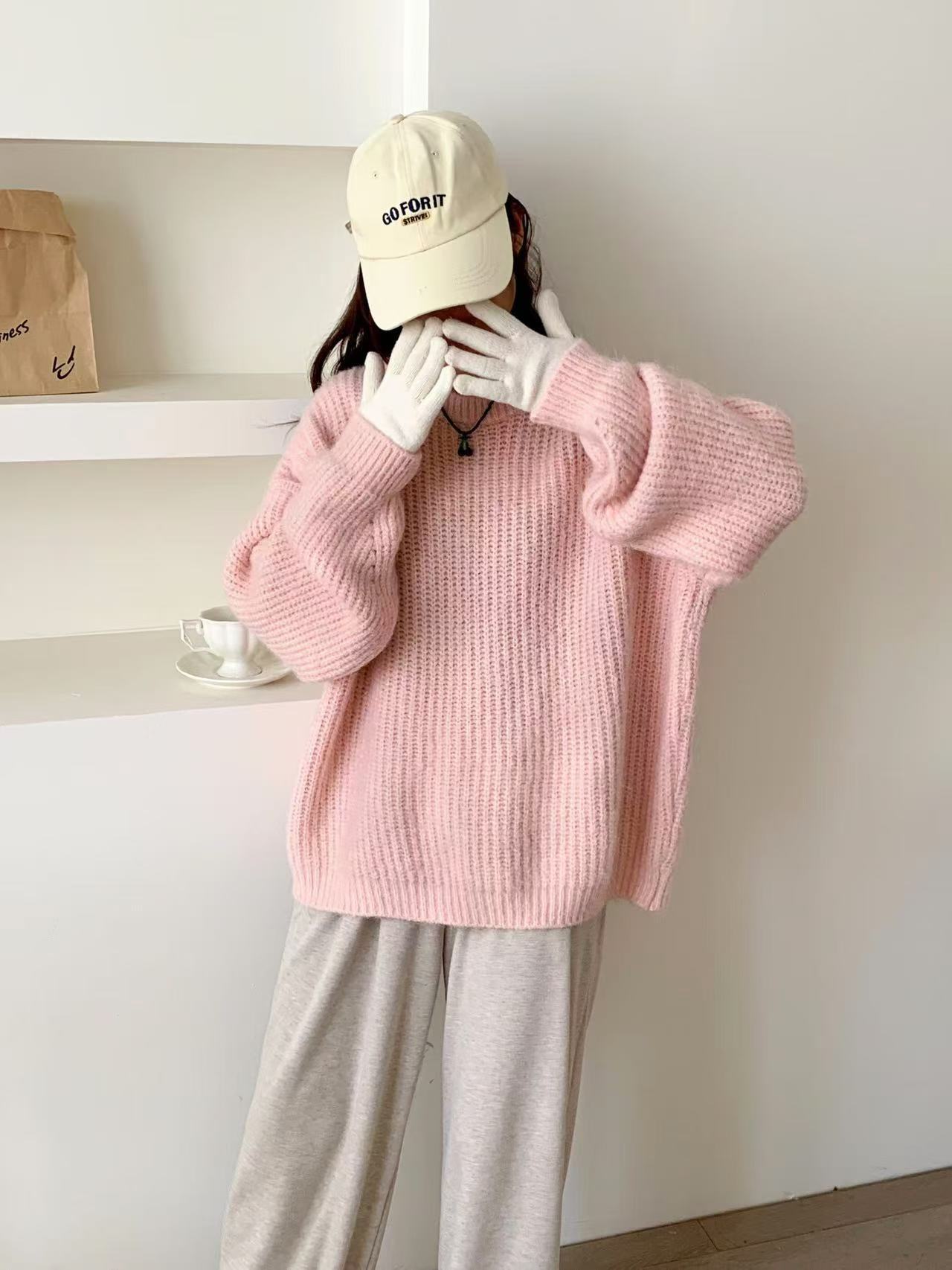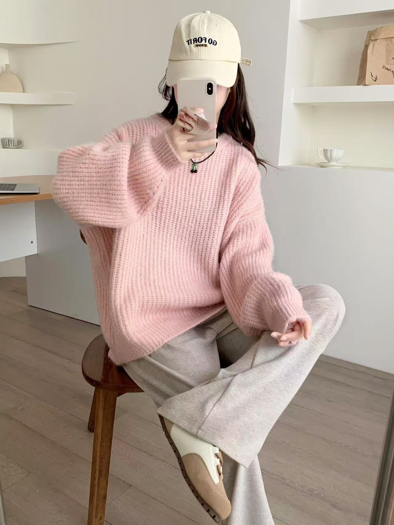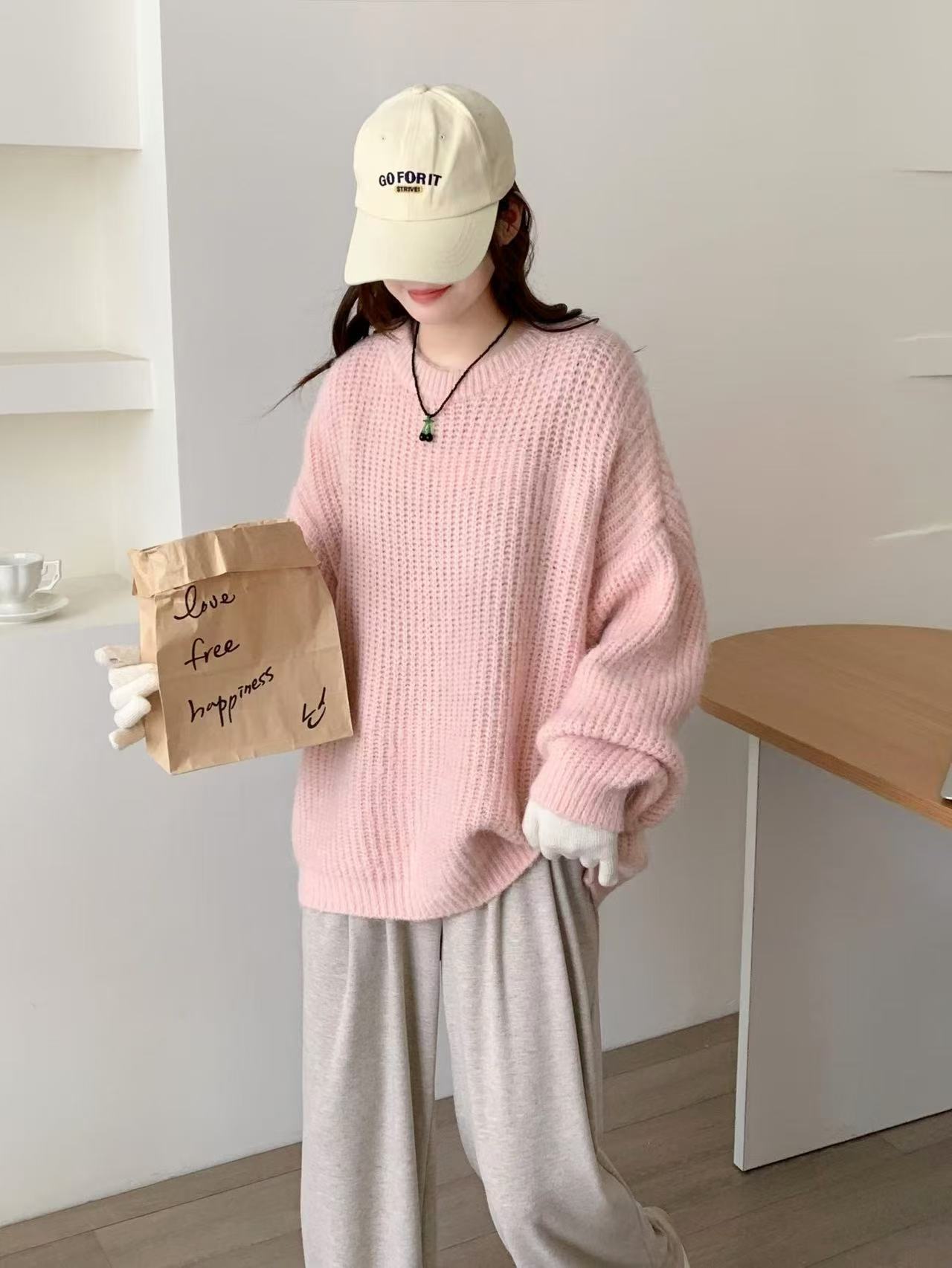 2024 Outono e Inverno Novo Estilo Preguiçoso Ceroso Macio Gola Redonda Pulôver Suéter Feminino Solto Doce Cor Doce Suéter Top