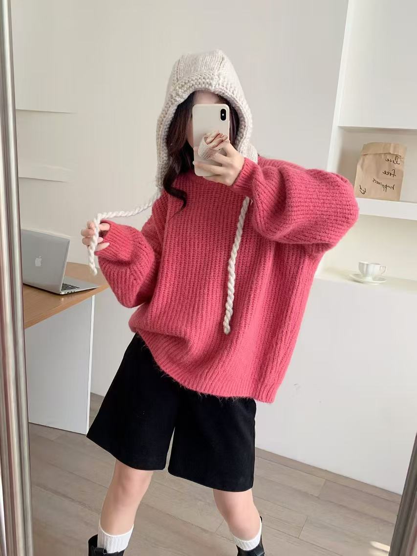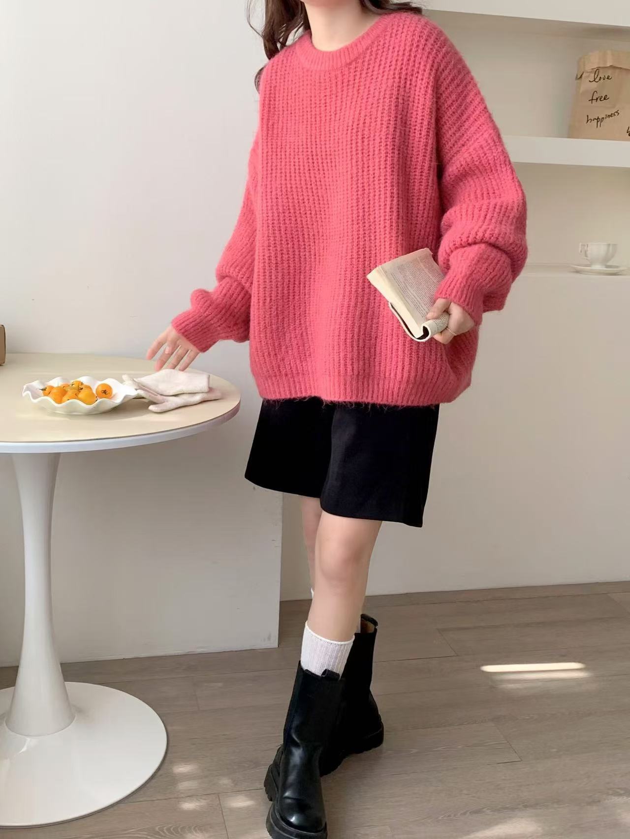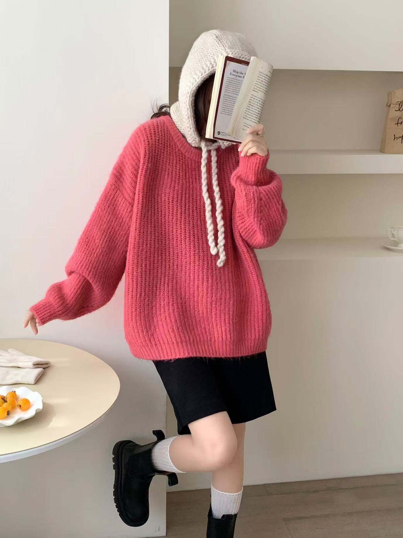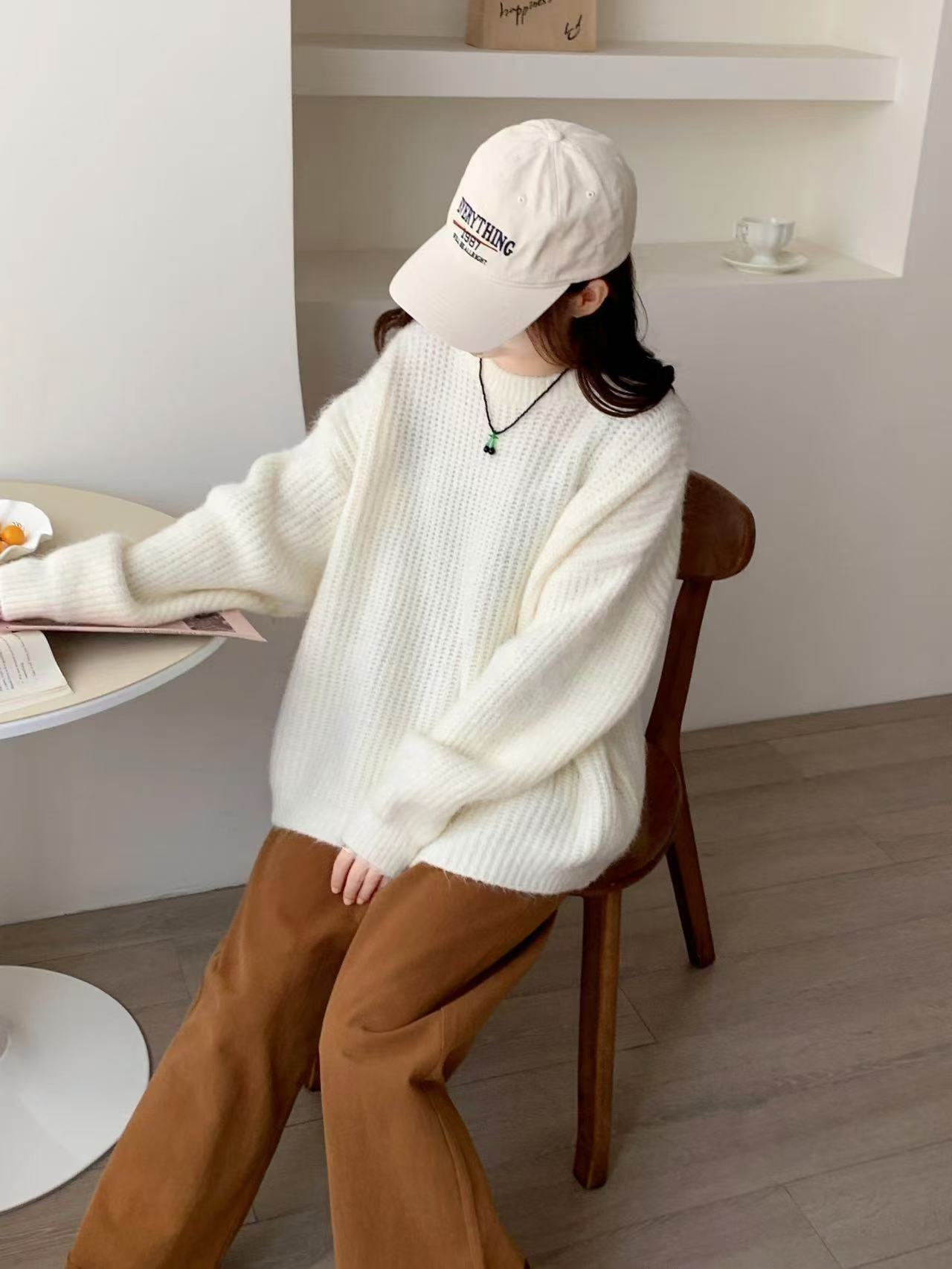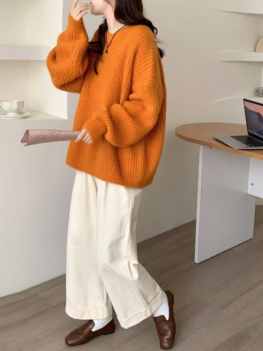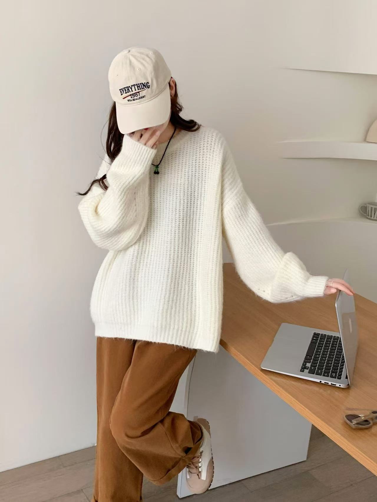 2024 Outono e Inverno Novo Estilo Preguiçoso Ceroso Macio Gola Redonda Pulôver Suéter Feminino Solto Doce Cor Doce Suéter Top