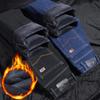 Outono e inverno jeans masculino cintura média reta slim stretch forrado de lã grosso solto negócios casual calças masculinas de meia-idade