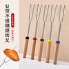 Cabo de madeira transfronteiriço em forma de U garfo telescópico para churrasco garfo grelhado de aço inoxidável asas de frango garfo para cachorro-quente ferramentas para churrasco de corda defumada