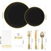 Conjunto de 17 Peças de Prato de Plástico Rígido com Borda Dourada Preta Prato de Jantar Descartável Faca, Garfo e Colher Fundo Branco Taça de Vinho com Borda Quente Amazon