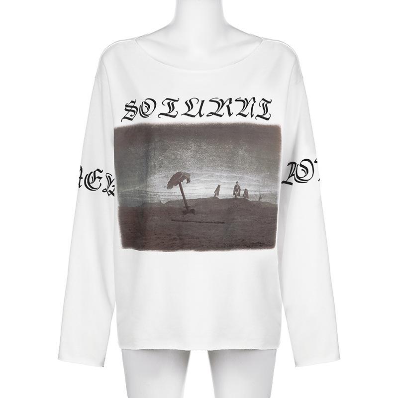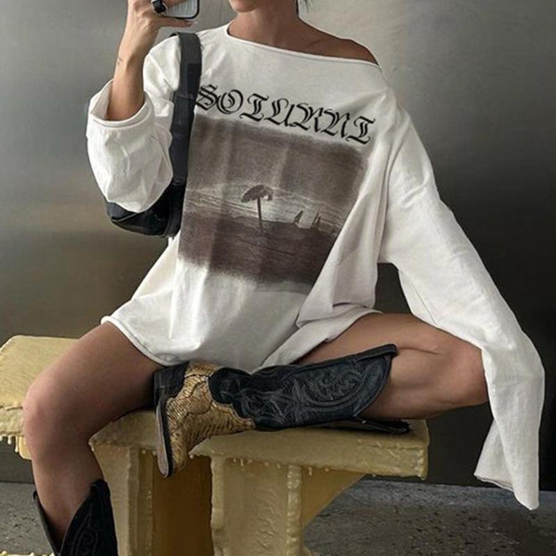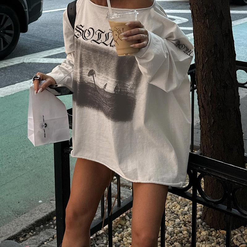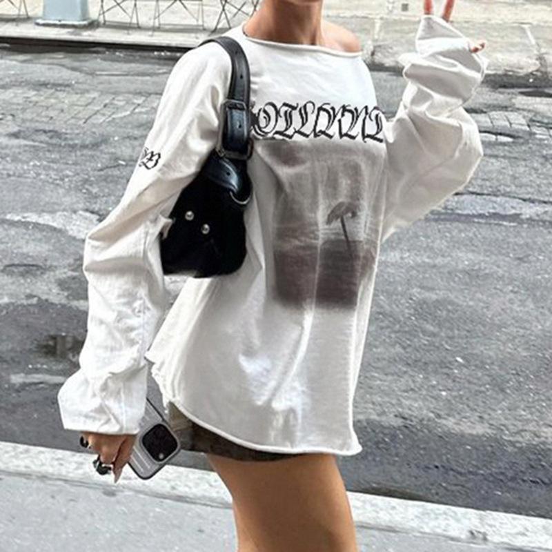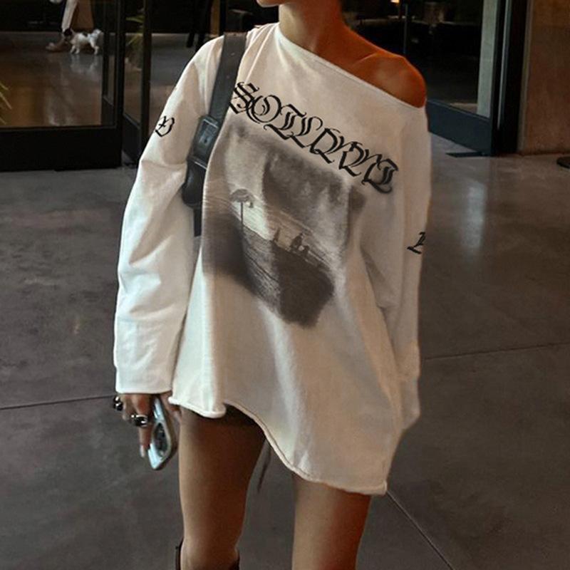 Outono 2024 Novo Estilo Americano Estilo Preguiçoso Ombro Aberto Solto Retro Estampado Moletom Feminino Casual Pulôver Manga Longa Camiseta