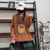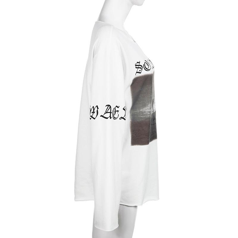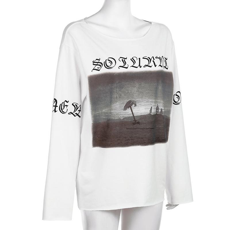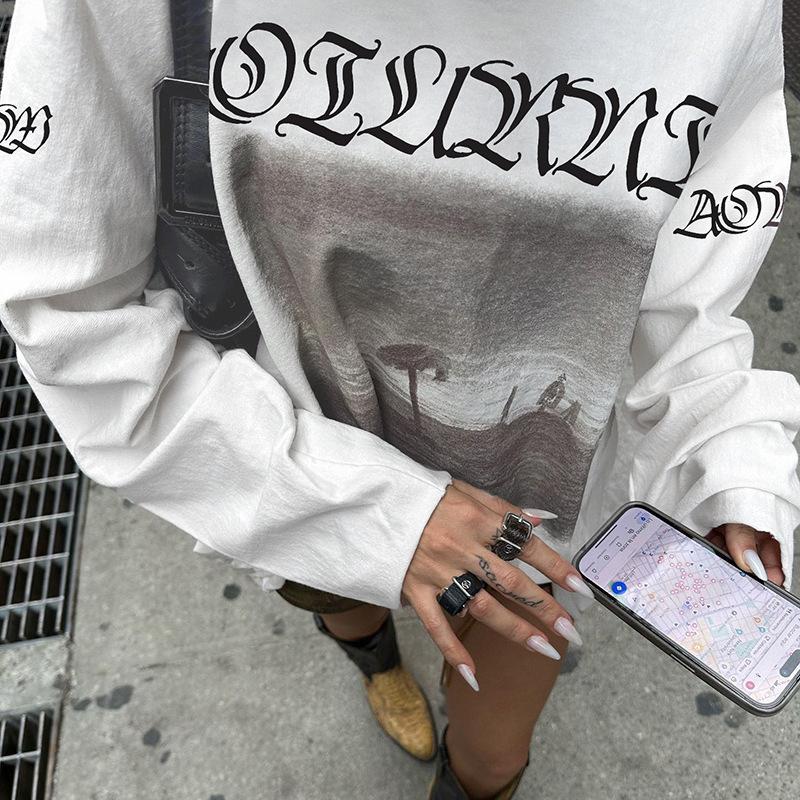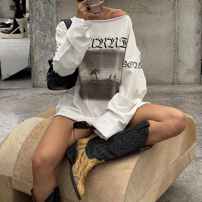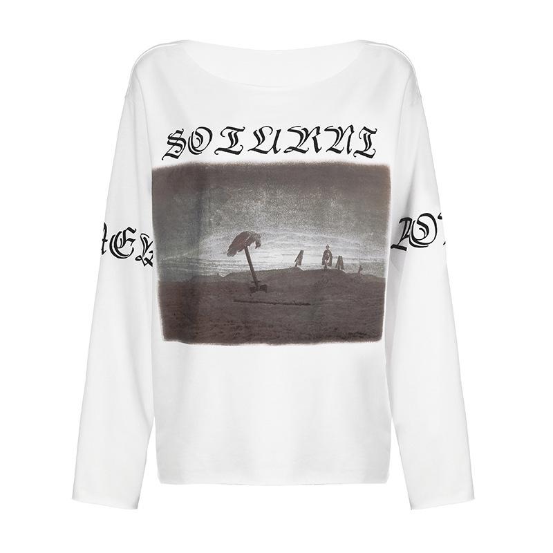 Outono 2024 Novo Estilo Americano Estilo Preguiçoso Ombro Aberto Solto Retro Estampado Moletom Feminino Casual Pulôver Manga Longa Camiseta