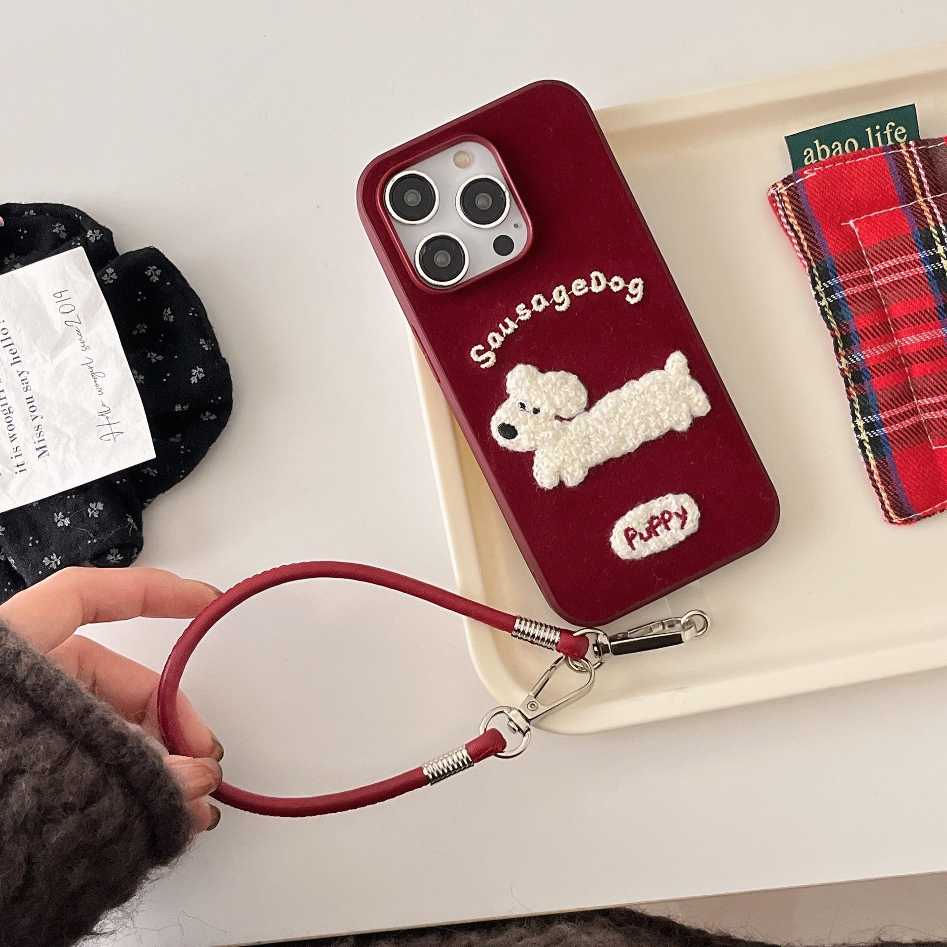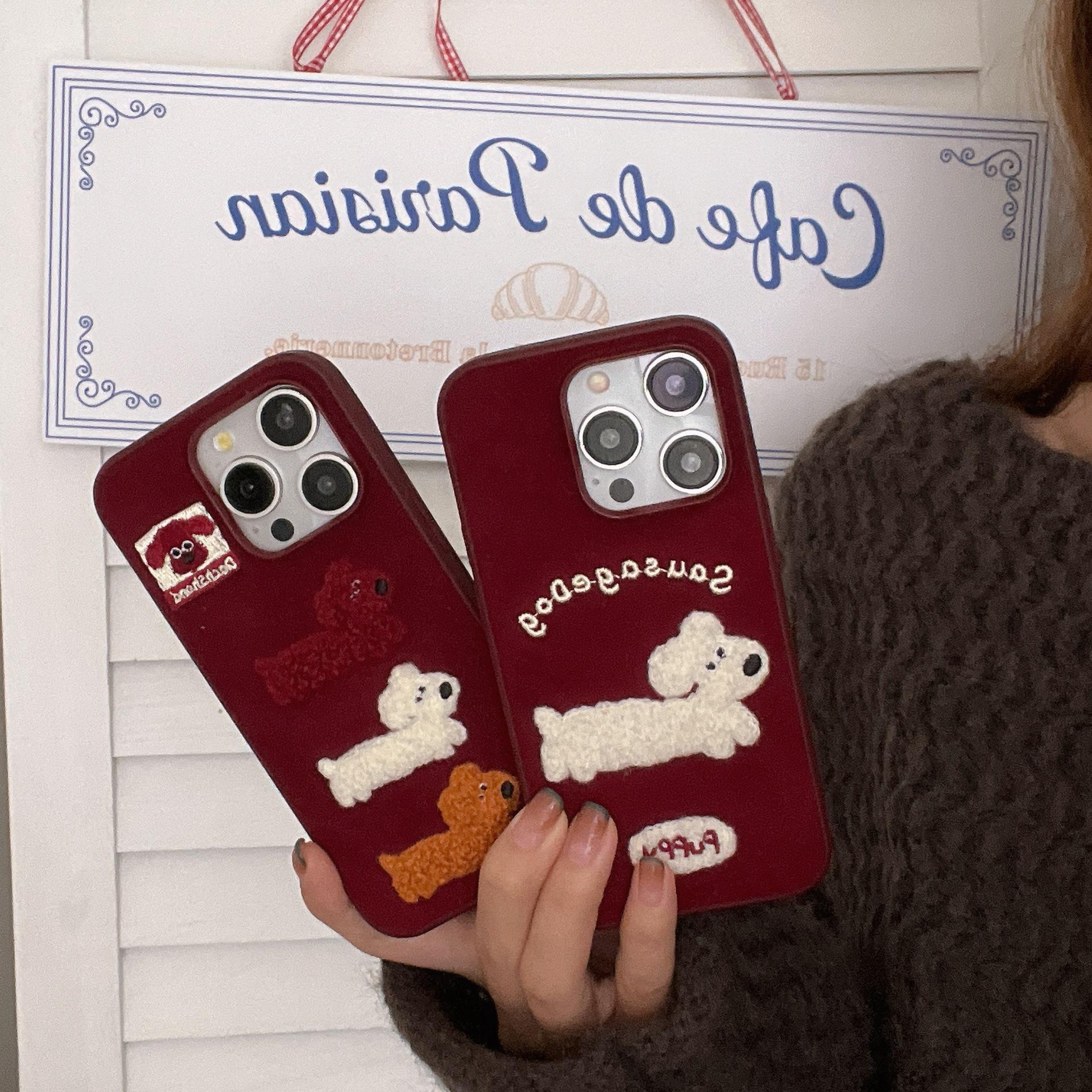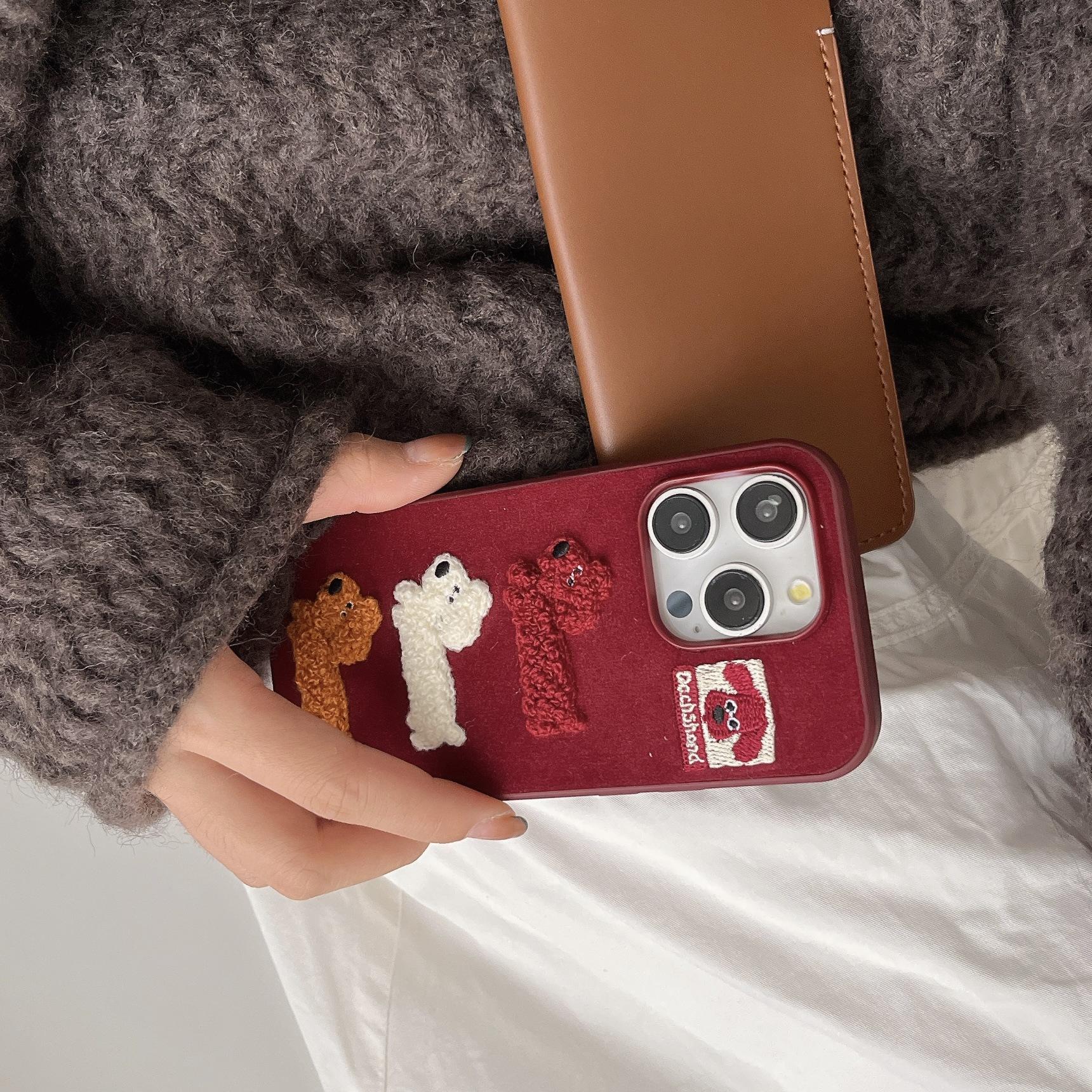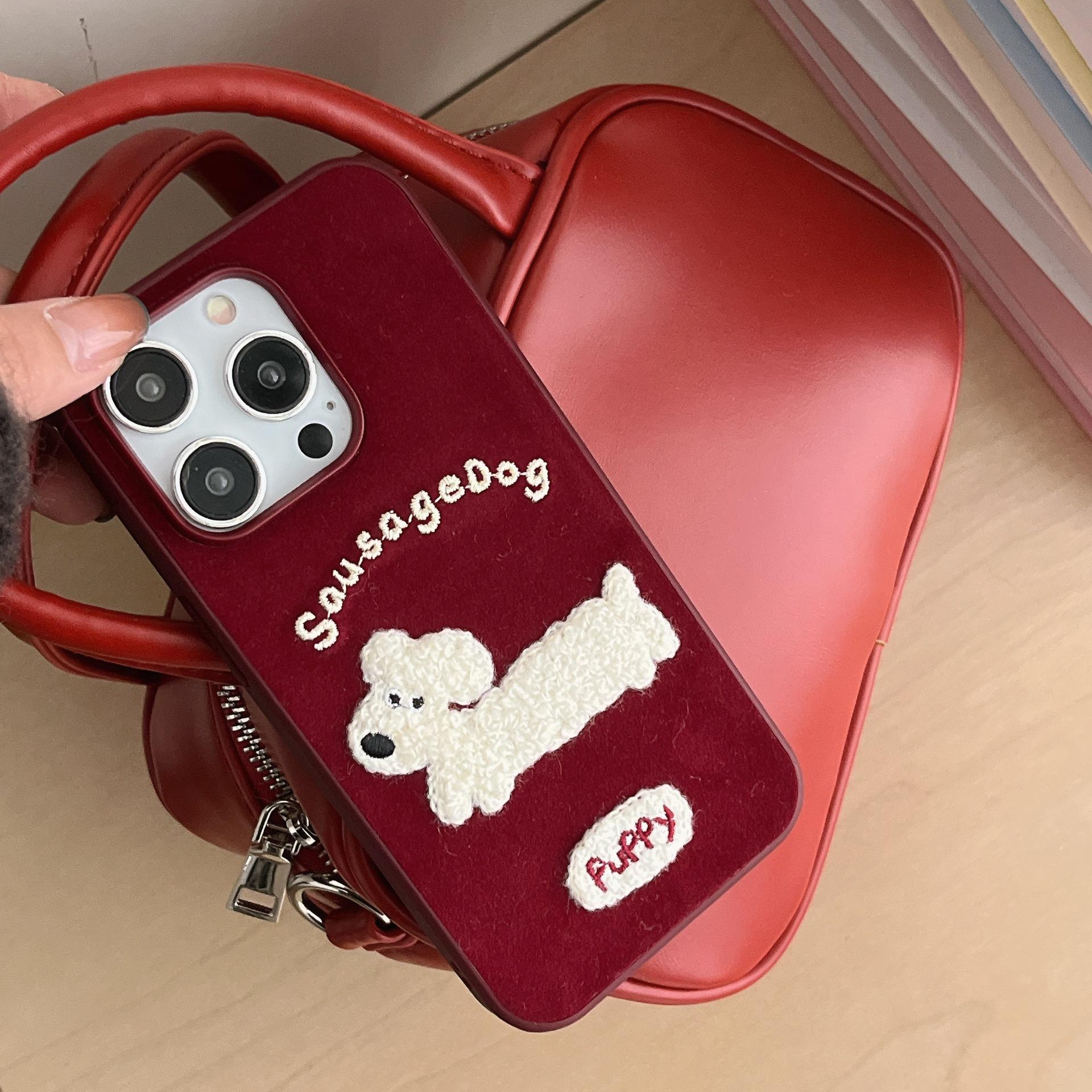 Filhote Bordado Fofo Adequado para Capa de Celular Apple 17Promax Iphone16 Vermelho Festivo 14 Portátil 15 Desenho Animado