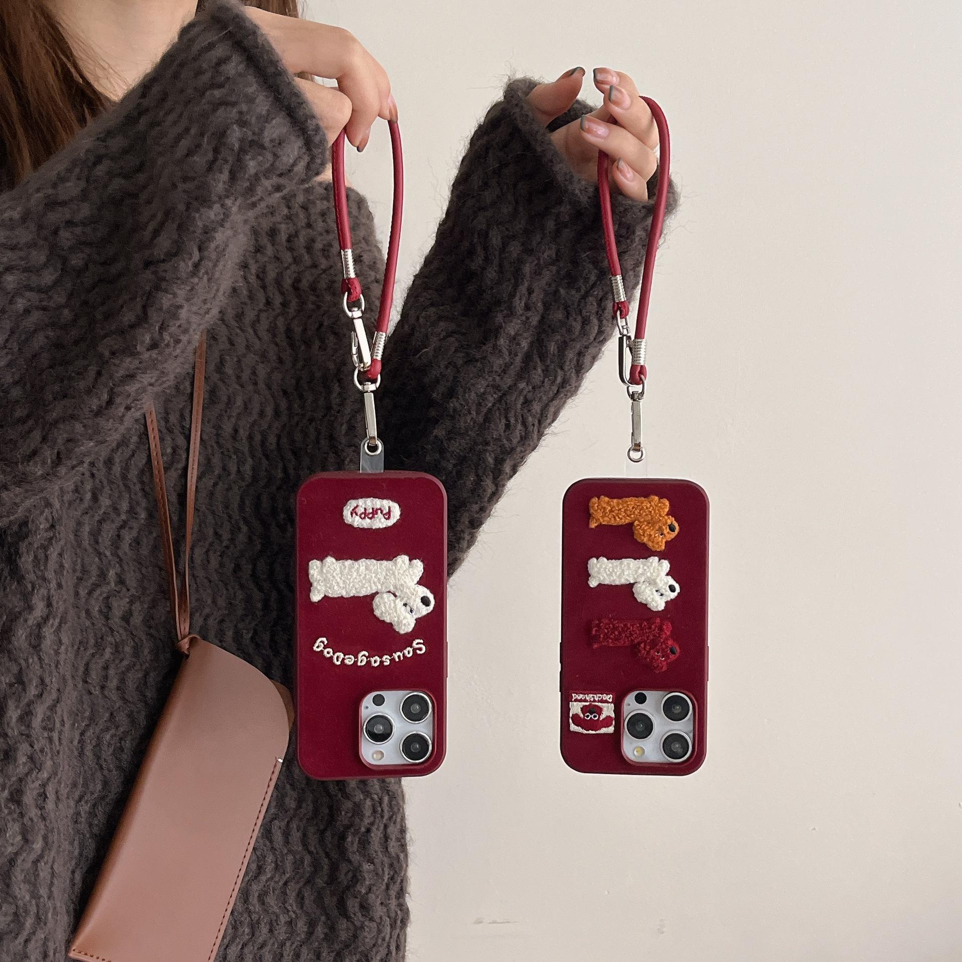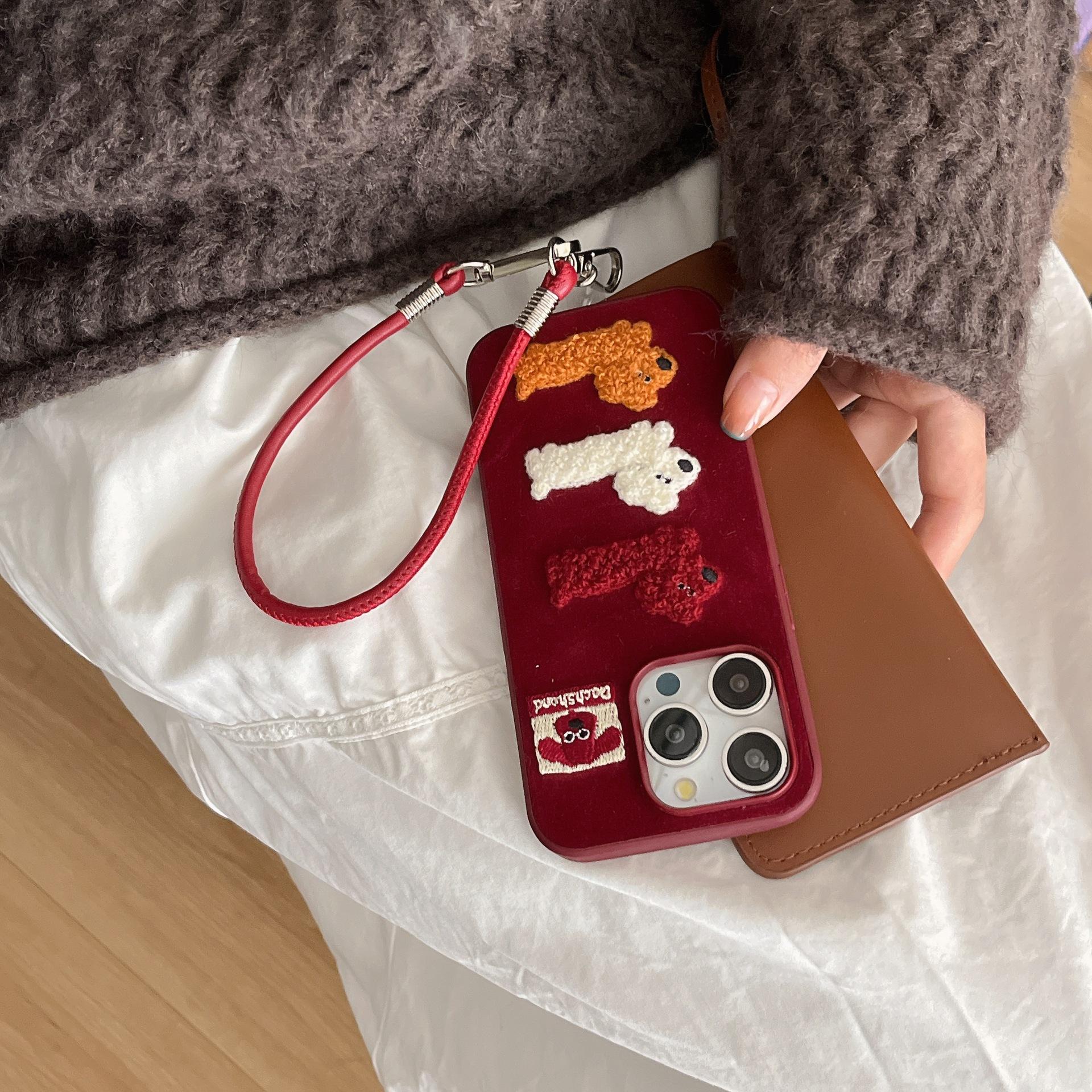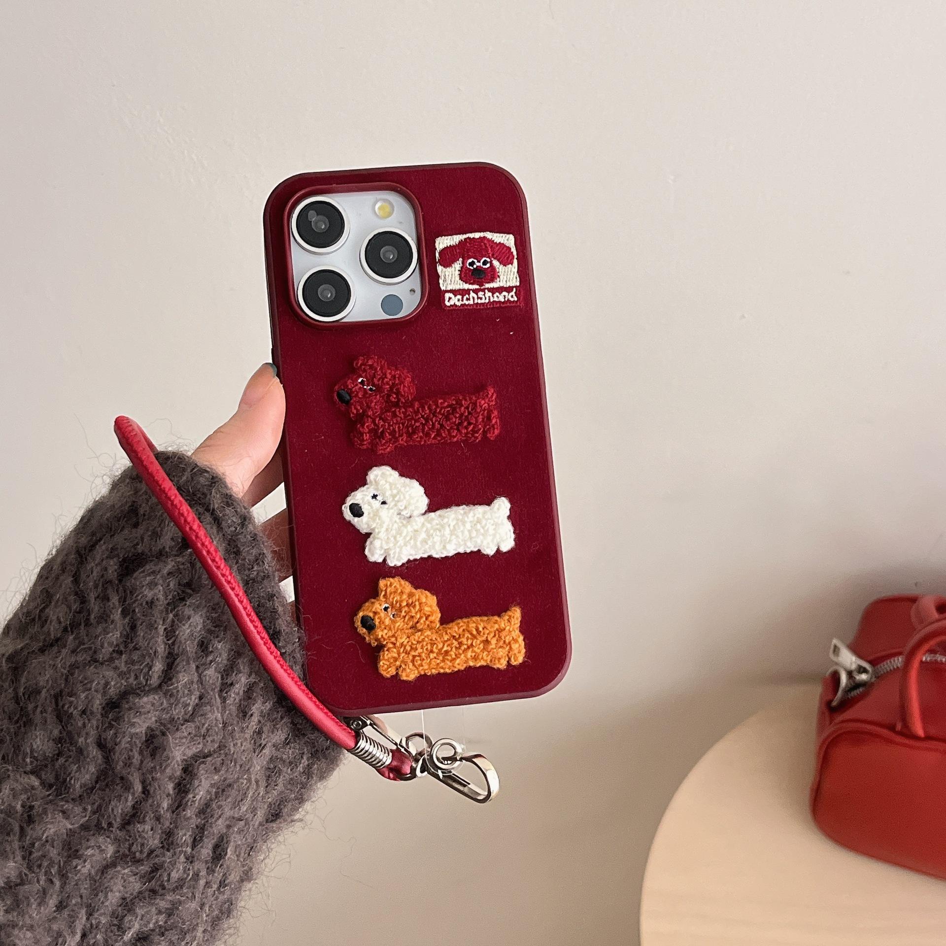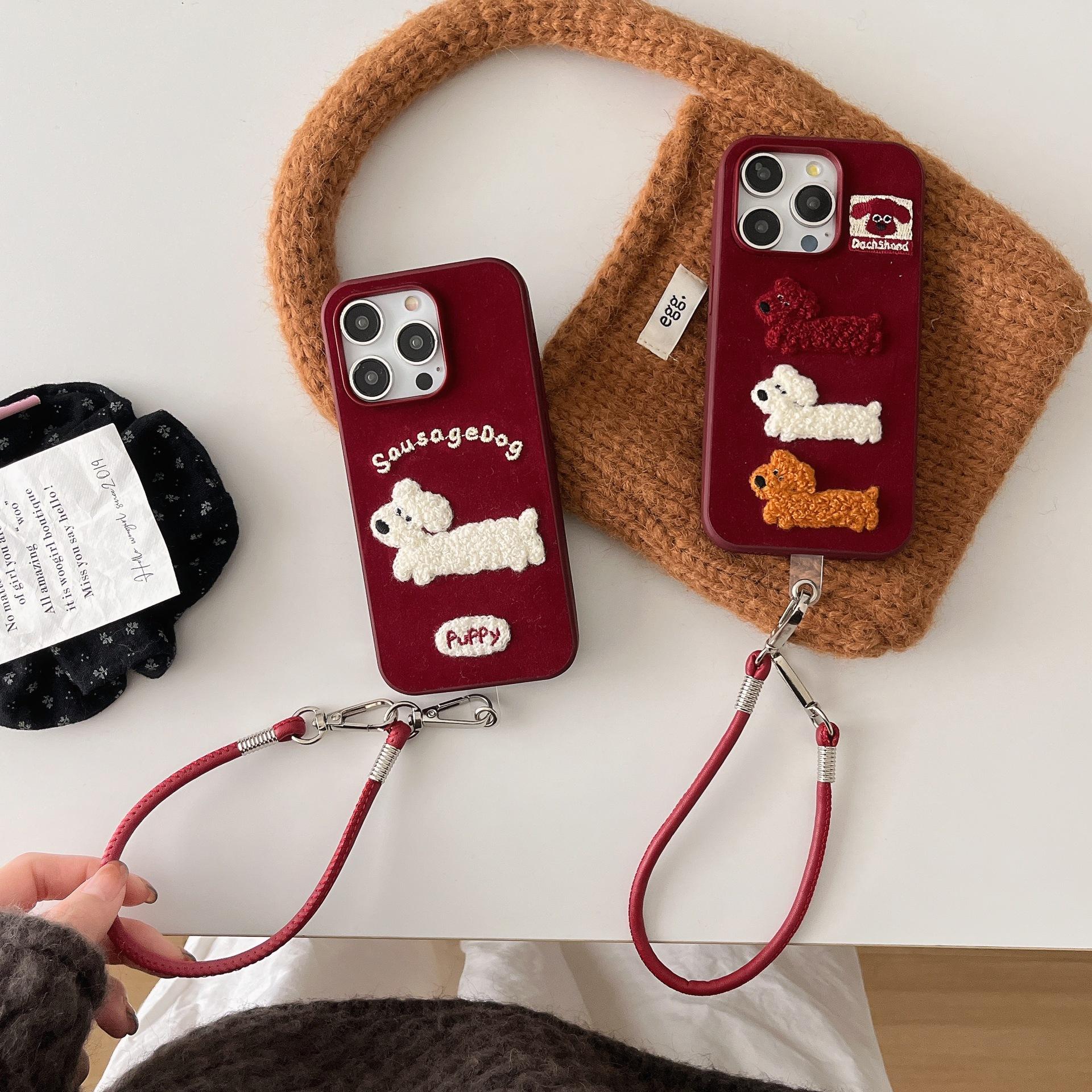 Filhote Bordado Fofo Adequado para Capa de Celular Apple 17Promax Iphone16 Vermelho Festivo 14 Portátil 15 Desenho Animado