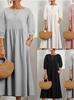 2025 Novo Vestido Feminino Europeu e Americano Amazon Cor Sólida Moda Manga Lanterna Solto Algodão e Linho com Bolso Pronto para Entrega