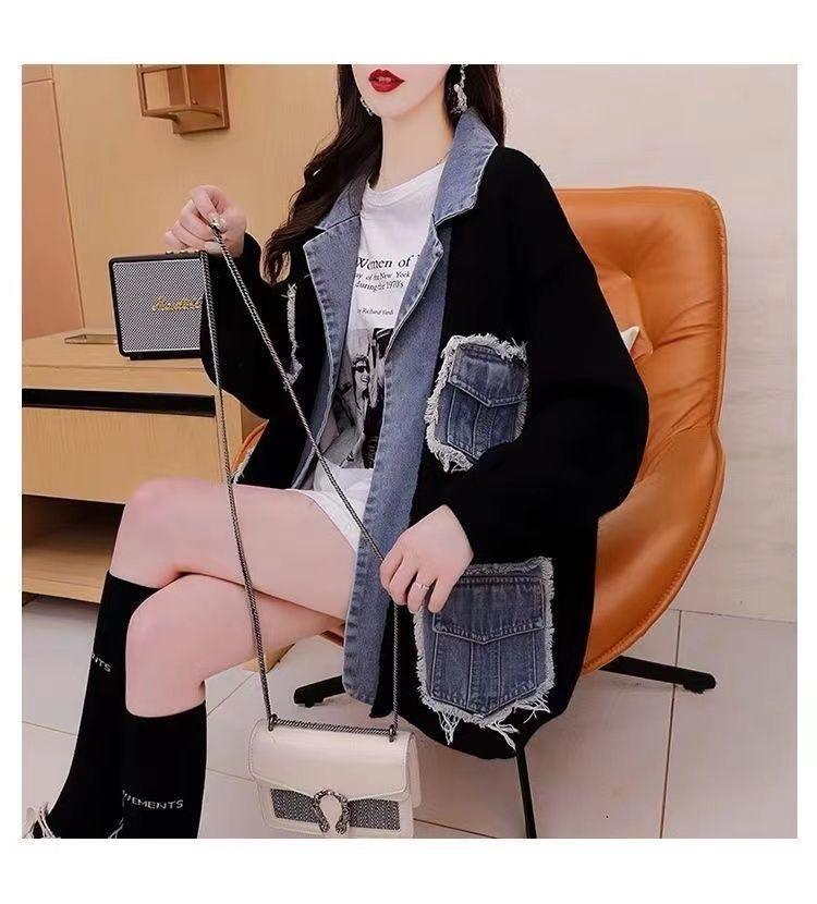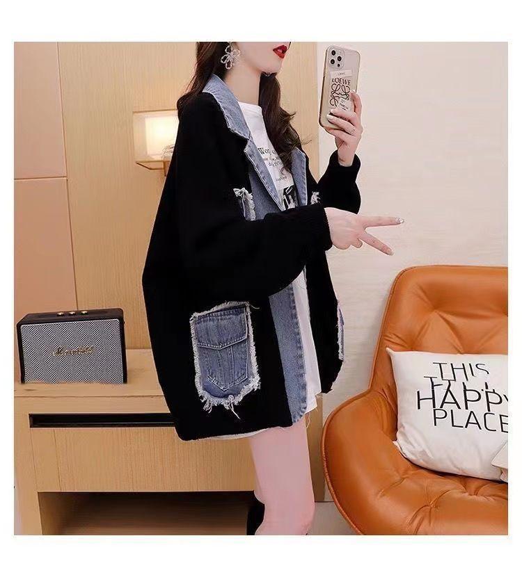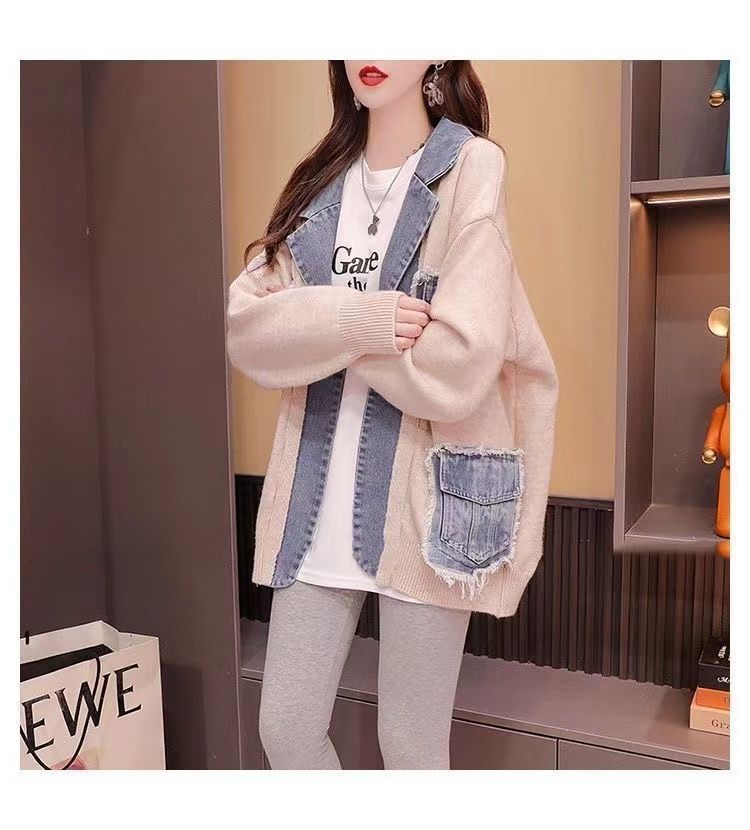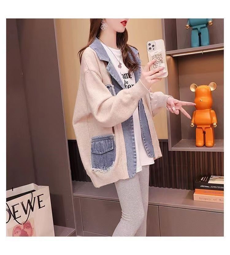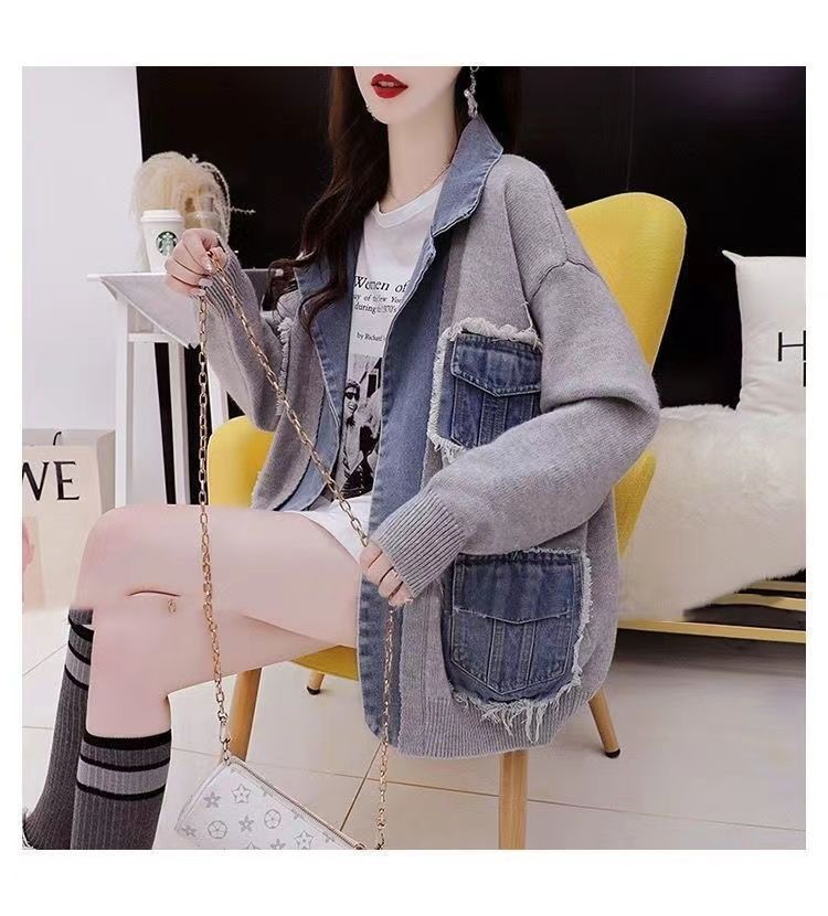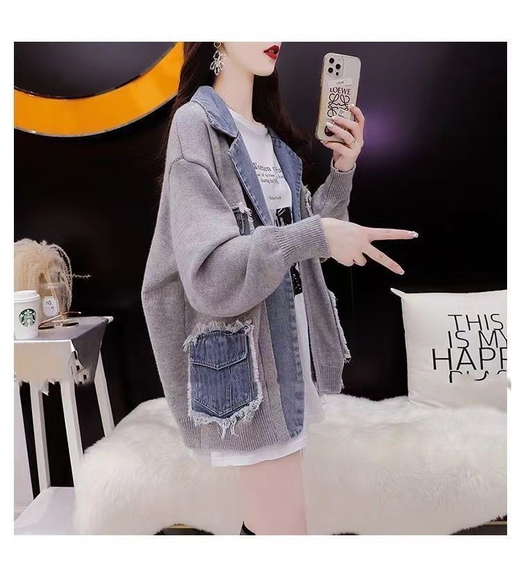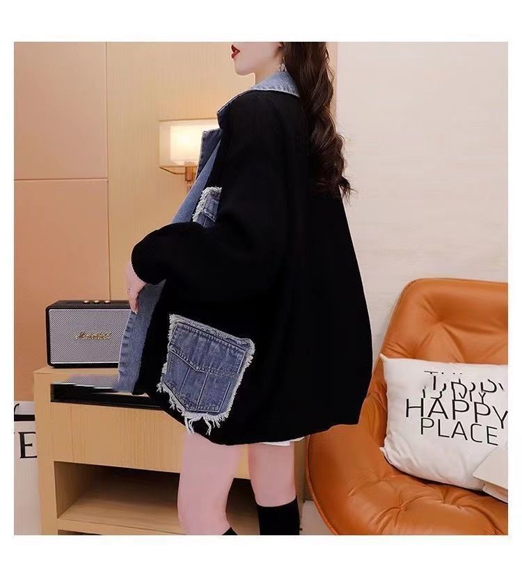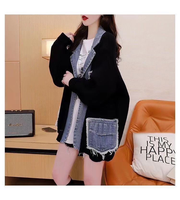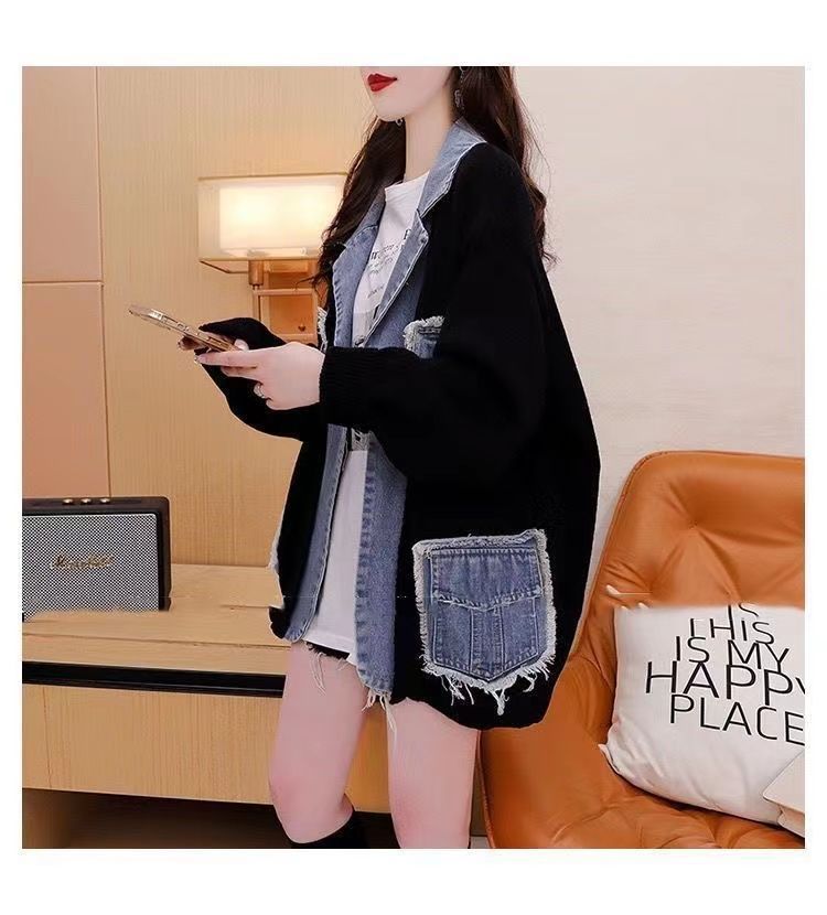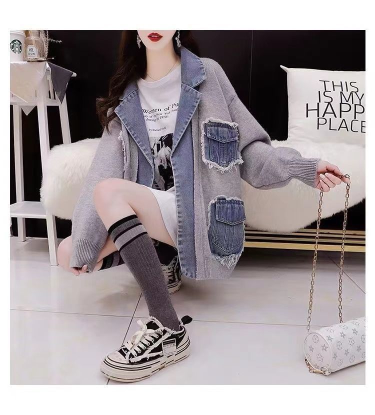 Indústria Pesada Denim Costura Suéter Cardigan Feminino 2023 Novo Outono e Inverno Solto Lazy Design Sense Jaqueta de Malha