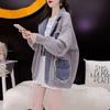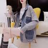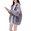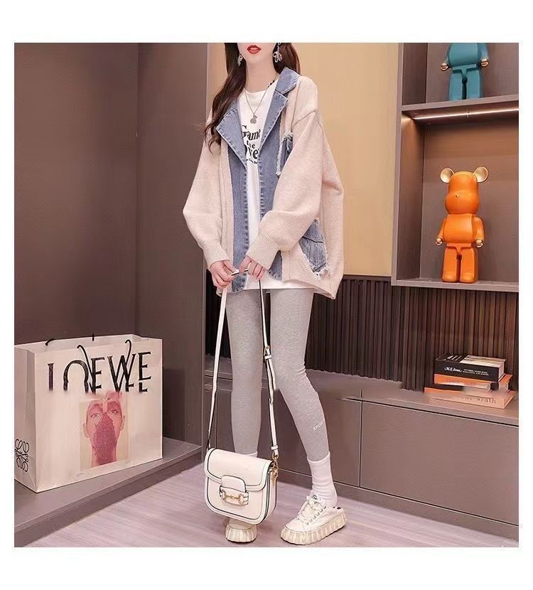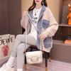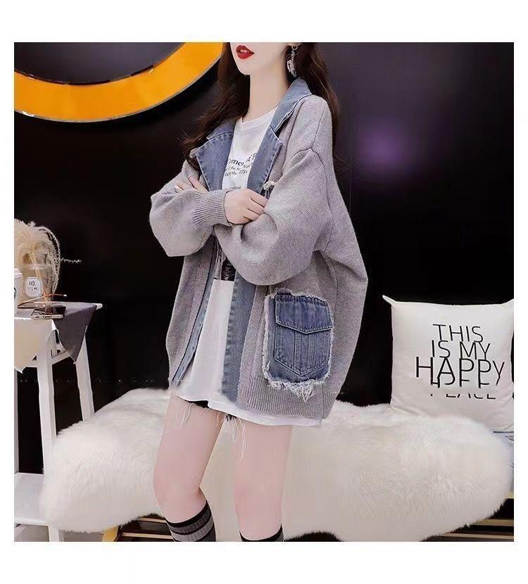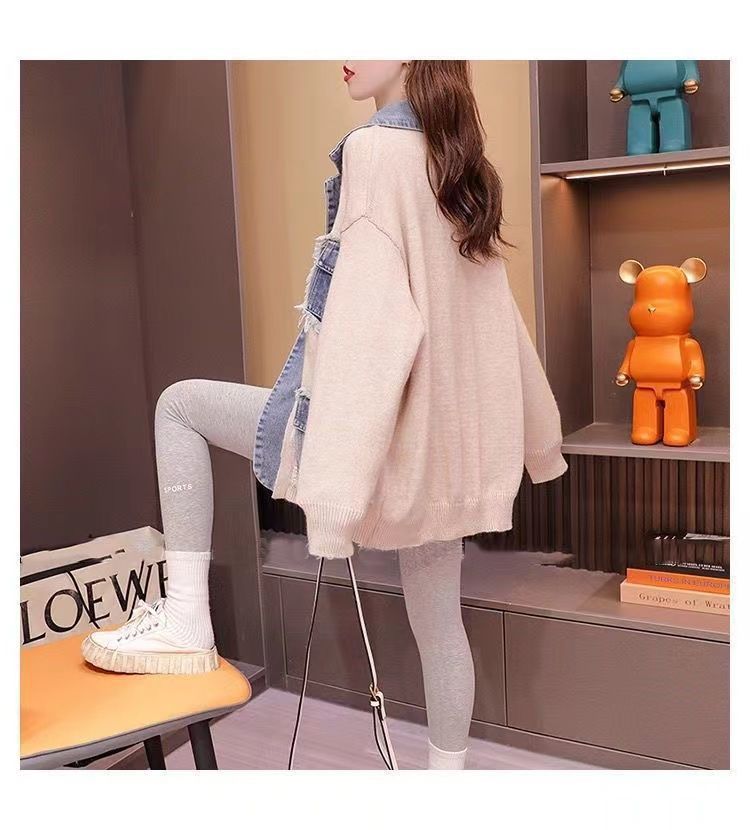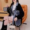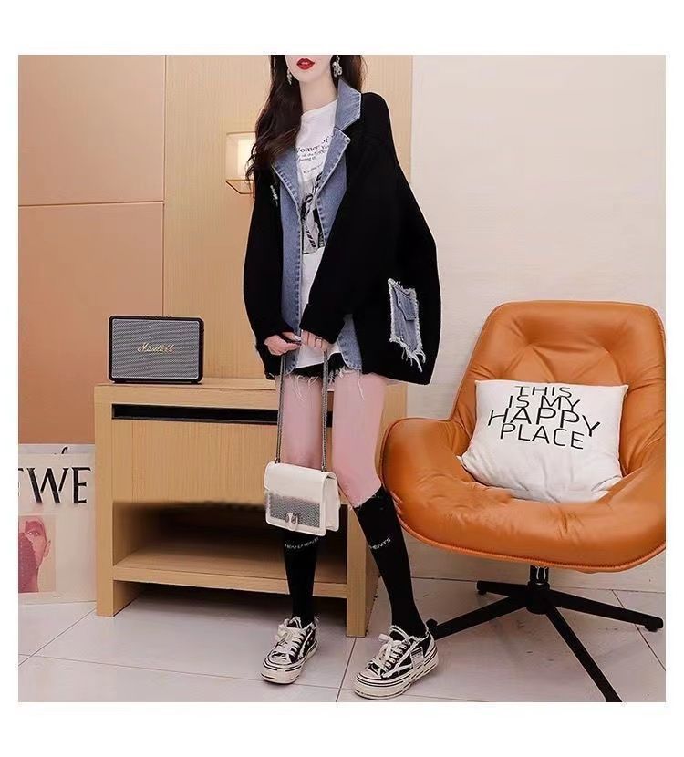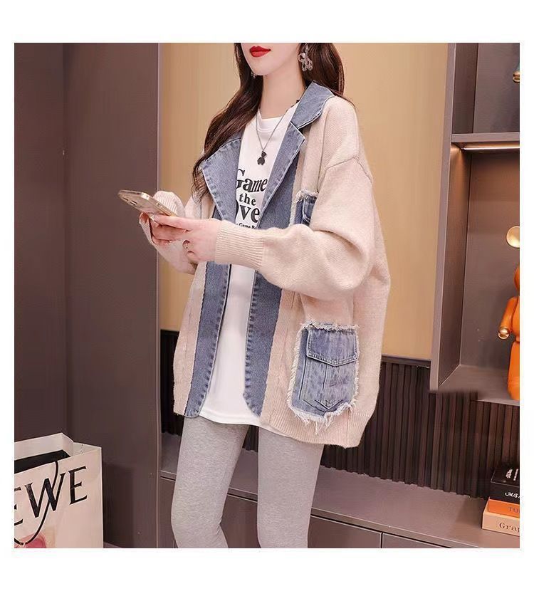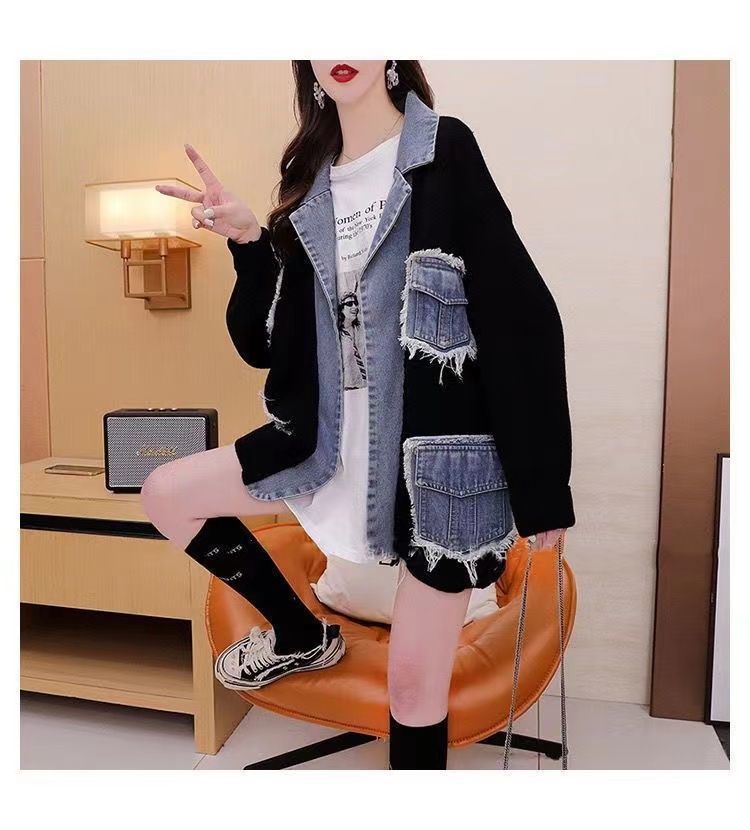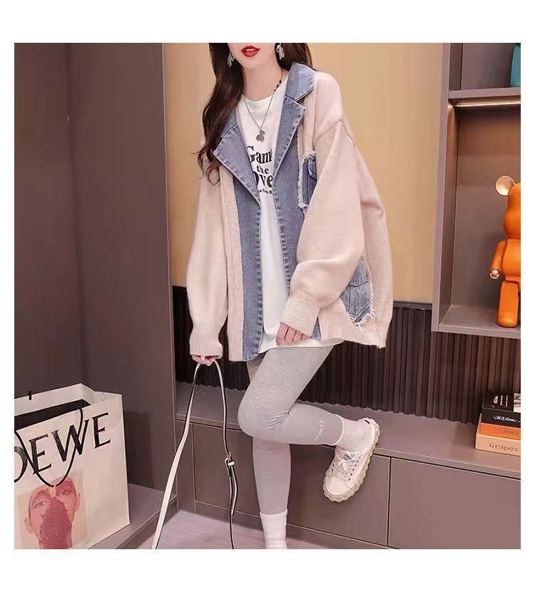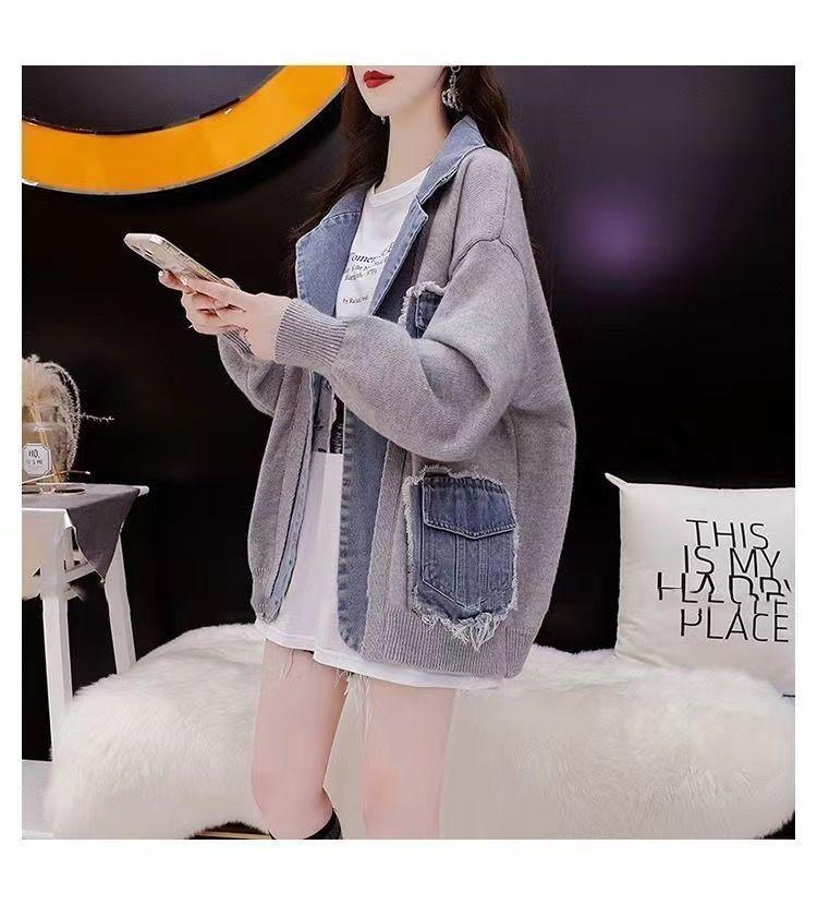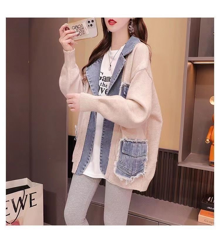Indústria Pesada Denim Costura Suéter Cardigan Feminino 2023 Novo Outono e Inverno Solto Lazy Design Sense Jaqueta de Malha