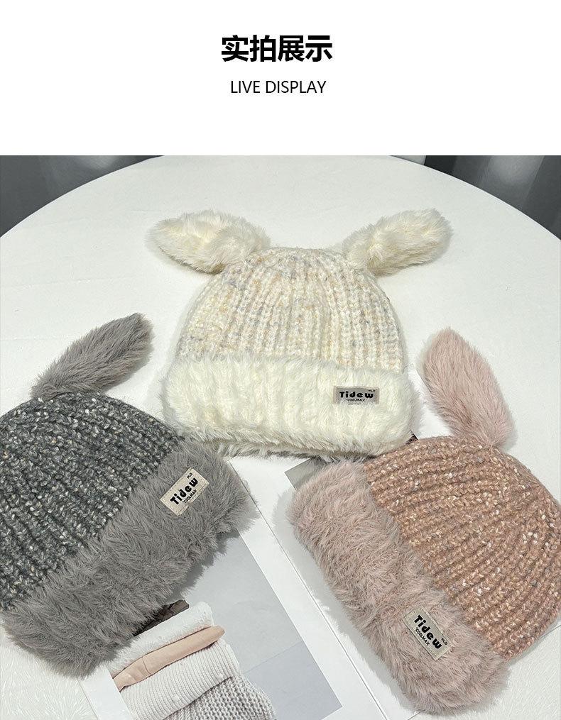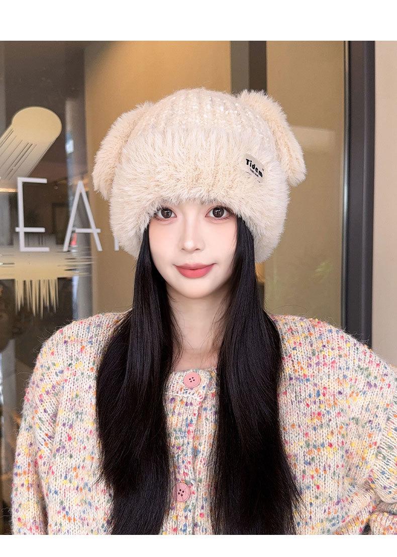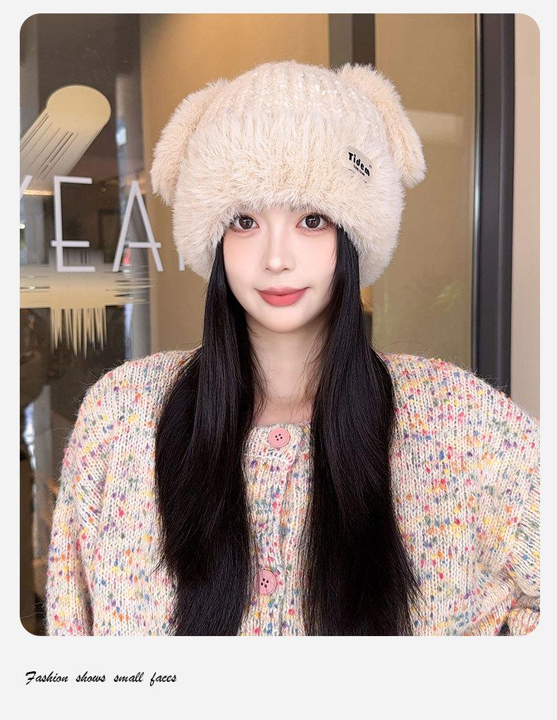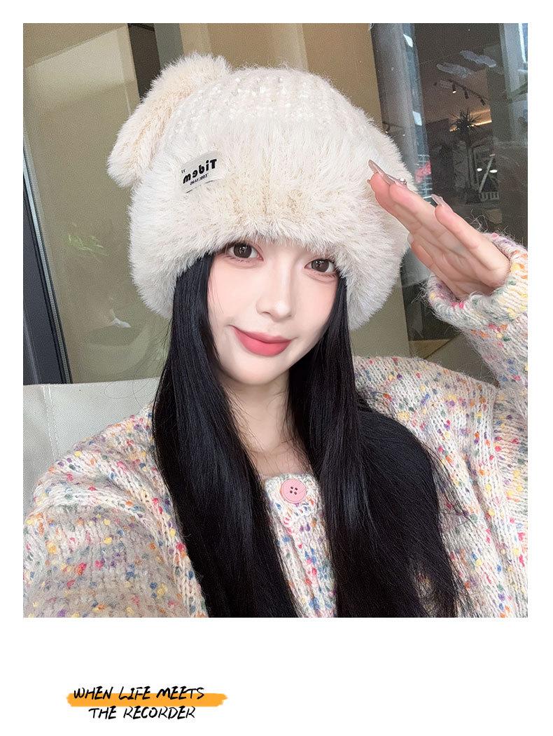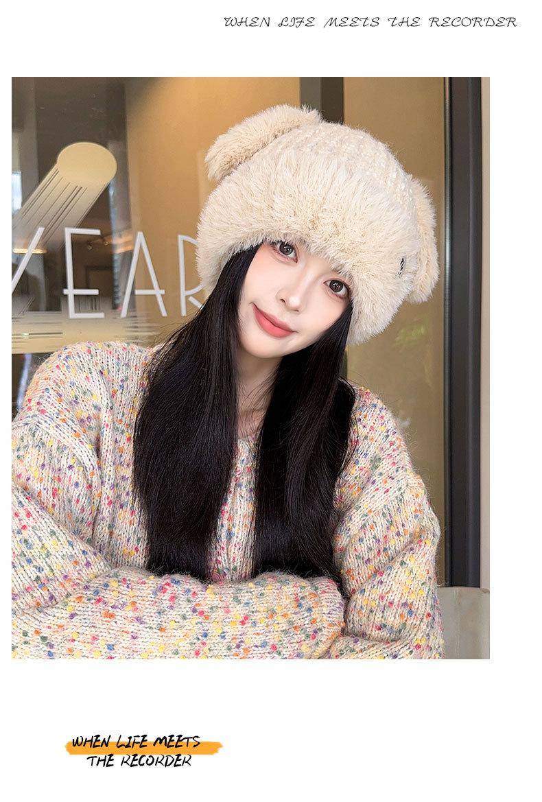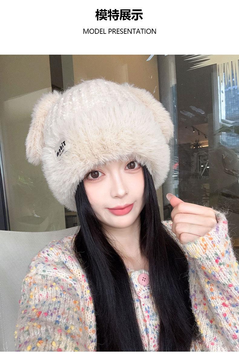 Chapéu de Outono e Inverno Feminino Novo Chapéu de Lã Quente com Forro de Lã e Orelha de Coelho Espessado para Exteriores Chapéu de Pelúcia Pequeno Chapéu de Malha