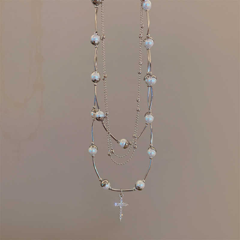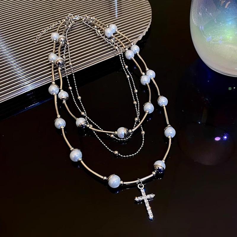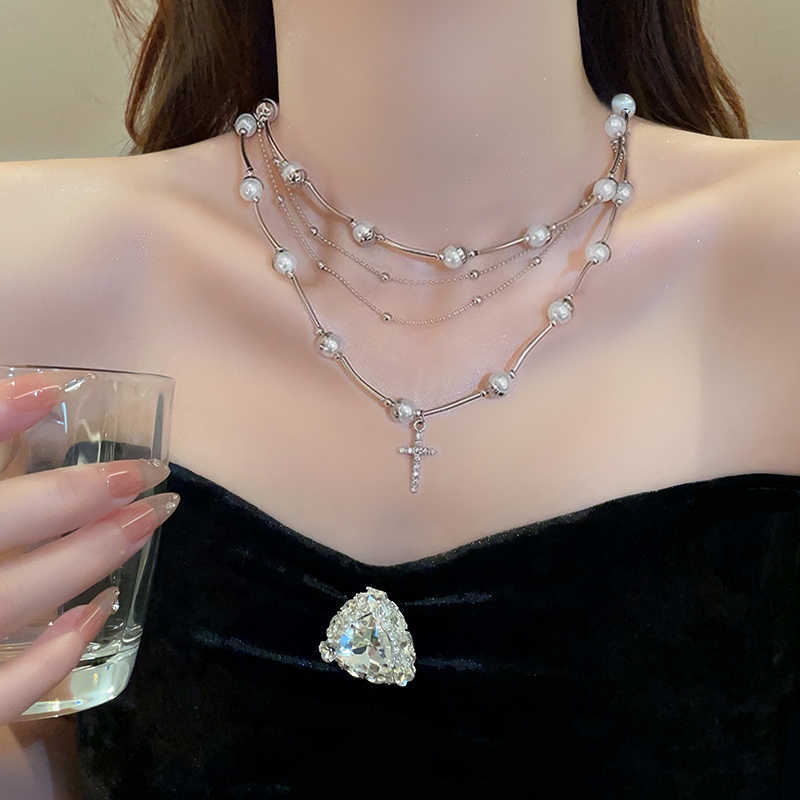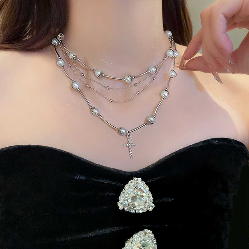Sweet Cool Spice Girl Multi-camadas Empilhadas Pérola Cruz Colar Feminino Nicho Vintage Clavícula Corrente Elegante Colar De Alta Qualidade Corrente