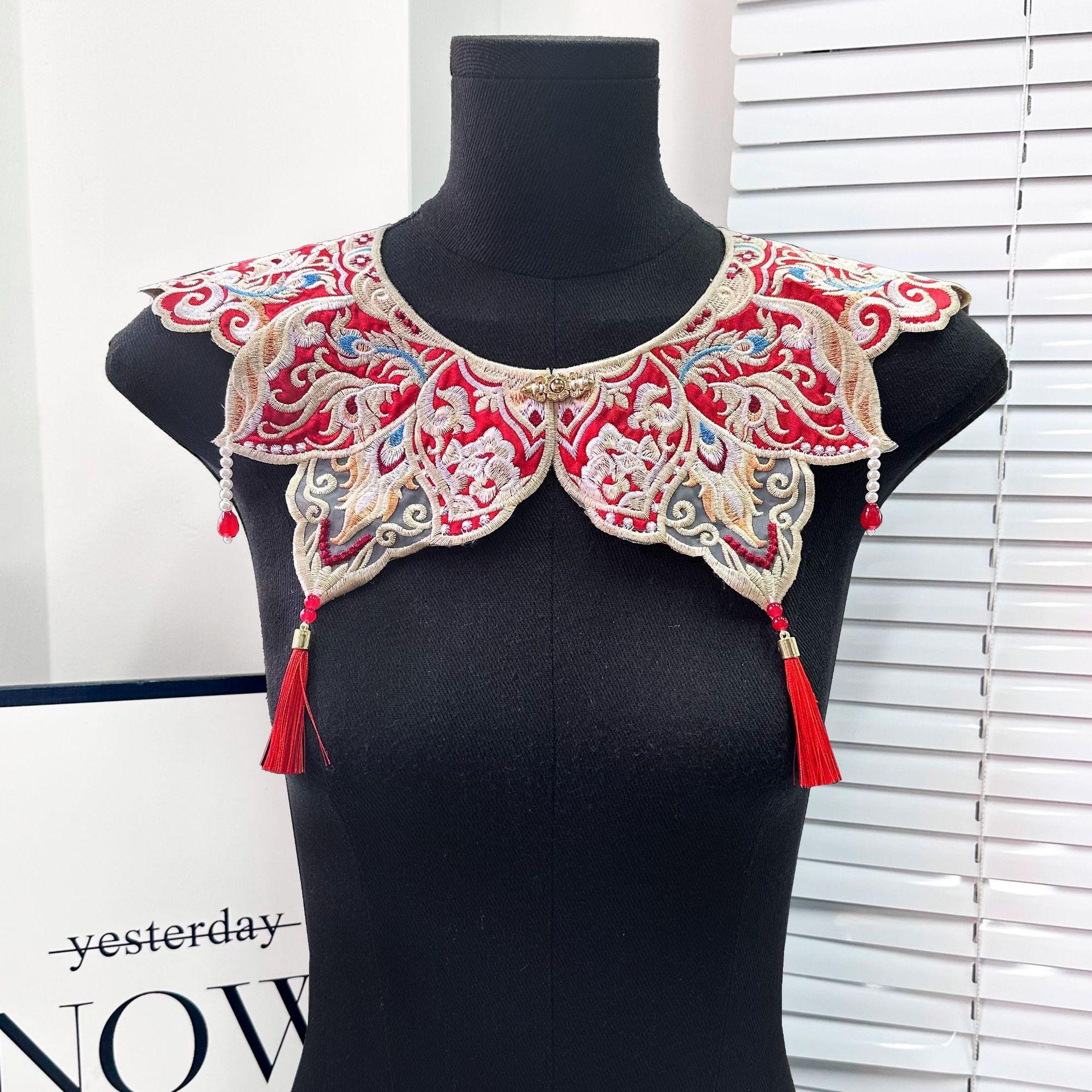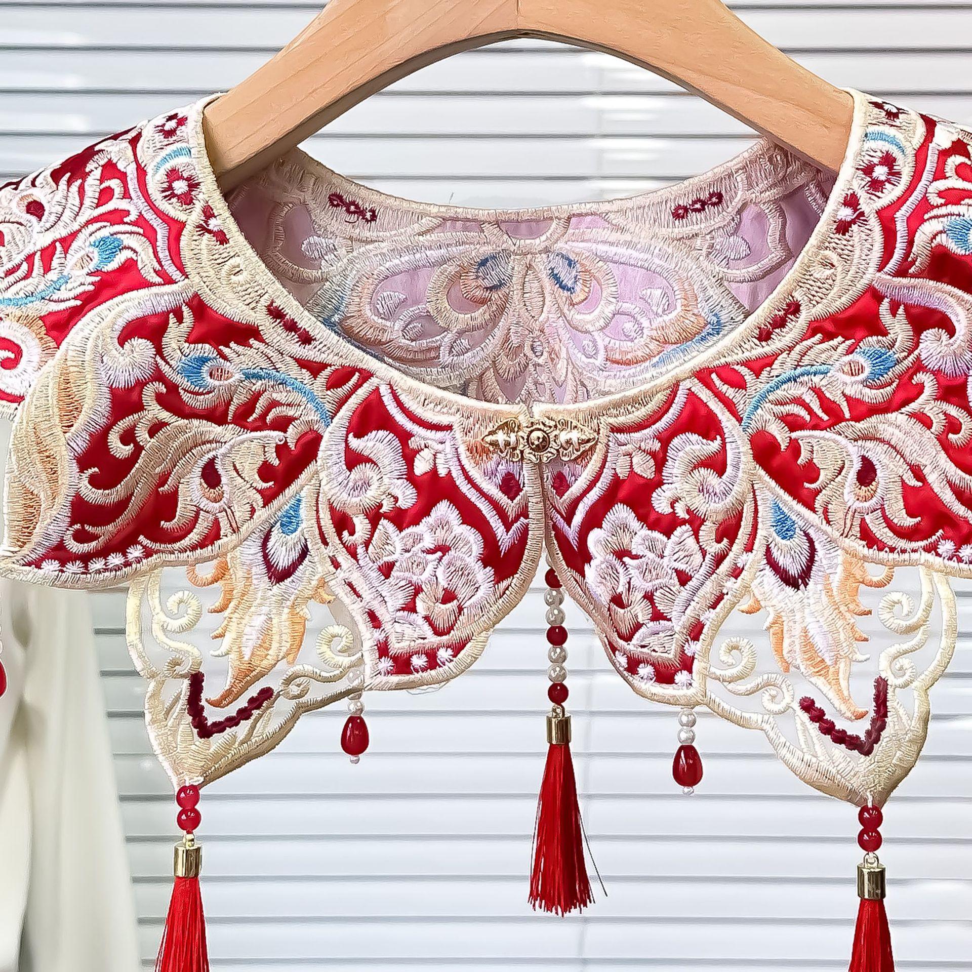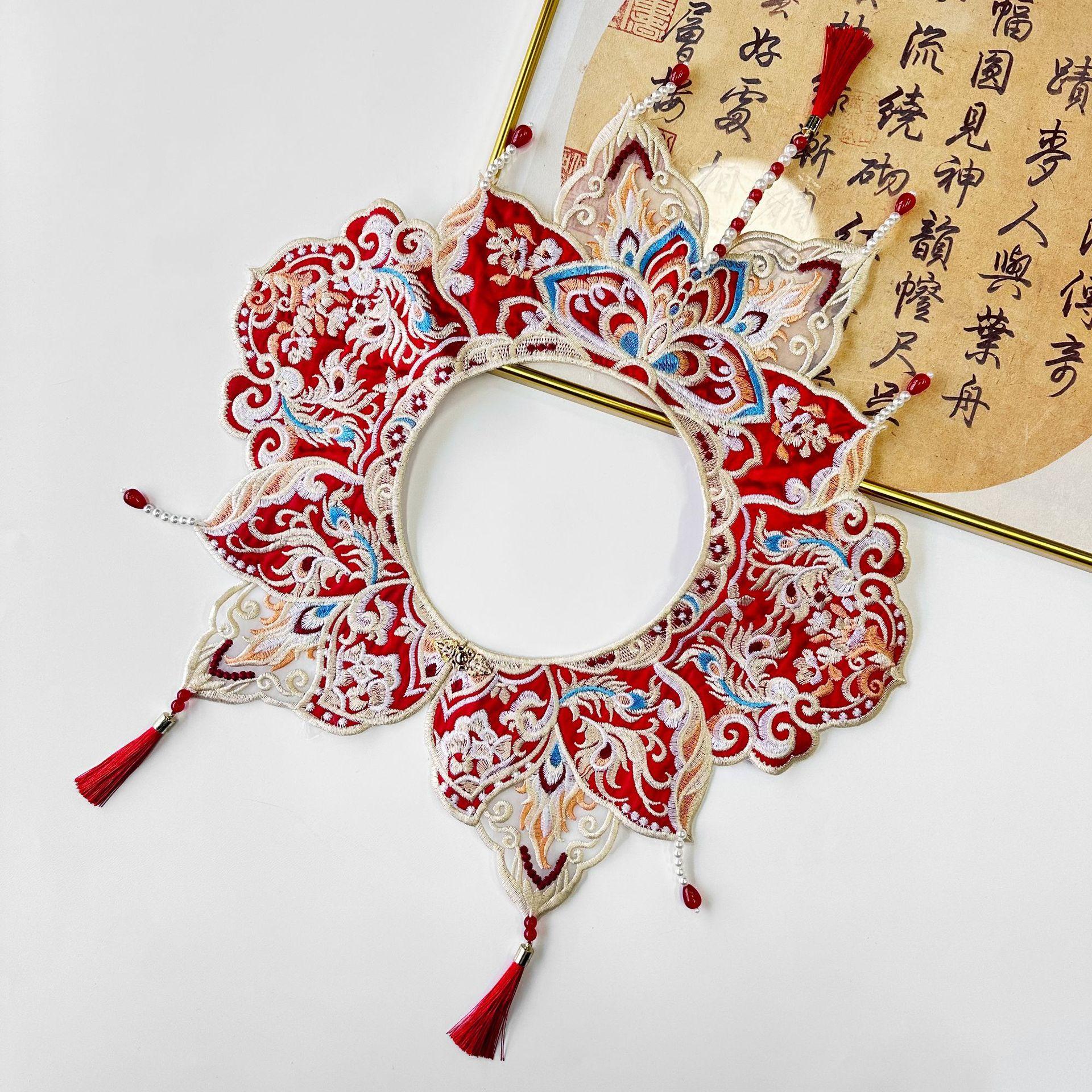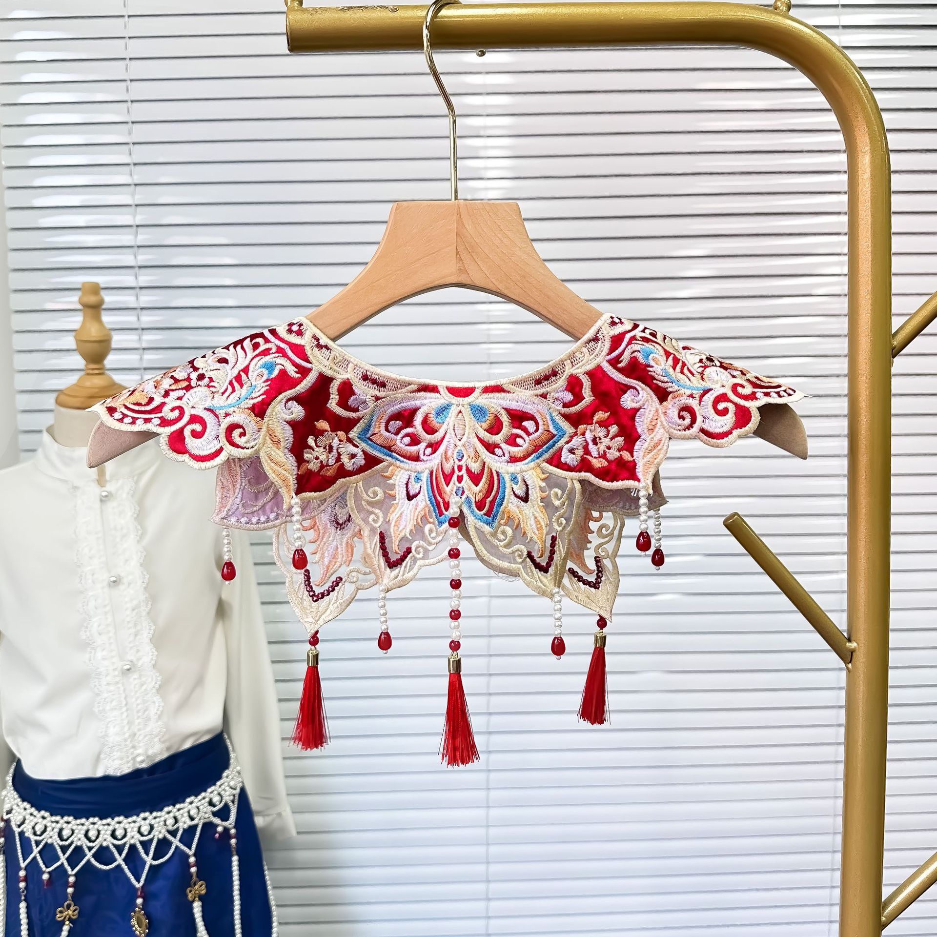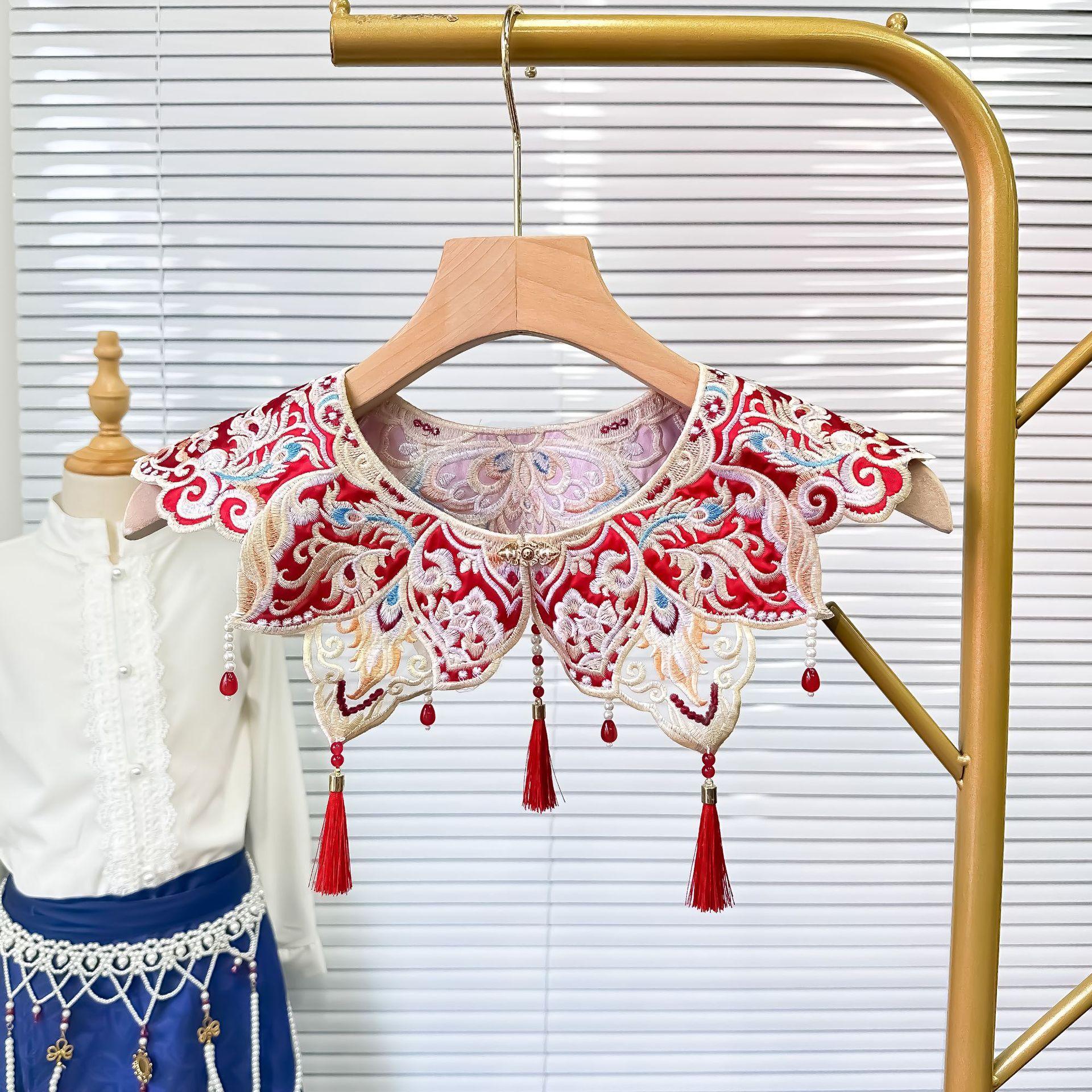 Estilo étnico vermelho Hanfu Nuvem Ombro Quatro Estações Universal Combinando Feminino Novo Estilo Chinês Saia de Cara de Cavalo Pingente de Borla Gola Falsa Gola Falsa