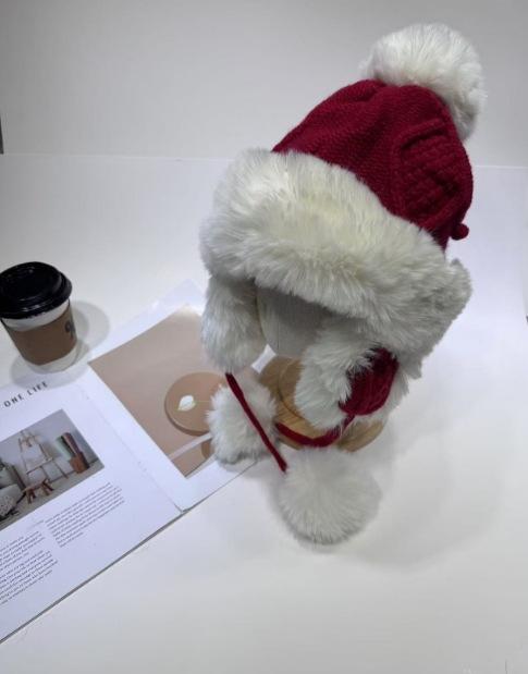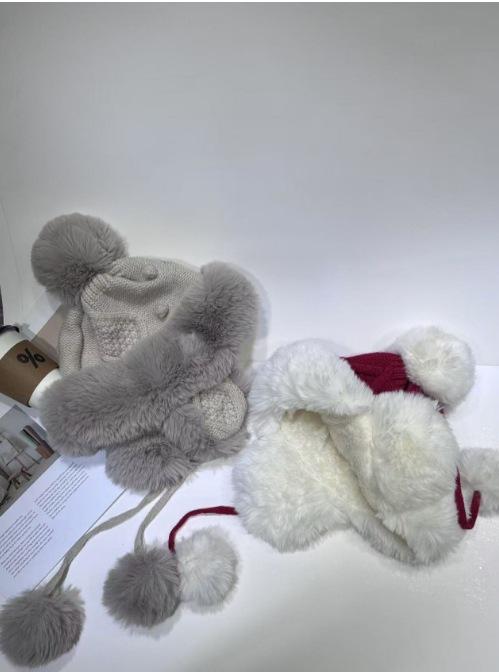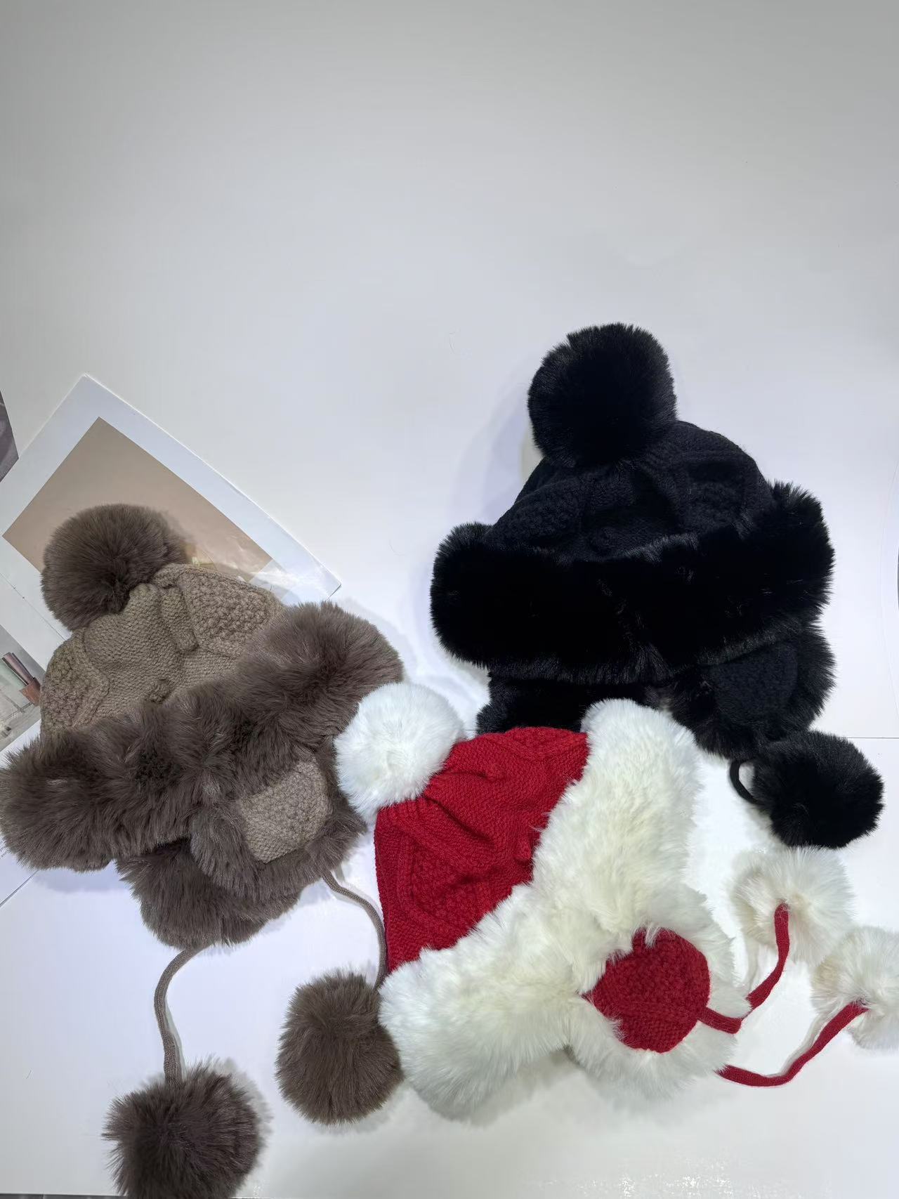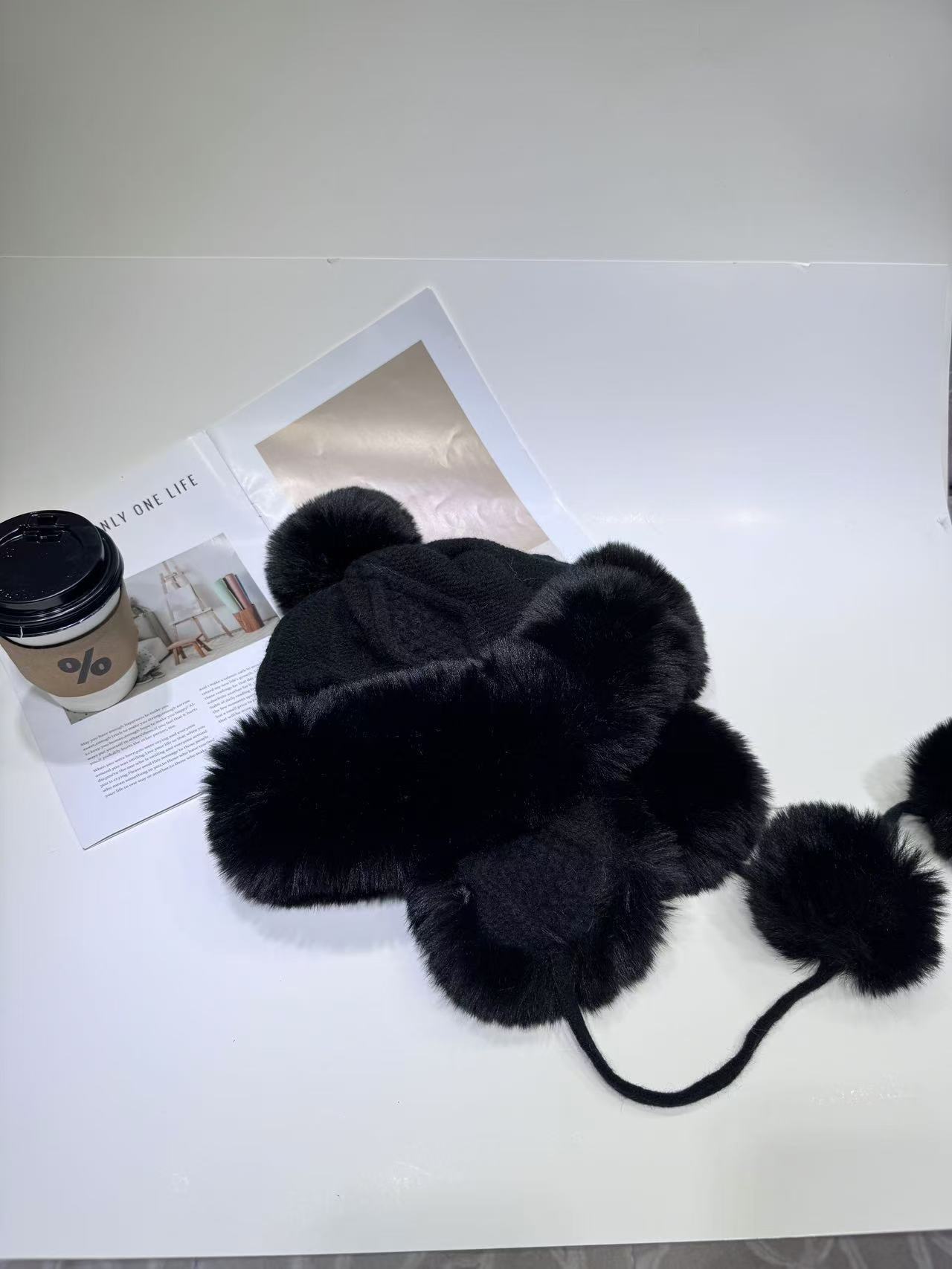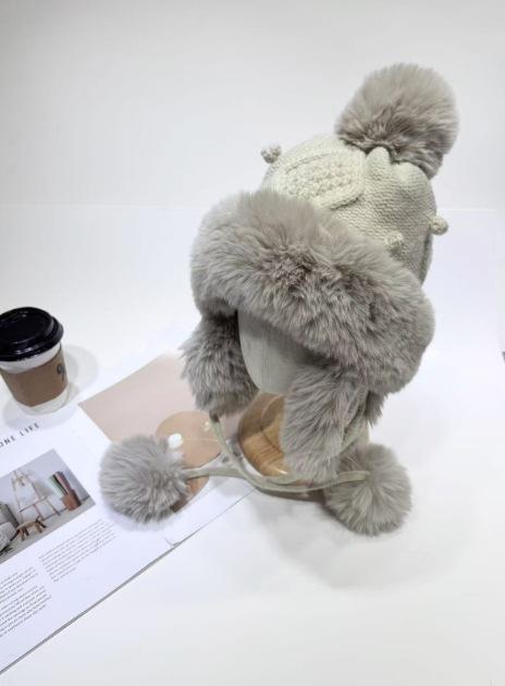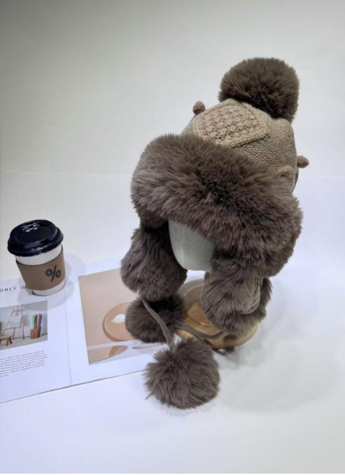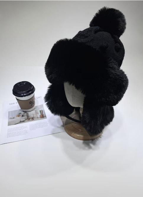 Chapéu de pelúcia Lei Feng feminino inverno forrado de lã engrossado quente bola de pelo chapéu de malha ciclismo à prova de vento frio proteção para orelhas chapéu de lã