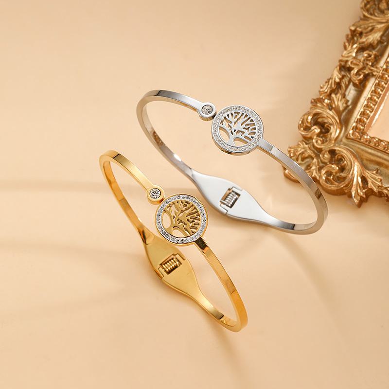 Versão coreana de nicho ins aço titânio banhado a ouro 18K bracelete aço titânio árvore vazada diamante bracelete aberto moda tudo combina