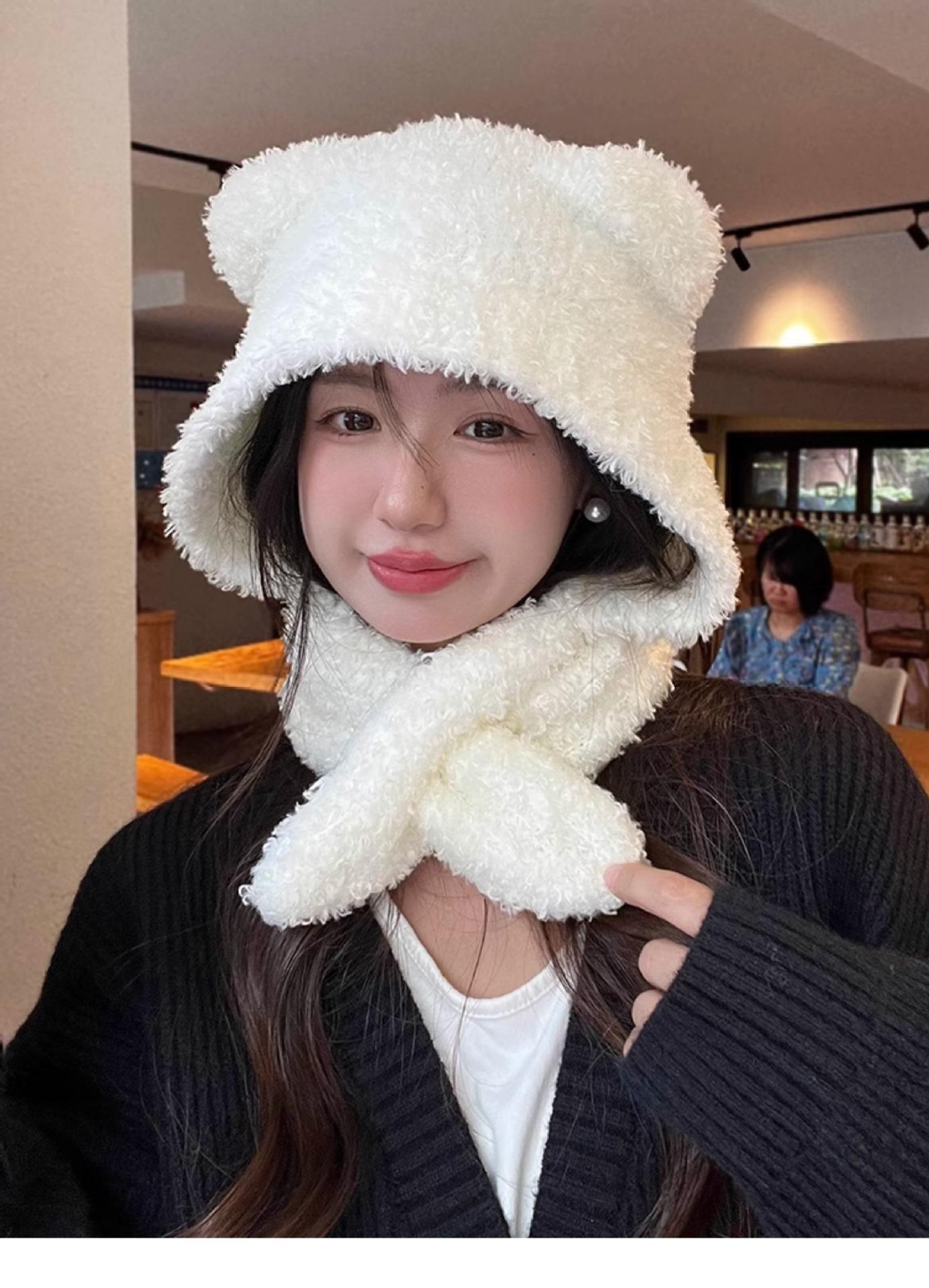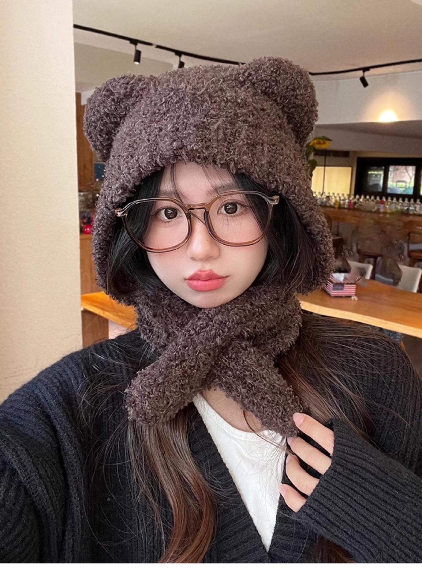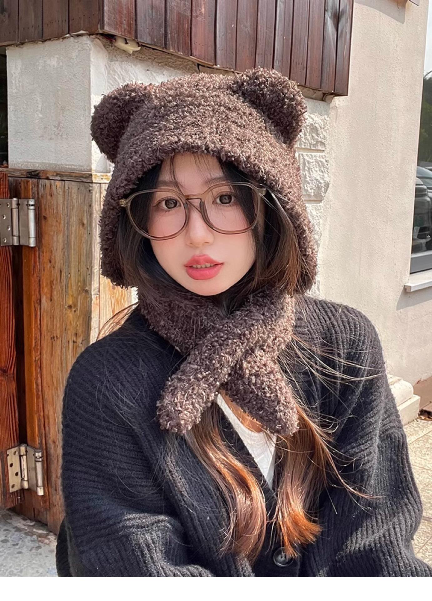 Chapéu cachecol conjunto de duas peças pelúcia urso orelhas malha lã chapéu outono e inverno proteção quente orelha Lei Feng chapéu para mulheres