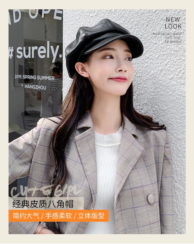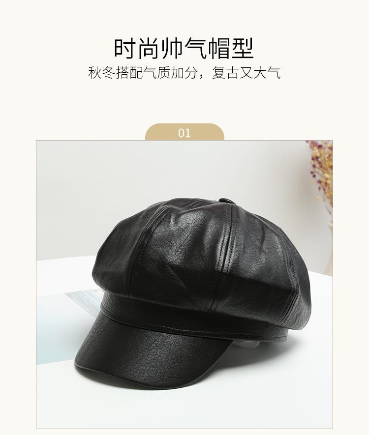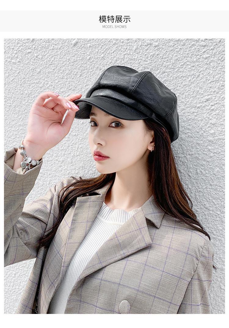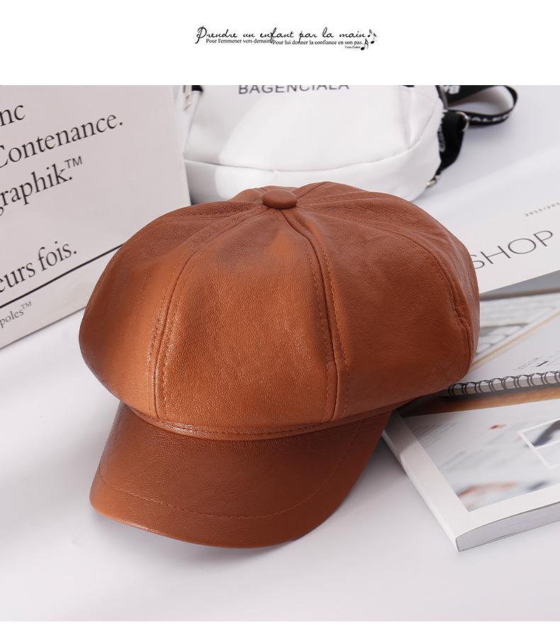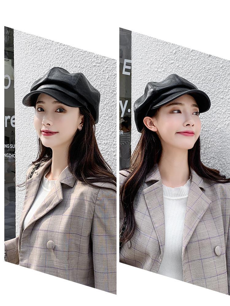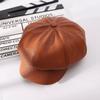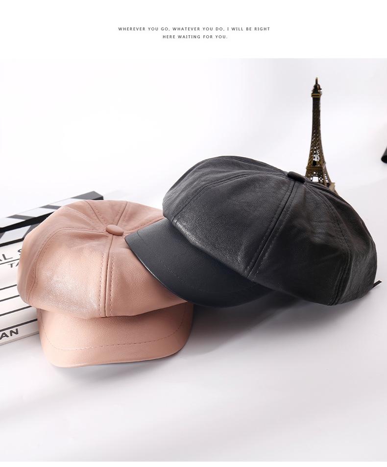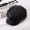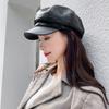 Chapéu Octogonal de Couro PU Preto para Mulheres, Chapéu de Couro Versátil da Moda Tendência Outono e Inverno, Chapéu de Pintor, Boné de Beisebol, Boina