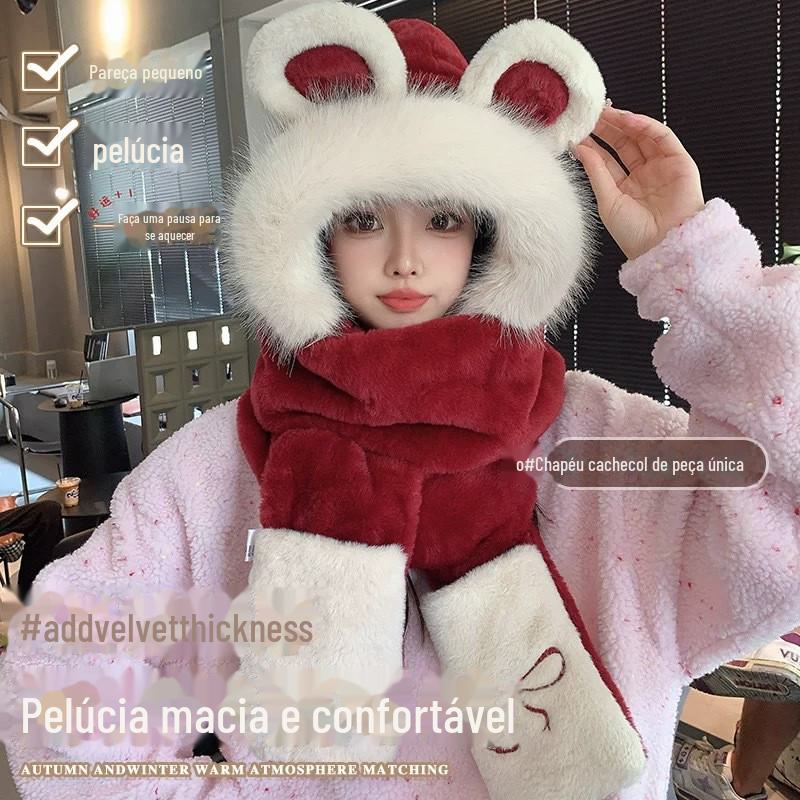 Novo arco urso pelúcia cachecol chapéu luvas conjunto de três peças feminino coreano estilo bonito engrossado chapéu quente