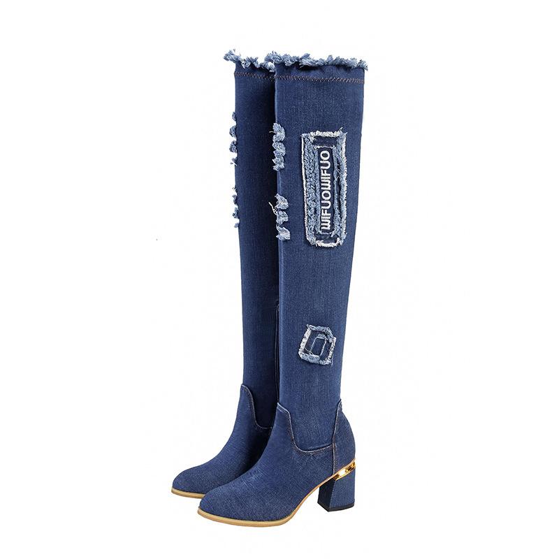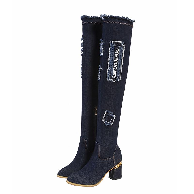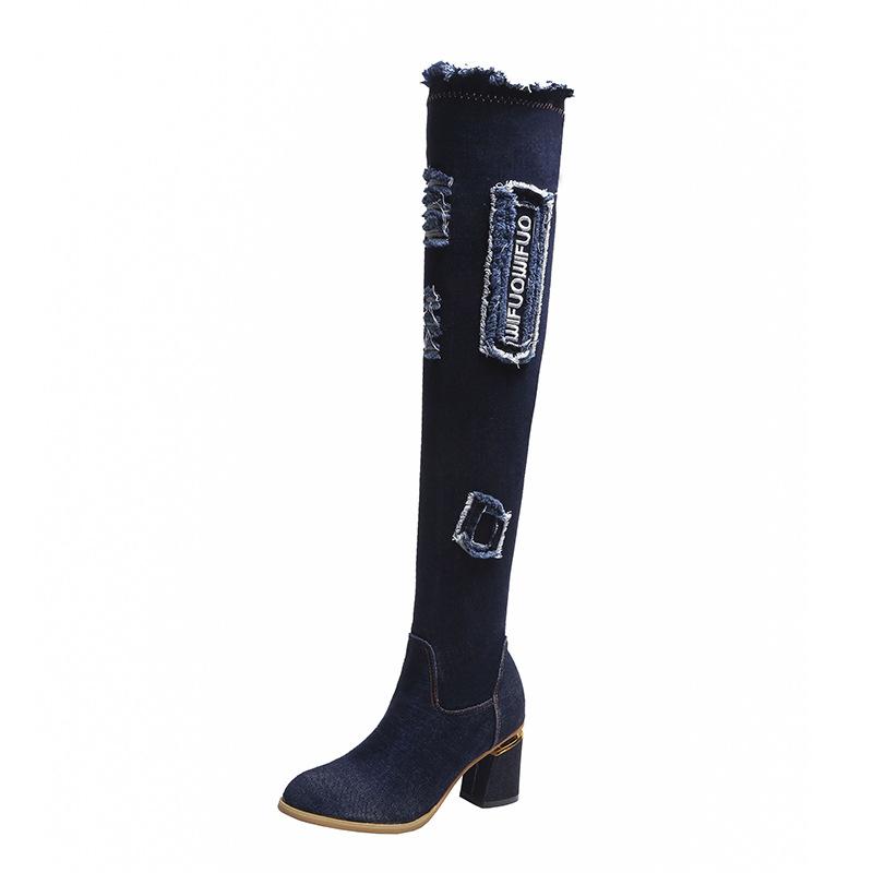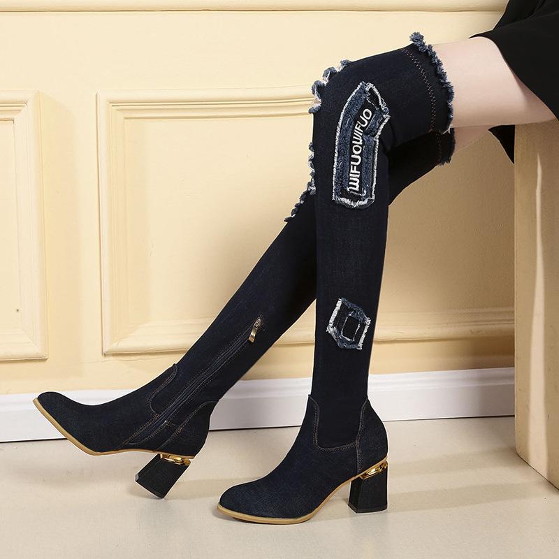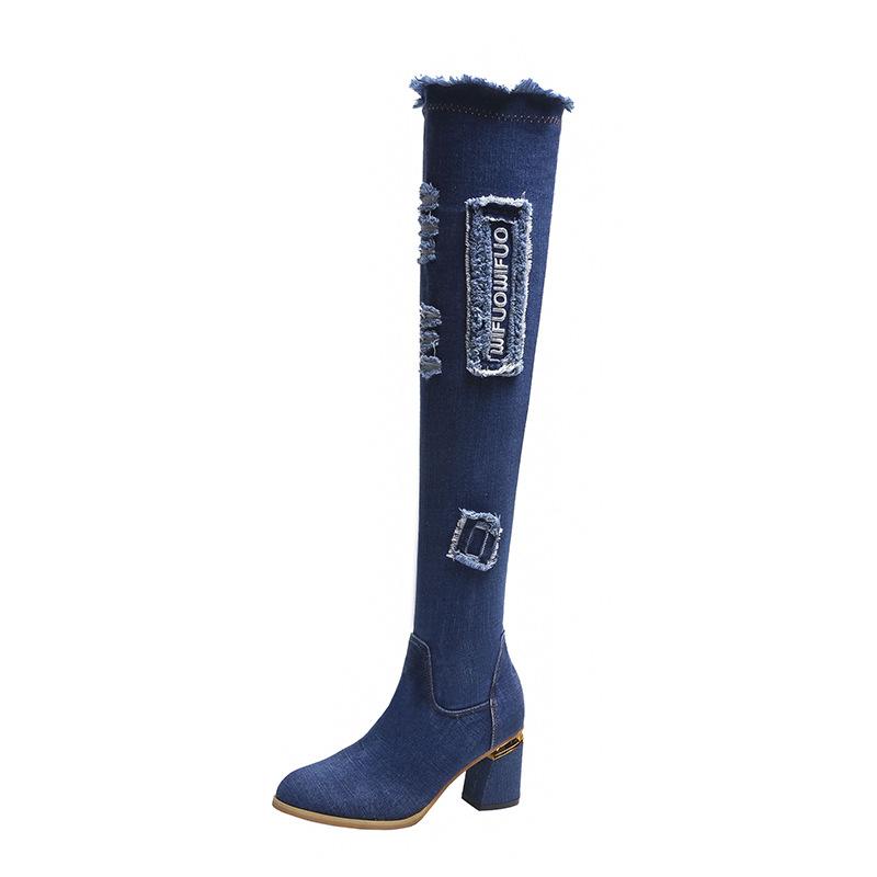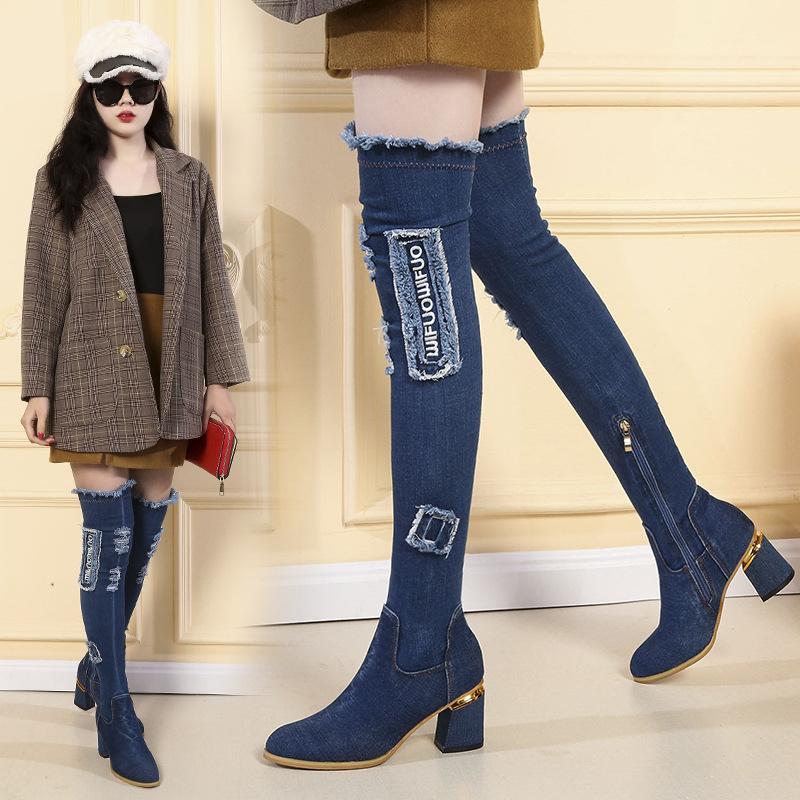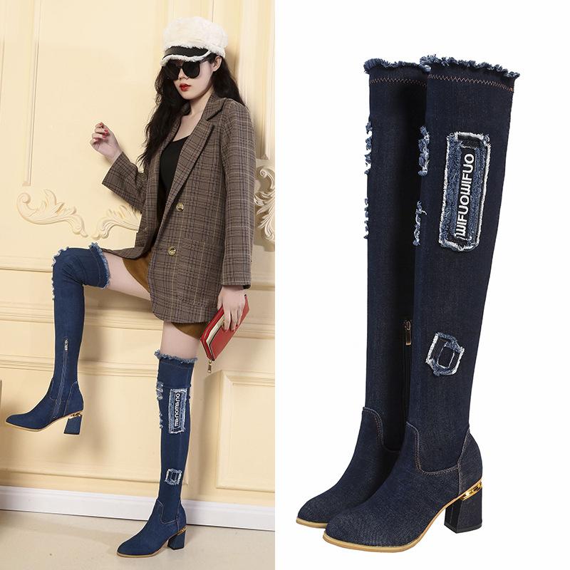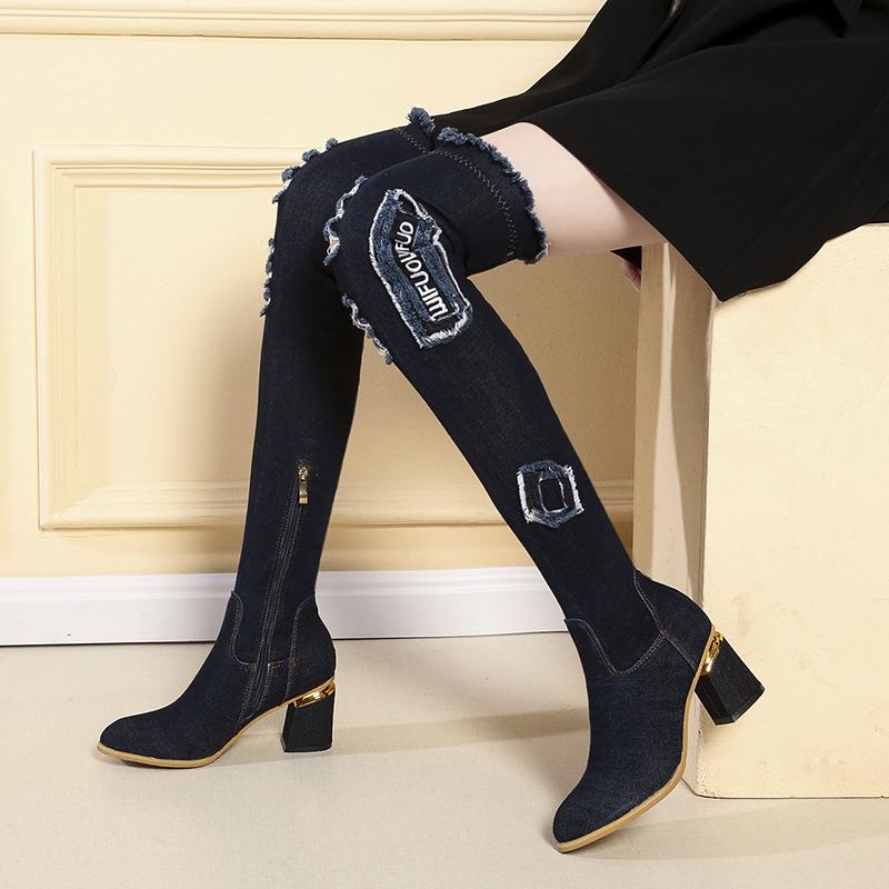 Botas jeans longas de comércio exterior transfronteiriço Botas femininas de tecido elástico, botas femininas elegantes de emagrecimento, salto grosso, salto médio, botas acima do joelho