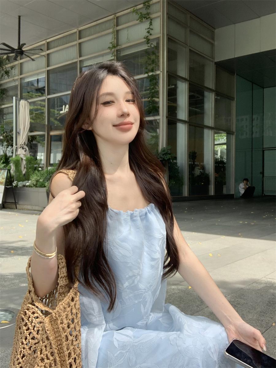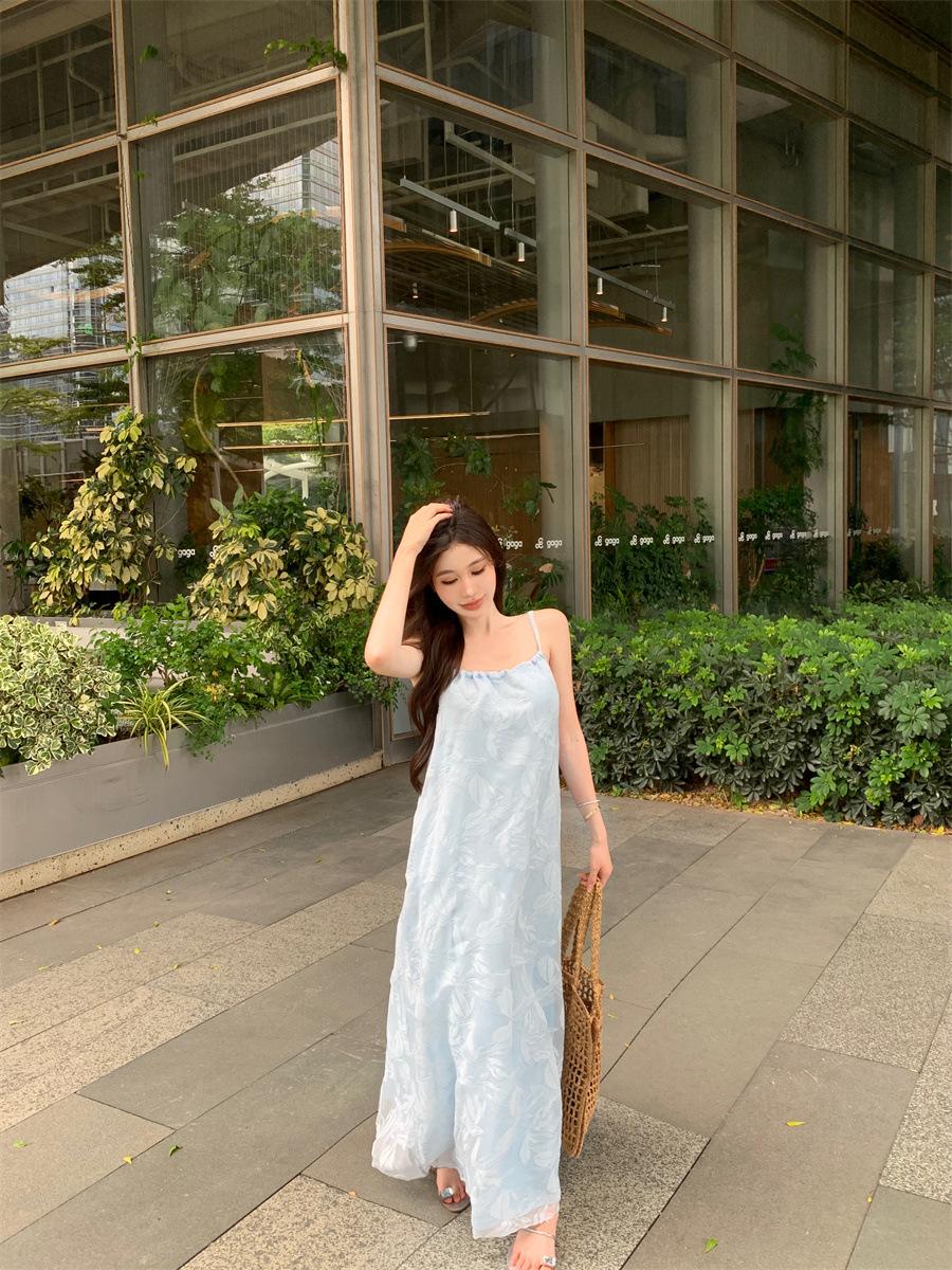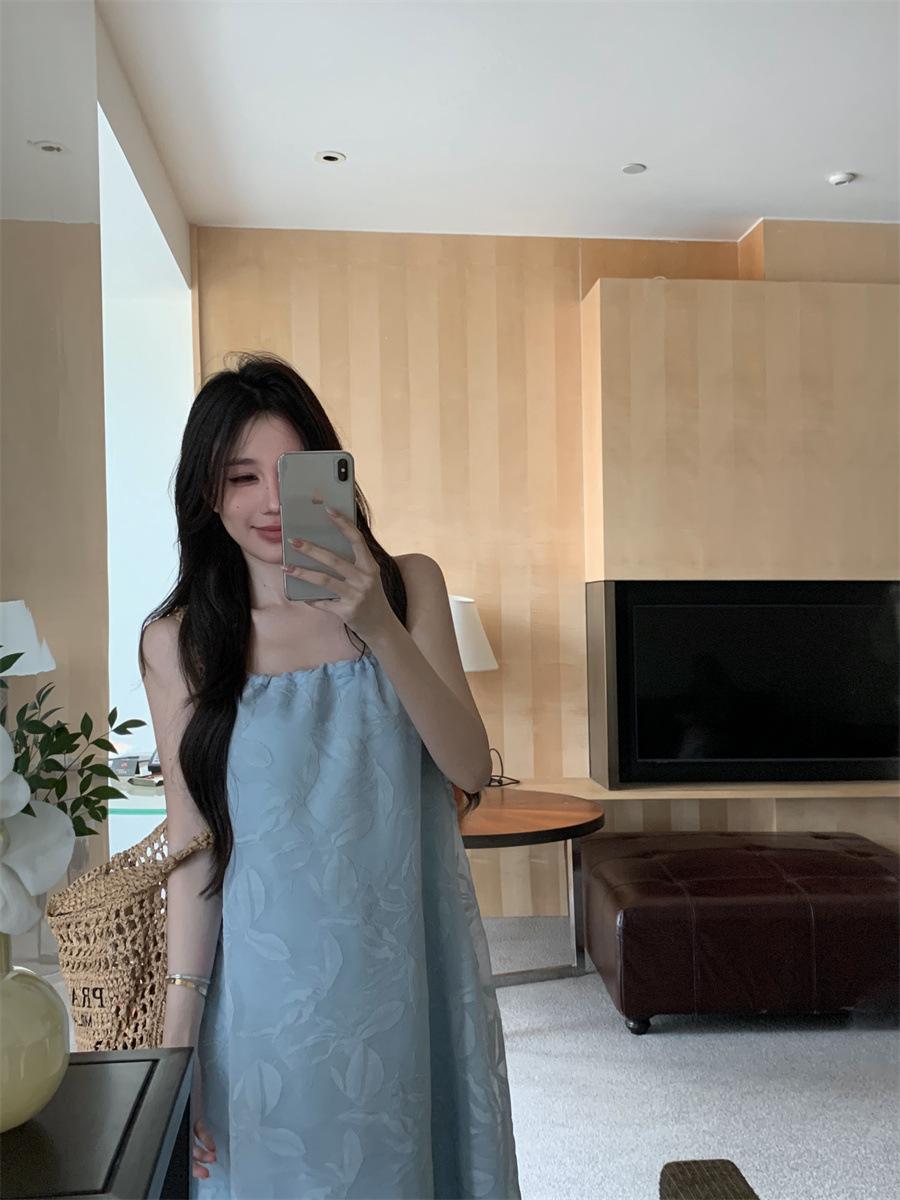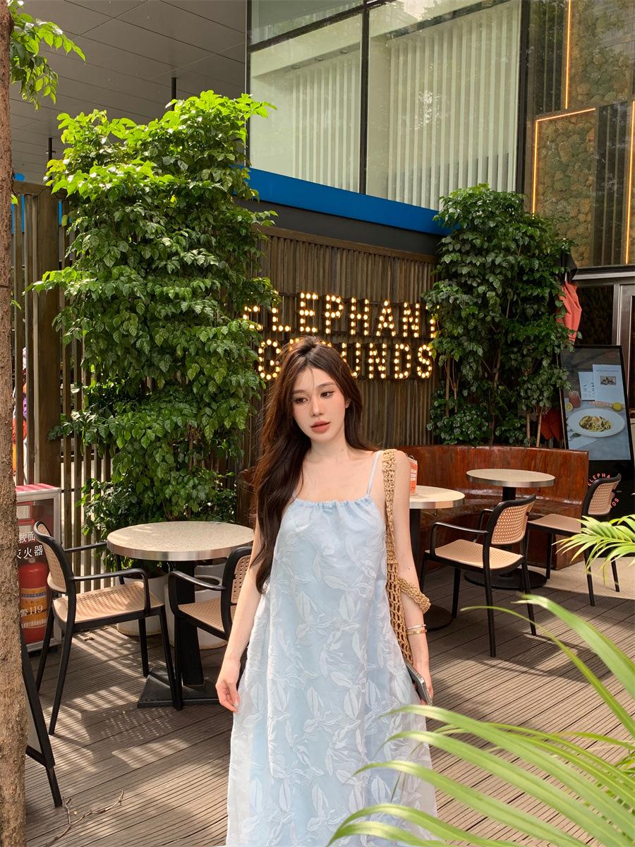 Vestido de Suspensório sem Costas para Mulheres Verão High-End Solto Férias à Beira-Mar Jacquard Francês Primeiro Amor Doce Saia Longa